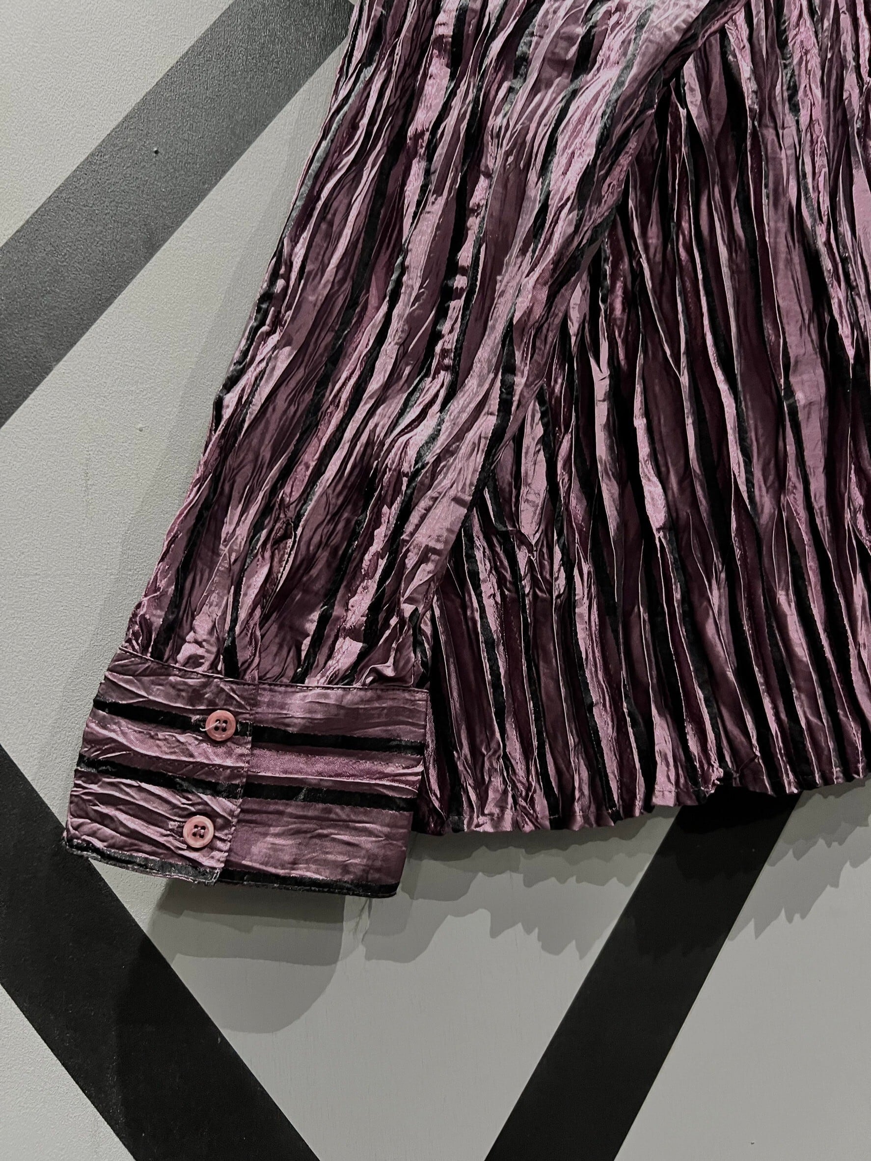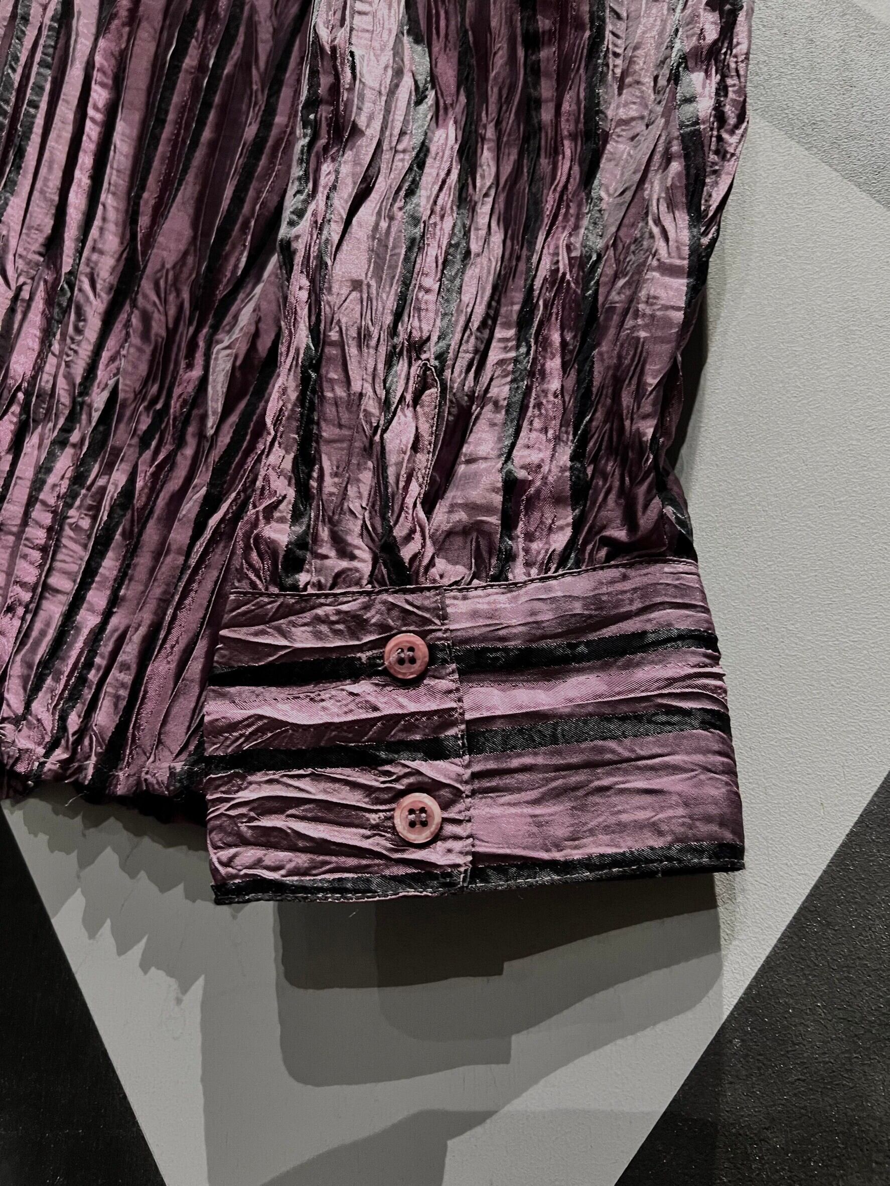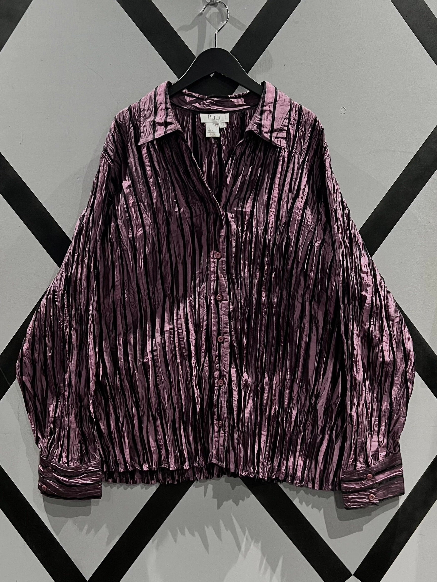 メタリックな光沢を帯びたピンク×ブラックの素材を用いて、シュリンク加工を施した、モードな雰囲気をムンムンに放つオープンカラーのシャツジャケット。