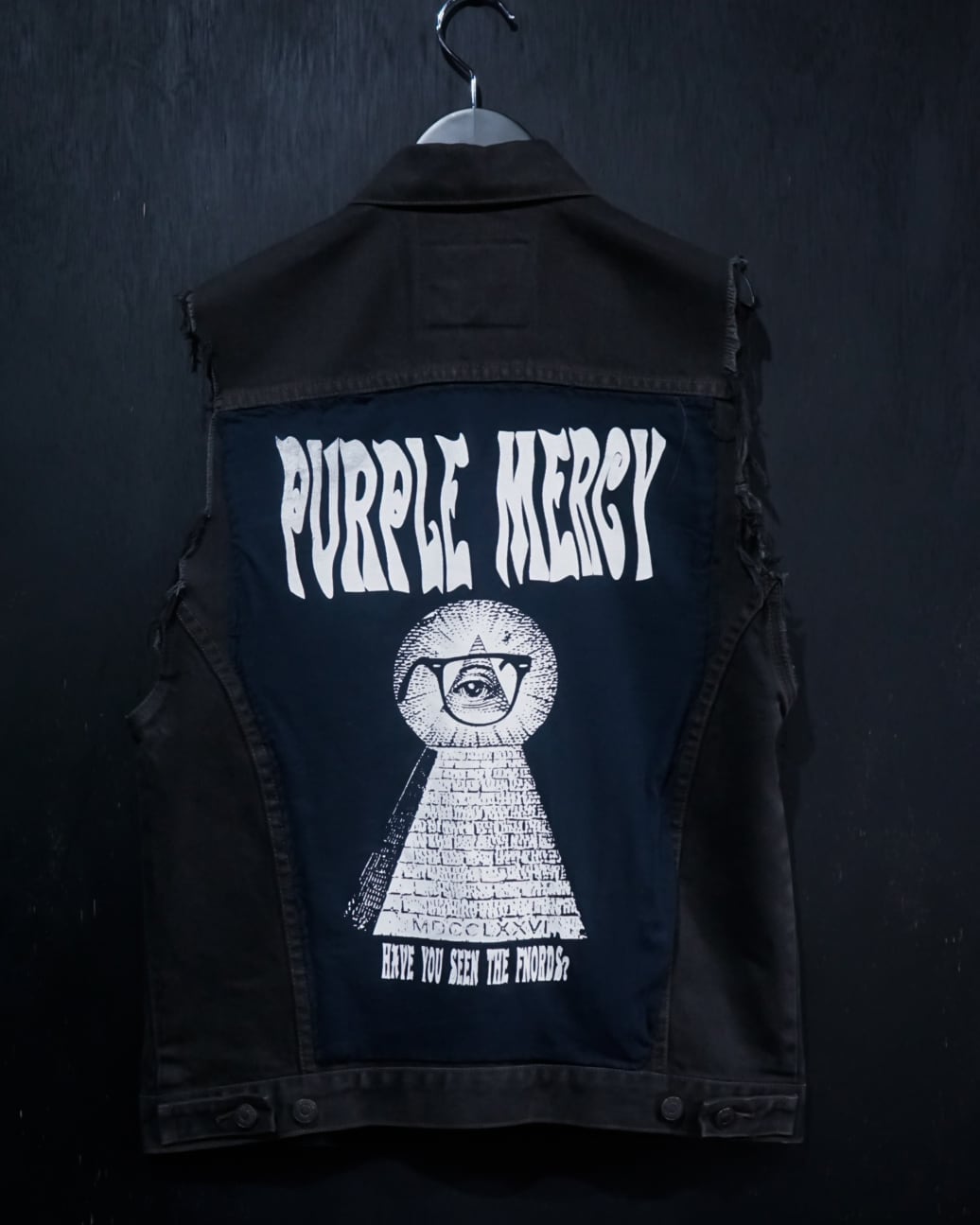 袖を大胆にざっくりとカット、ベストへとリメイクした逸品。左胸には缶バッチ、背面にはフリーメイソン風の生地を切り替え。前所有者の思想が感じられます。