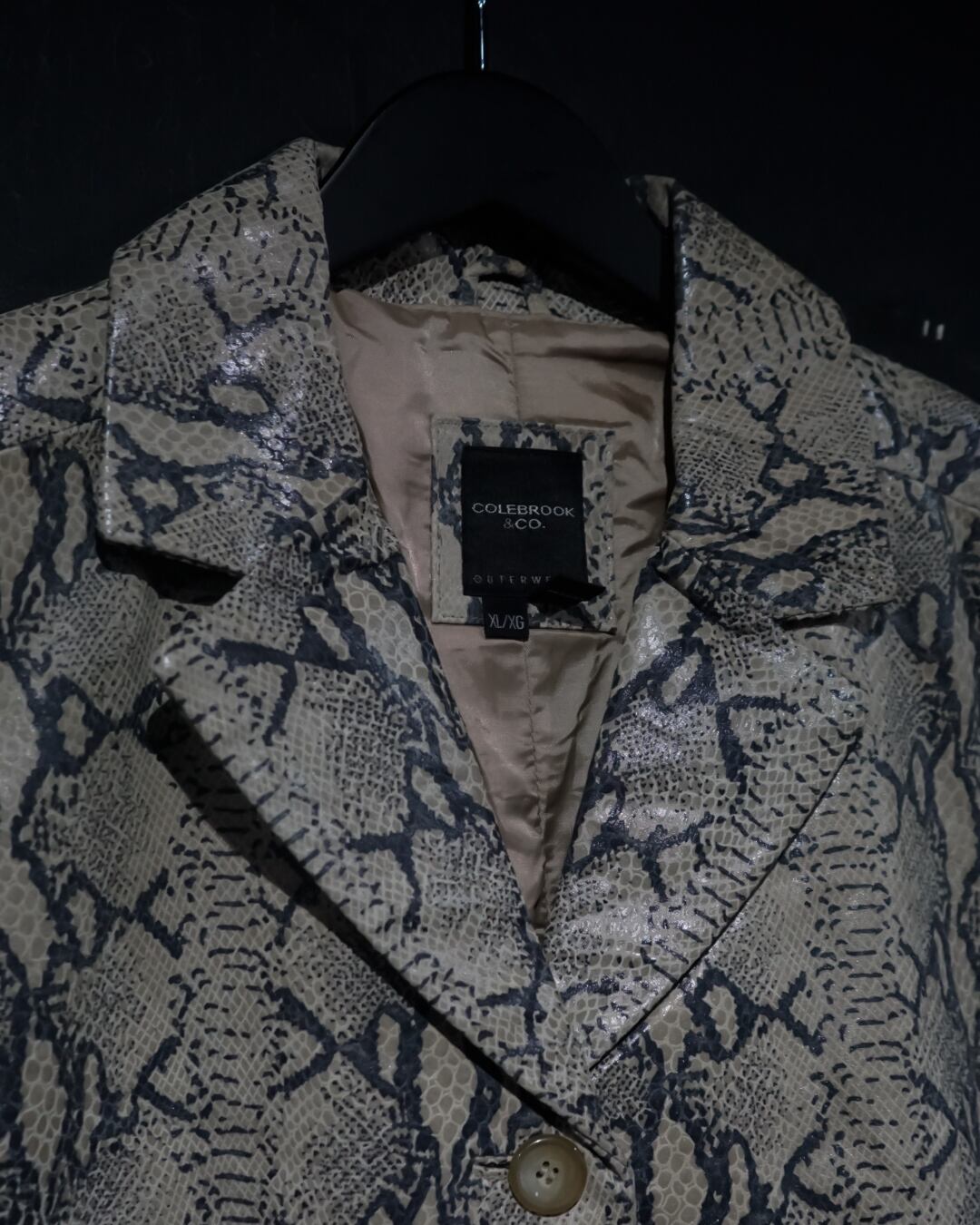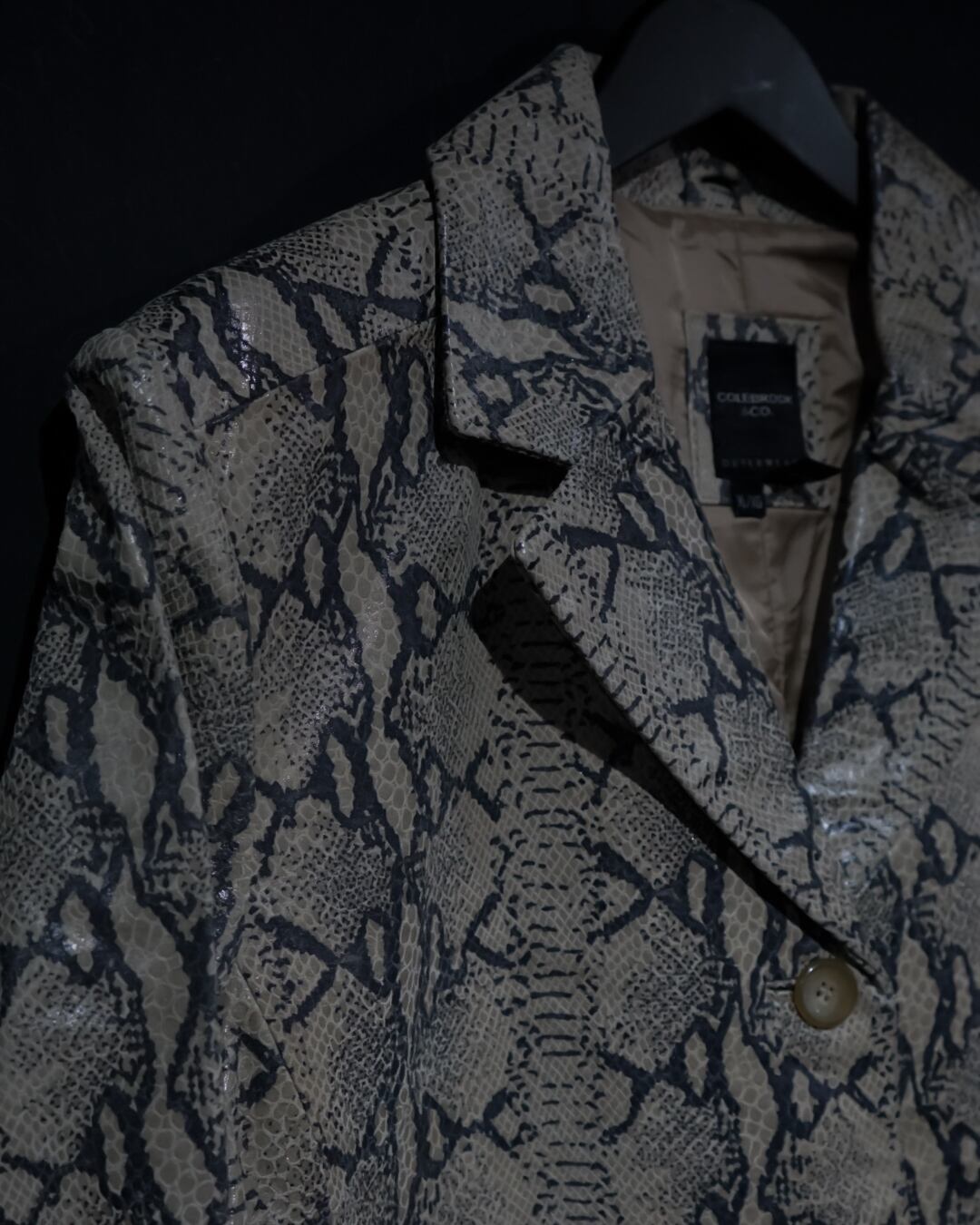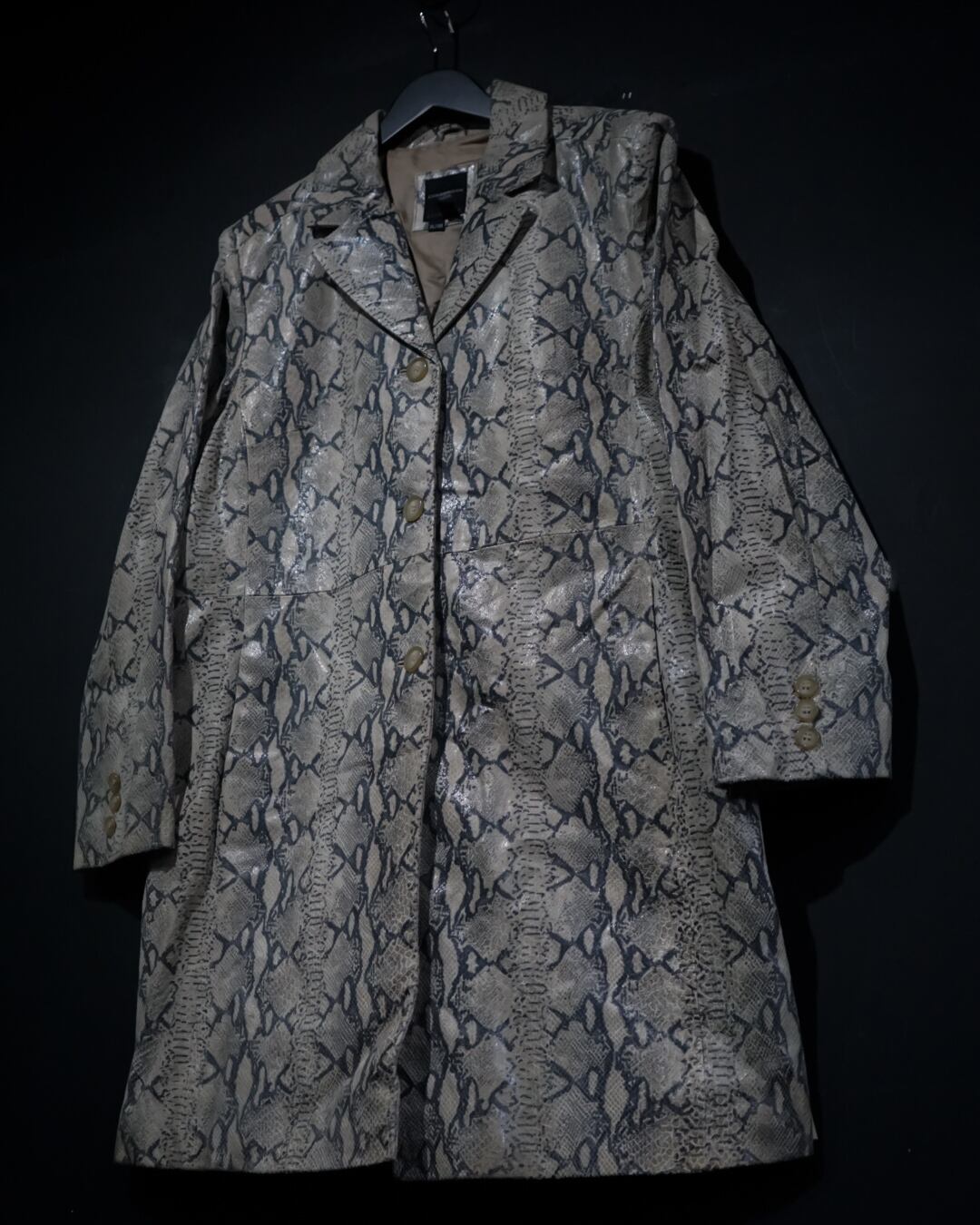 柔らかくしなやかなレザーを用いたボディにリアルに表現されたパイソン柄を載せた、レザーのチェスターコート。