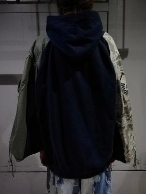 当店が誇る至極のOriginal Remakeシリーズより、ヴィンテージのスウェットにミリタリーブルゾンのパーツを乱雑に切り替えた、特異なスウェットが入荷。
