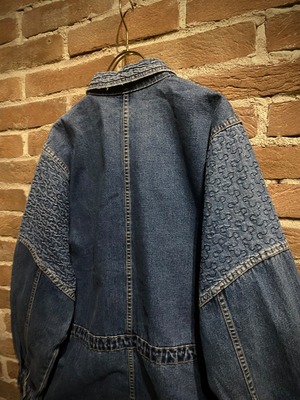 インディゴブルーのデニムボディに、襟、左肩、フラップにはシュリンク加工を、右肩にはジグソーパズルのような刺繍を刻んだデニムジャケット。