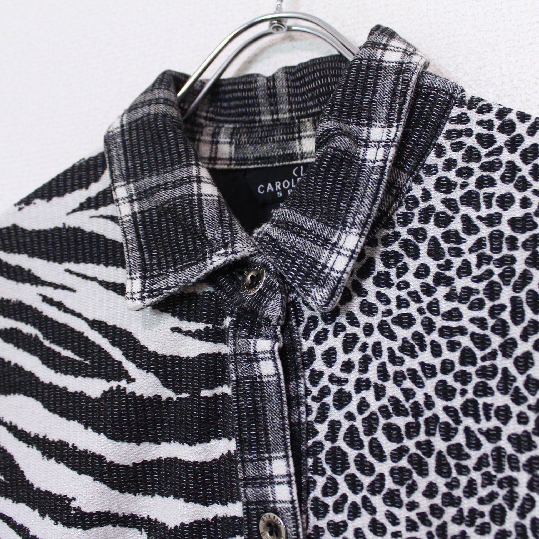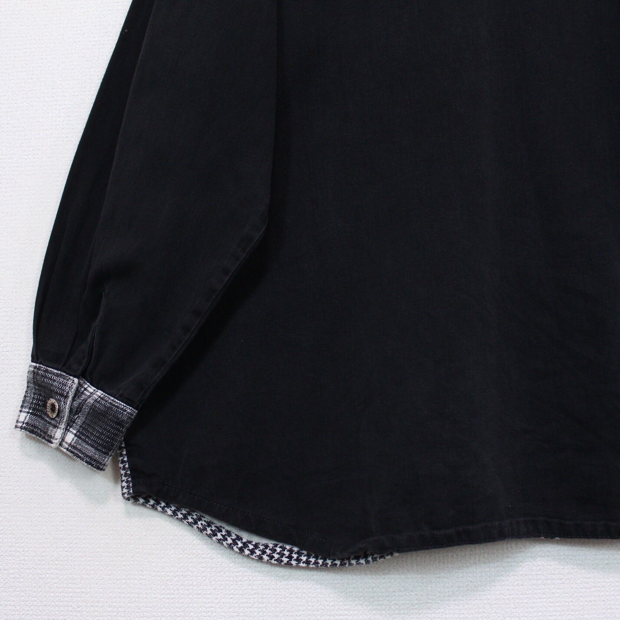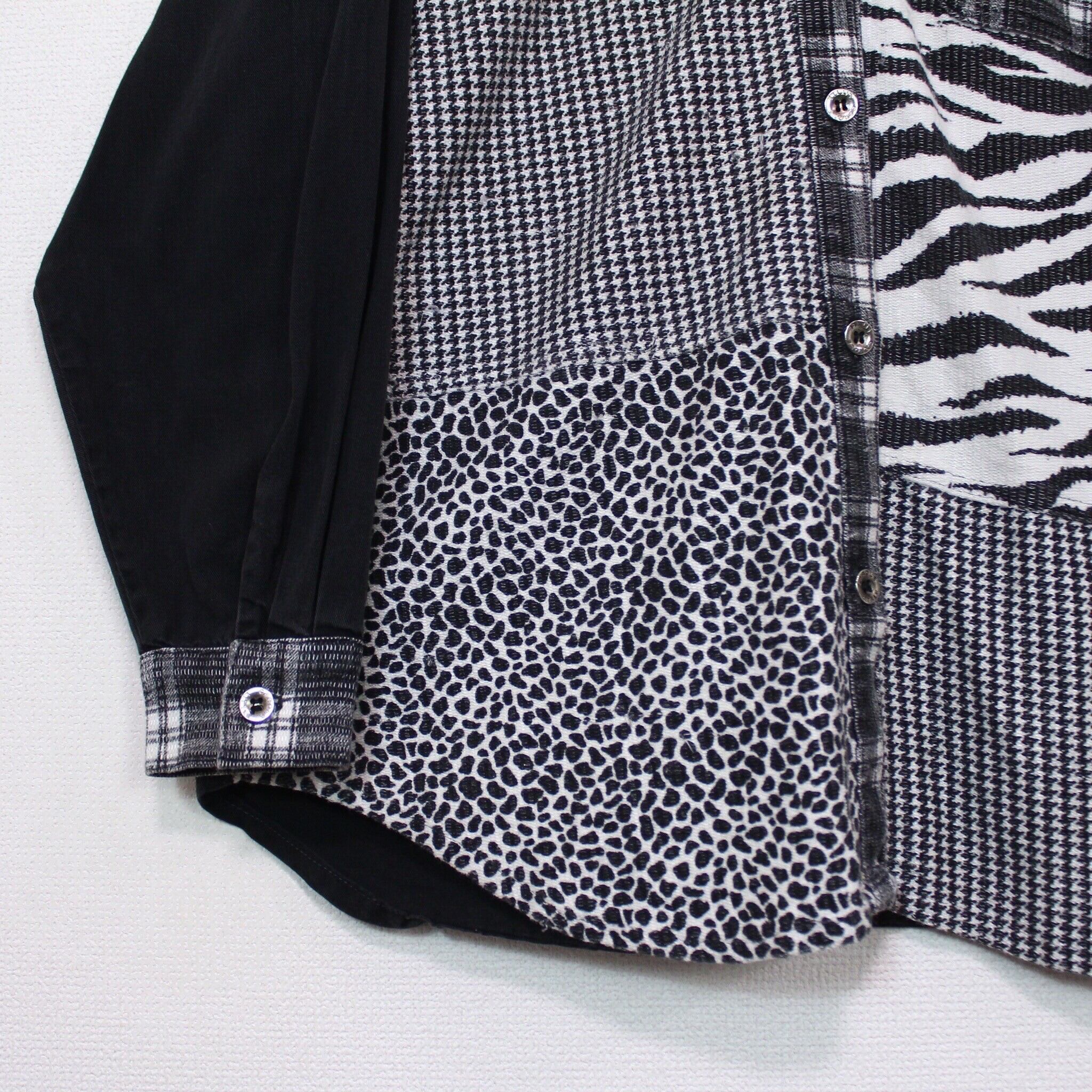 コシのあるブラックのボディをベースに、ゼブラ、レオパード、チェック、千鳥格子など様々な柄模様をパッチワーク風に切り替えた長袖シャツ。