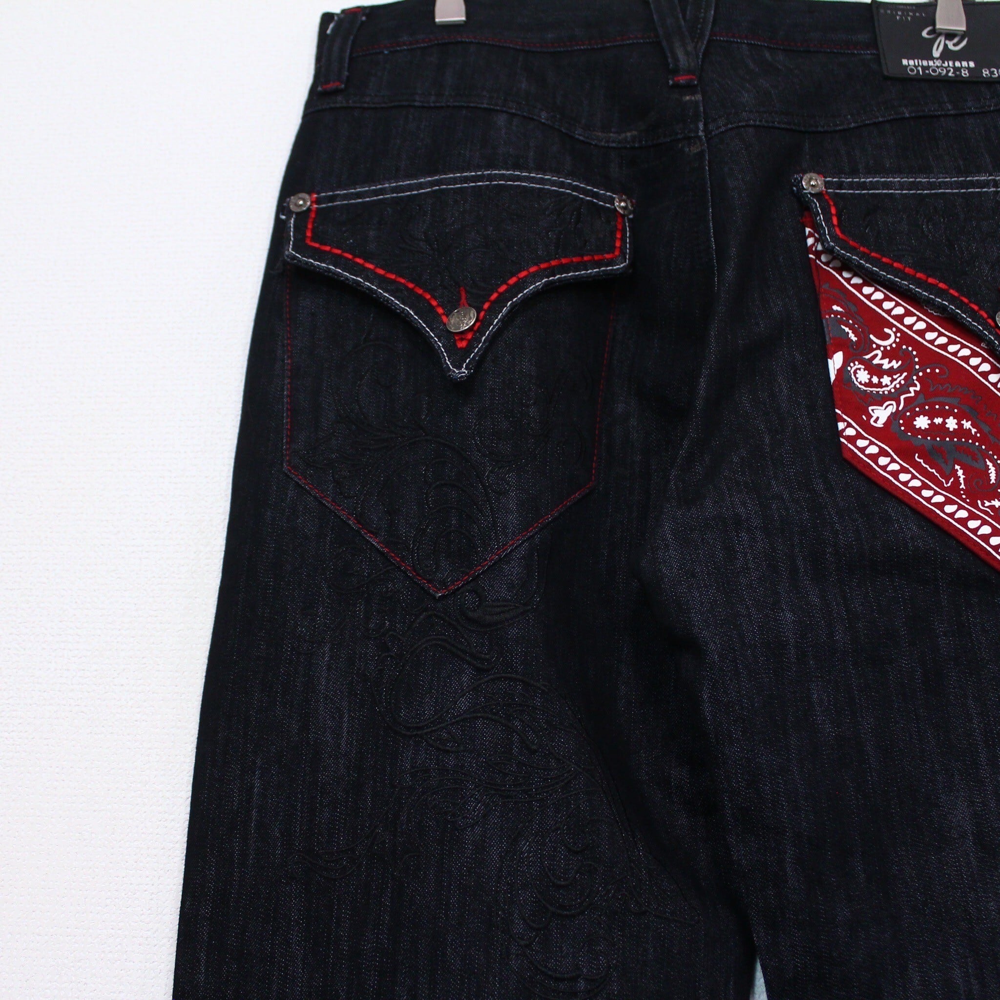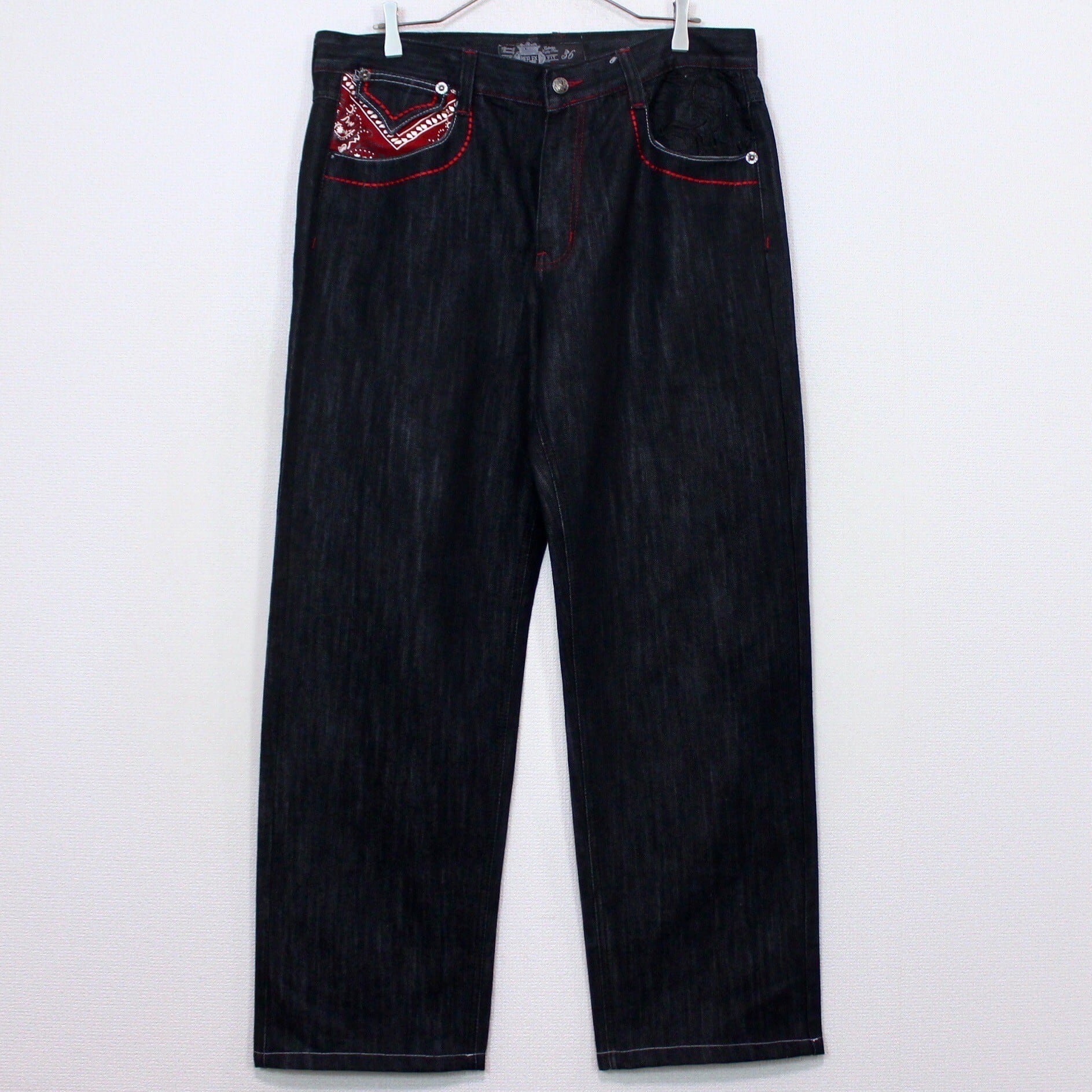 色残りがしっかりとあるブラックのボディに、バックポケット、フロント右ポケットにバンダナ柄を切り替えた、ストリート感漂うデザイン超イケてるバギーデニムパンツ。