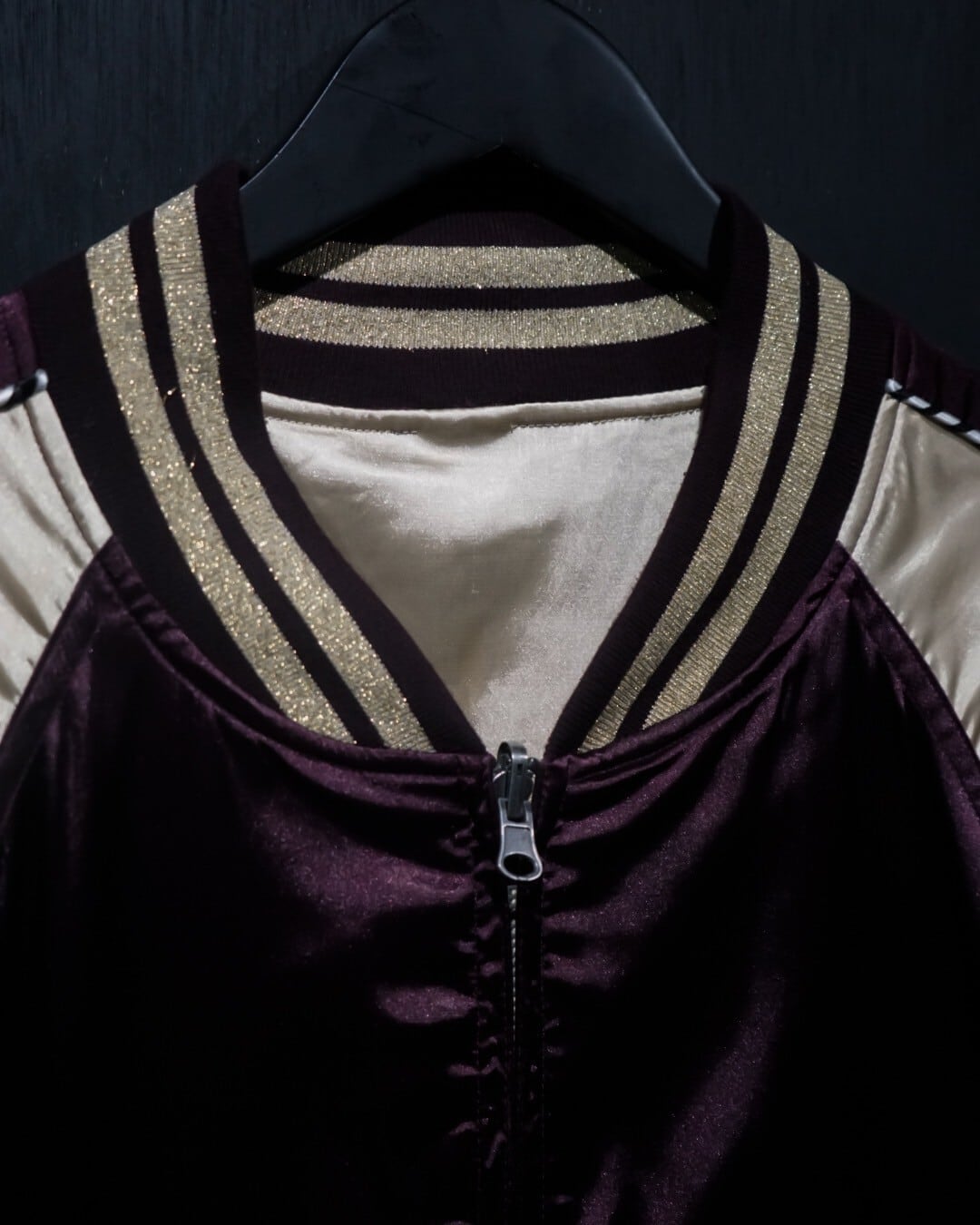 光沢を帯びた、紫とベージュのボディ、ガバッとひっくり返すと同素材でベージュのみに変わるリバーシブルのブルゾンジャケットをご紹介いたします。