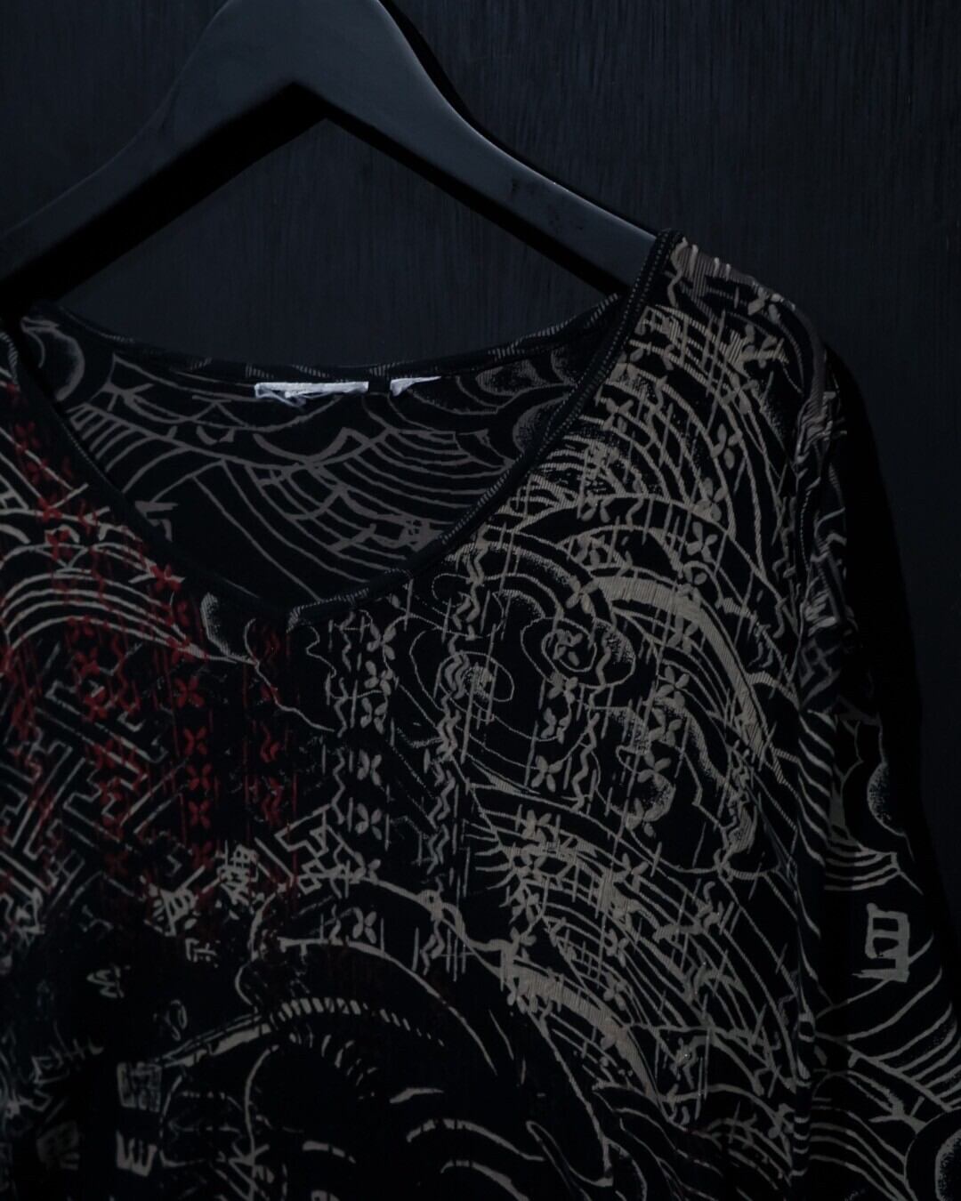 ヴィンテージにおいて良いデザインのロンTは少ない。その中でも稀有な和デザインの1着で、古着だけで無くブランドとのハマりも良い逸品です。