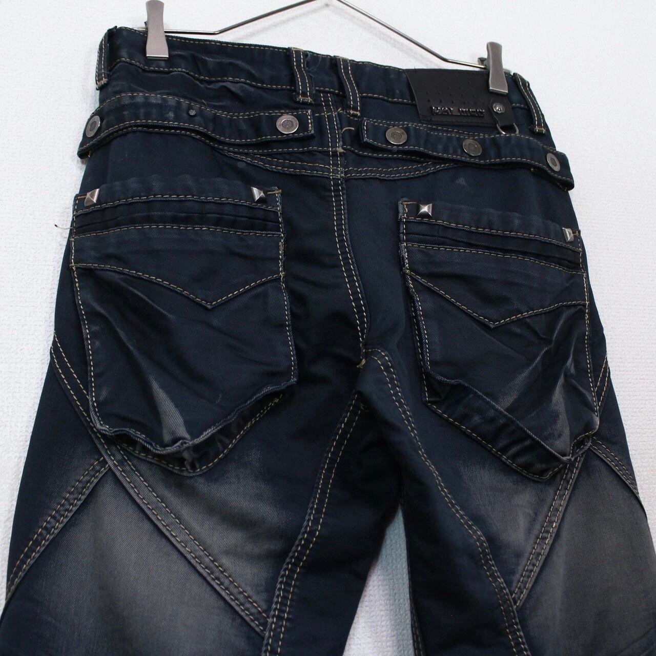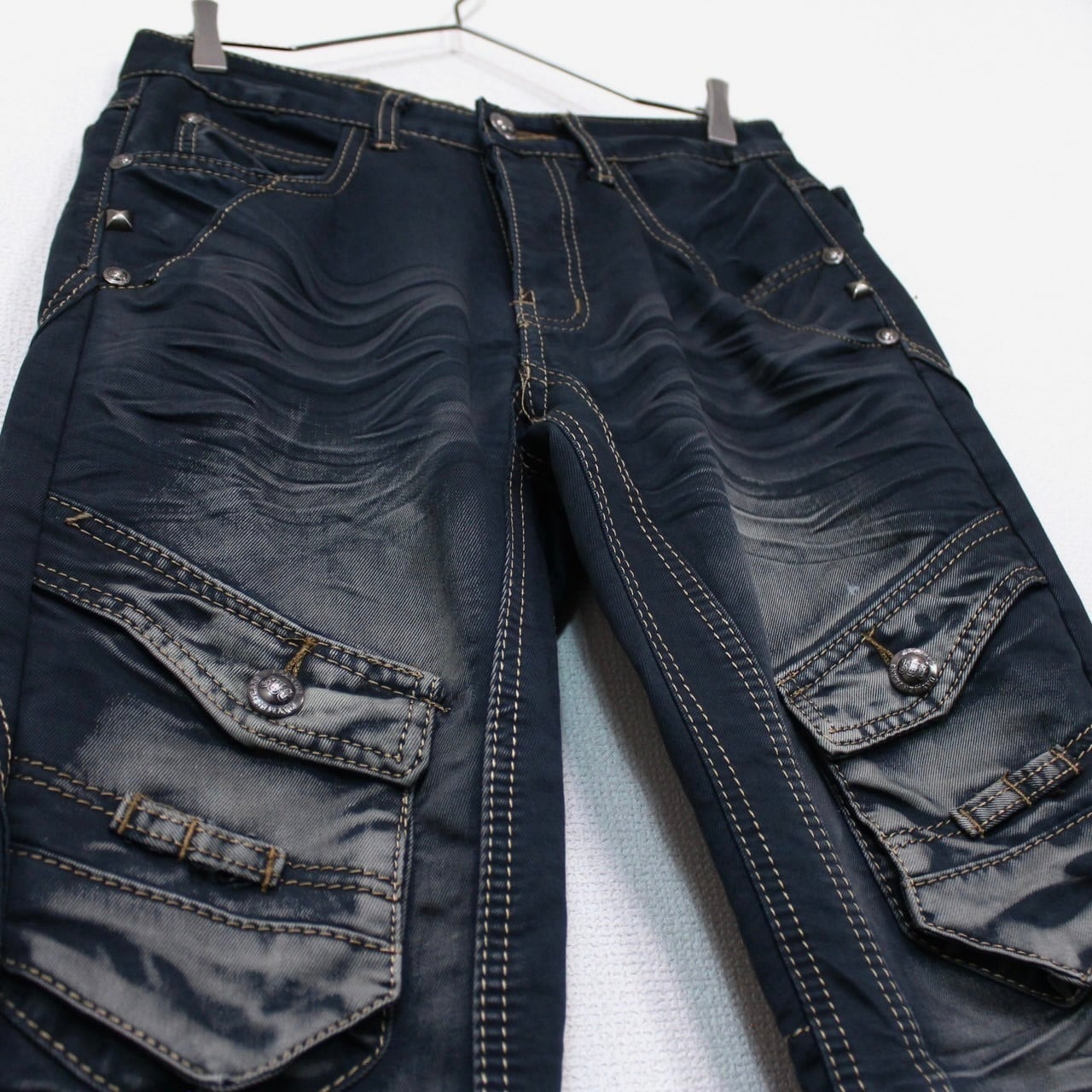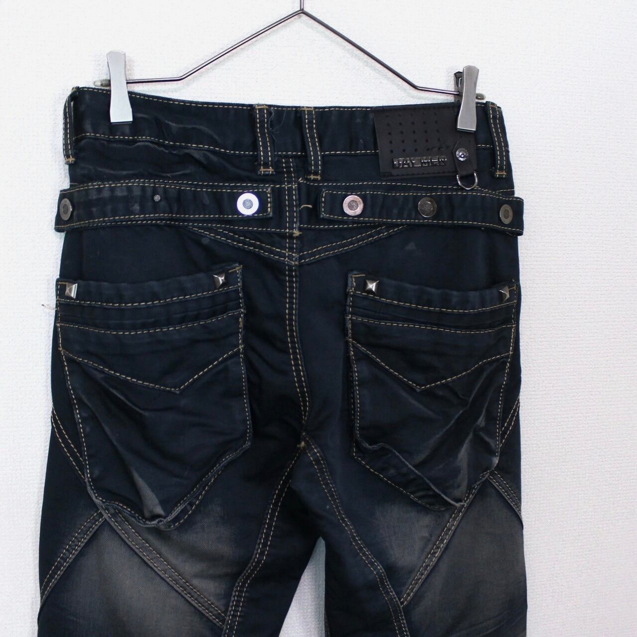 グラデーションの美しいフェード加工が施されブラックのボディに、フロントと背面にマチ付きのポケット、ベルトのギミックを載せたインパクト大ストレートデニムパンツ。