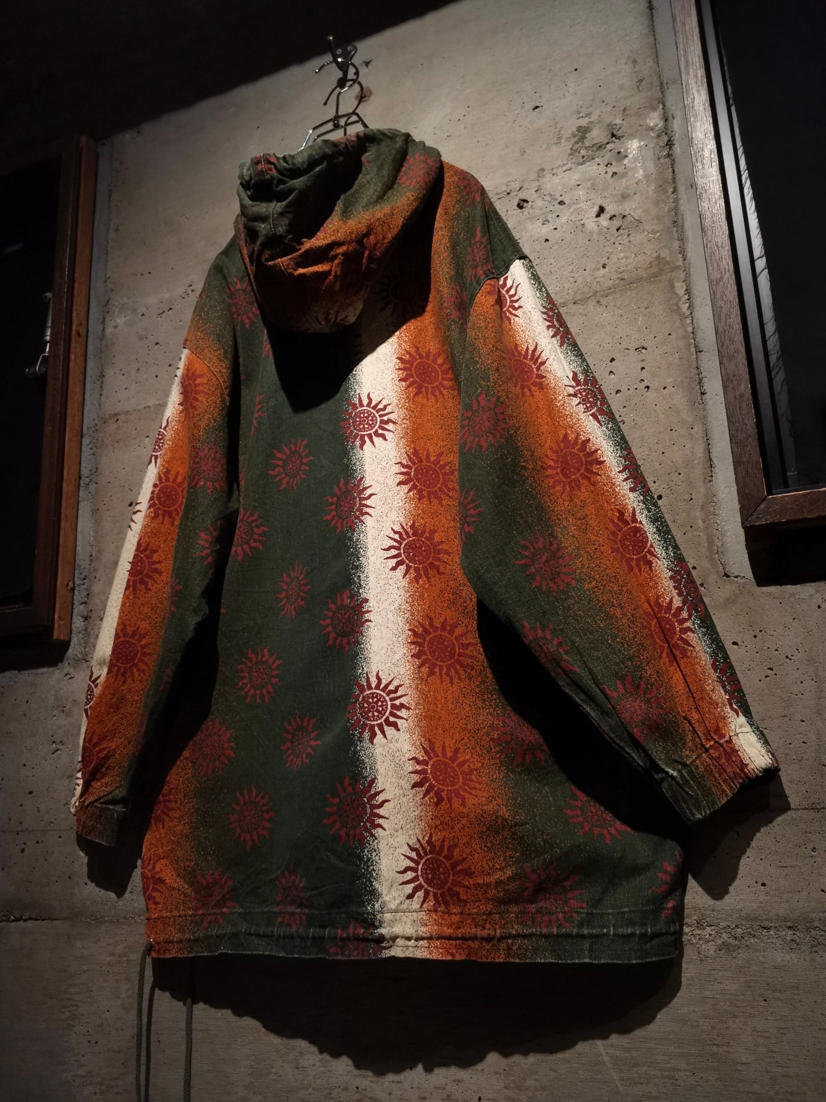 緑、茶、白のグラデーションが美しいボディに、エスニックな雰囲気を感じられる太陽のモチーフを載せたハーフジップ仕様のフーディジャケット。