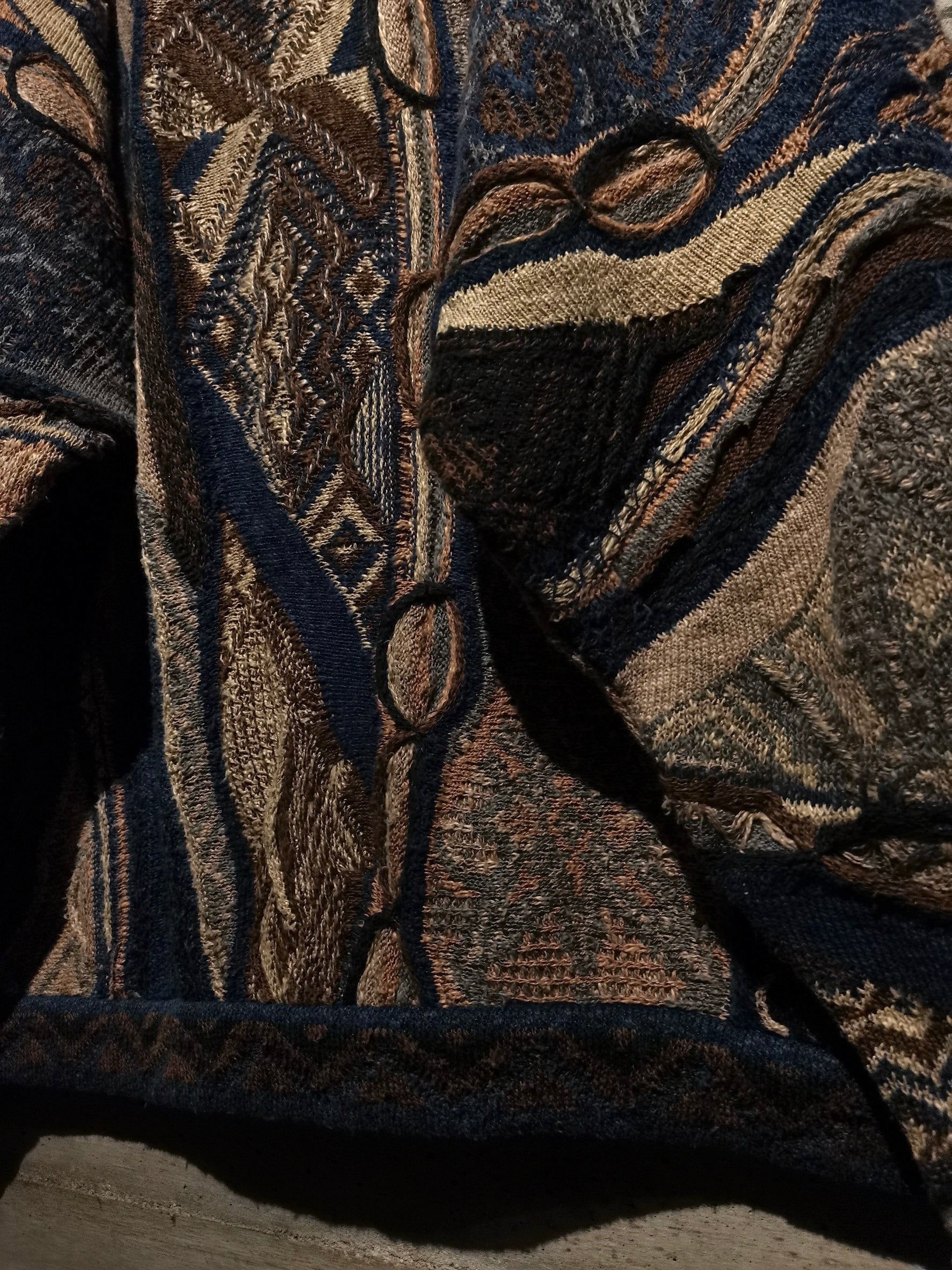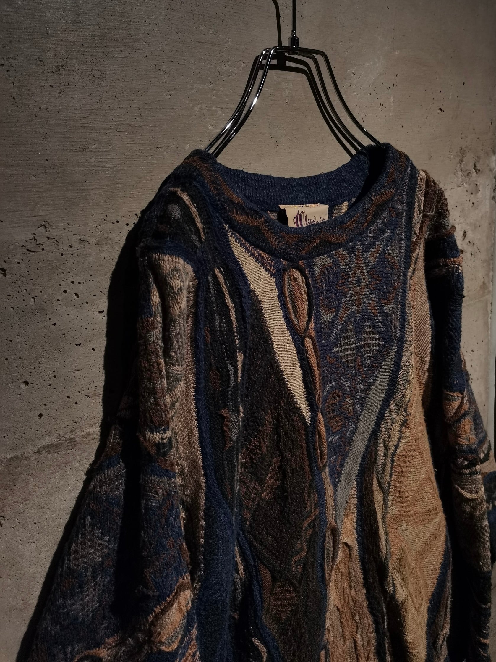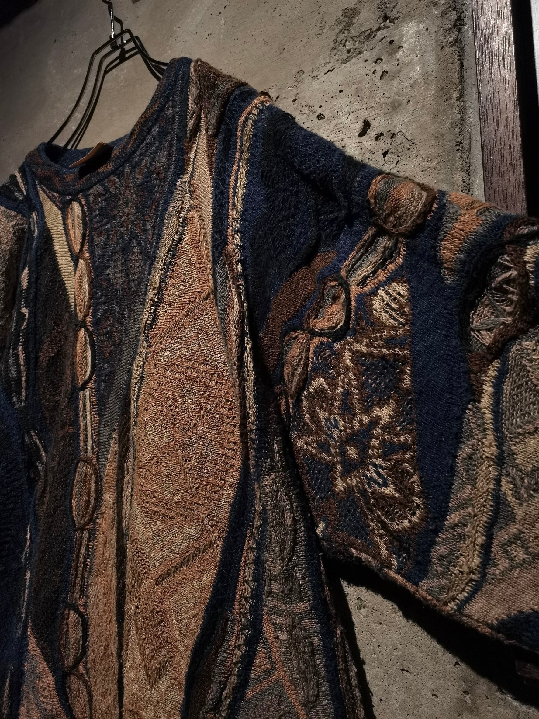 アースカラーをベースに、ネイビーやブラウンなどモダンな雰囲気を漂わせるカラーリングで成された3Dニット。"COOGI"ならではの高い技術による、緻密で繊細なニッティングが光る1着です。