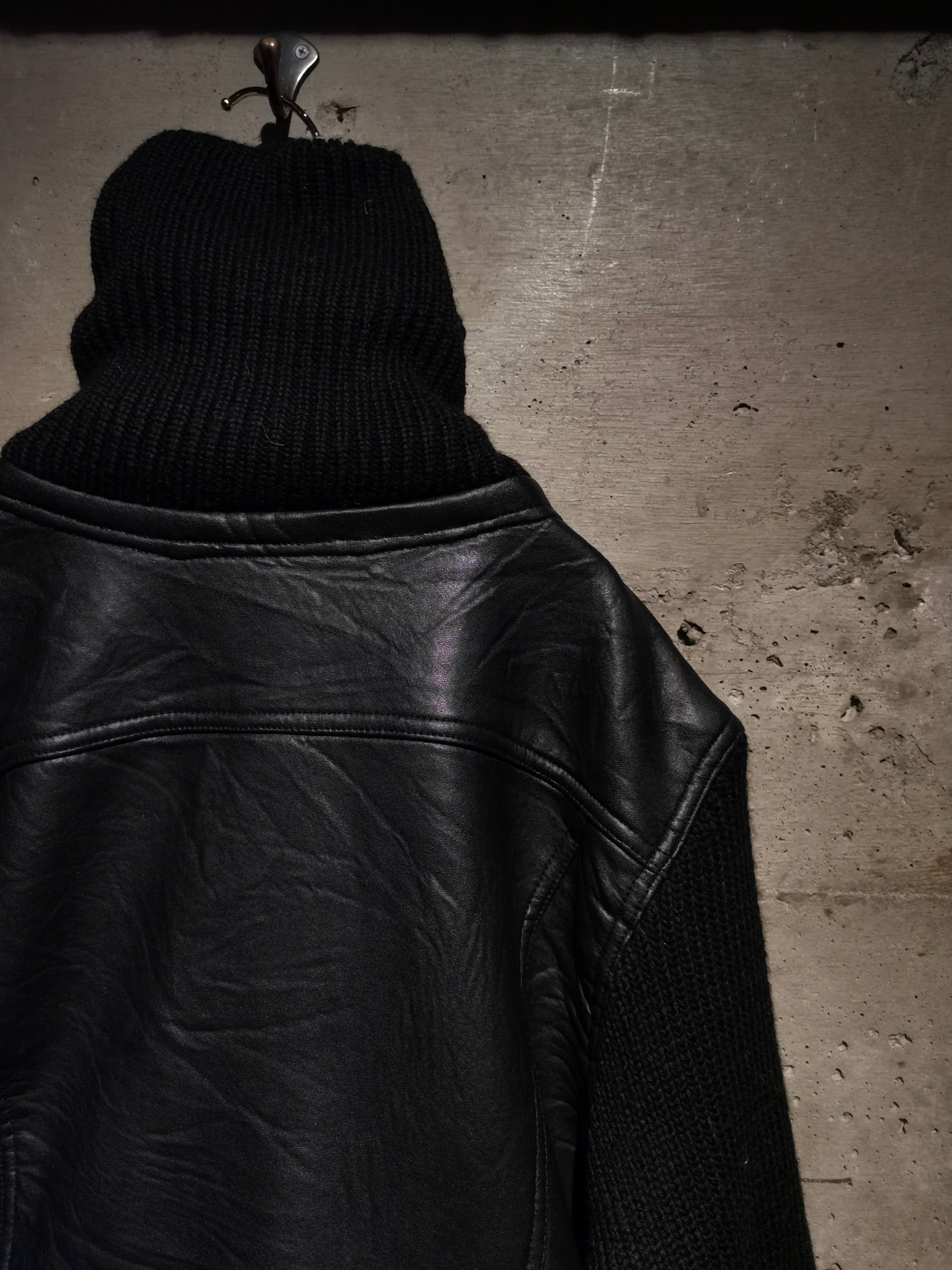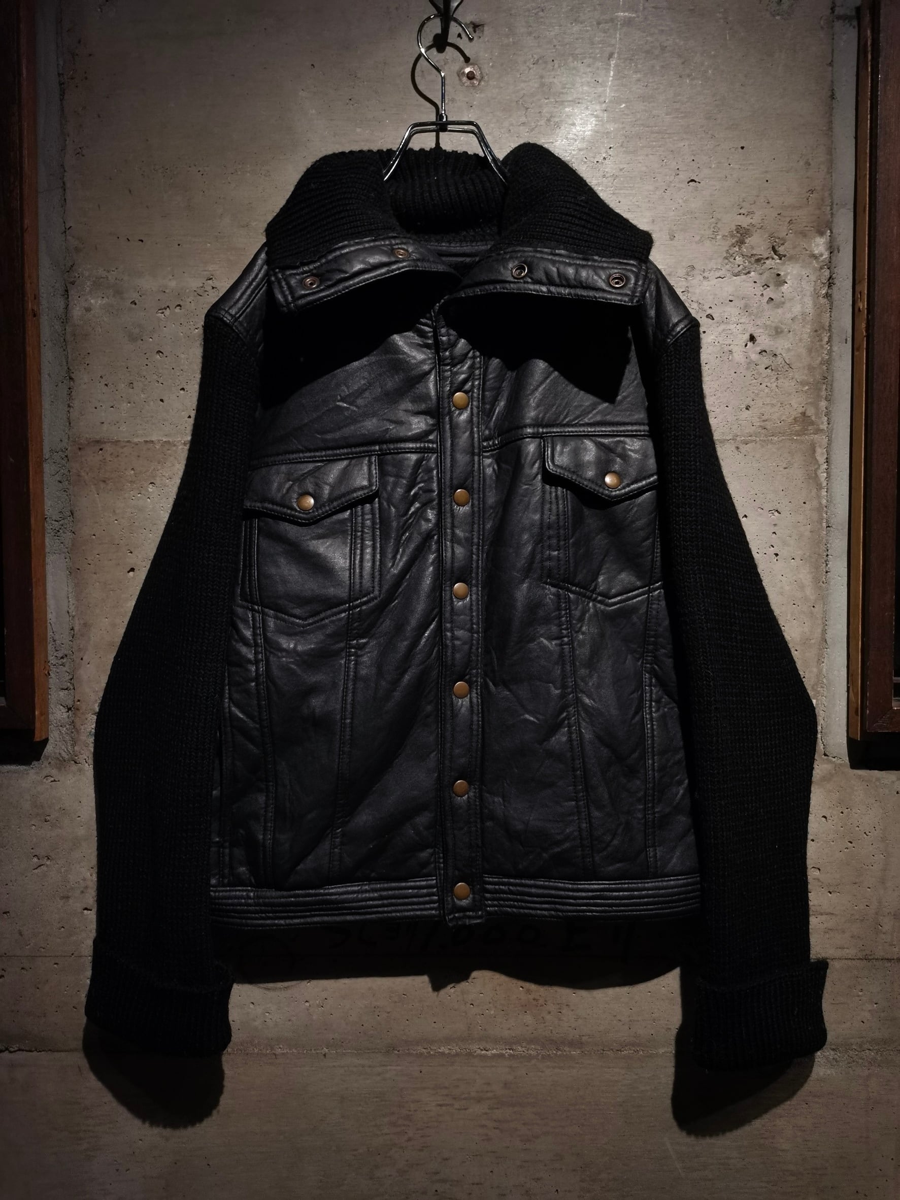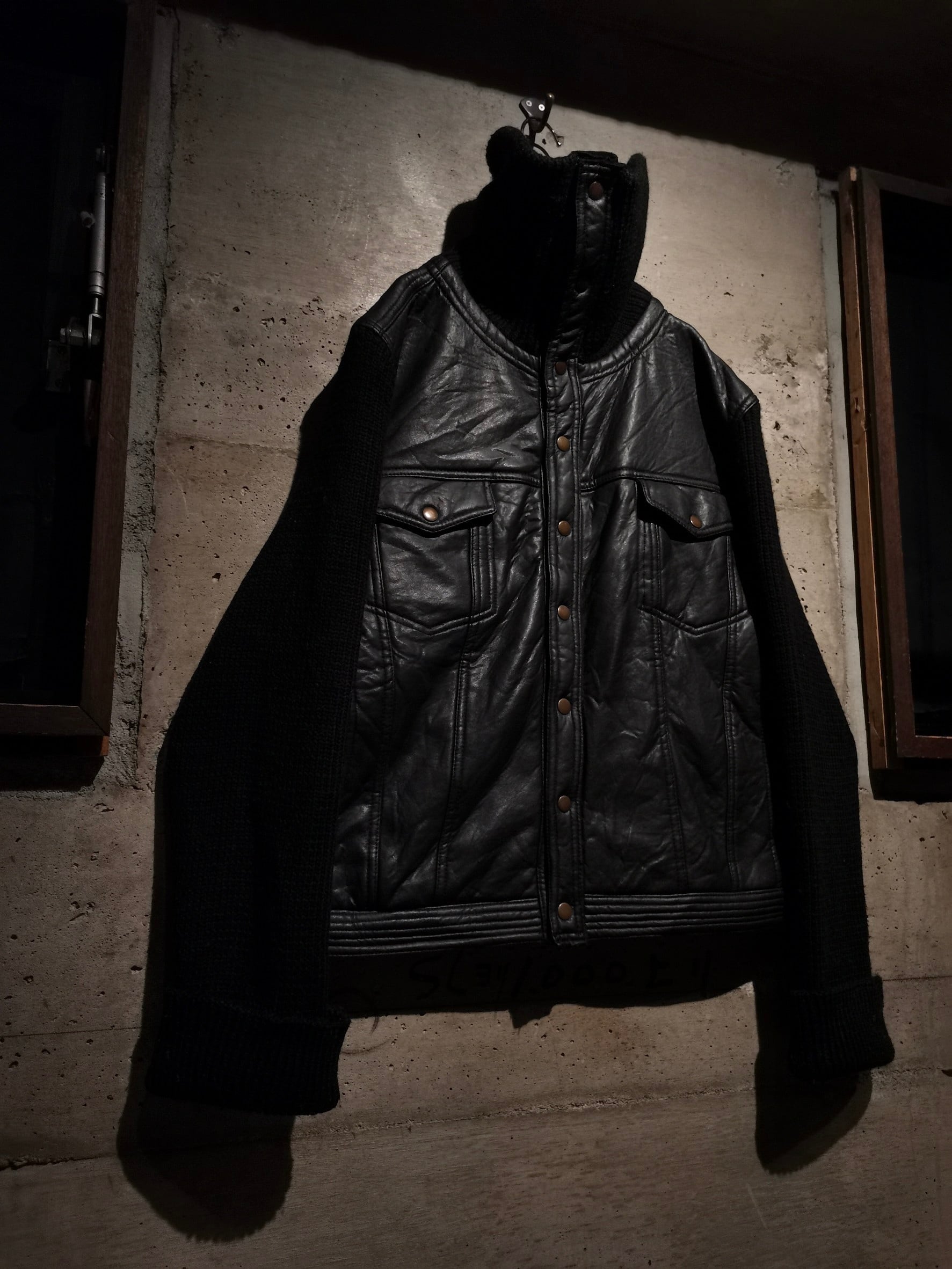 トラッカージャケットのディテールを採用した、柔らかくしなやかなブラックレザーを身頃に、アーム、ネックをニットで切り替えた、ヴィンテージの垣根を飛び越えたラグジュアリーなアプローチが素晴らしい1着。