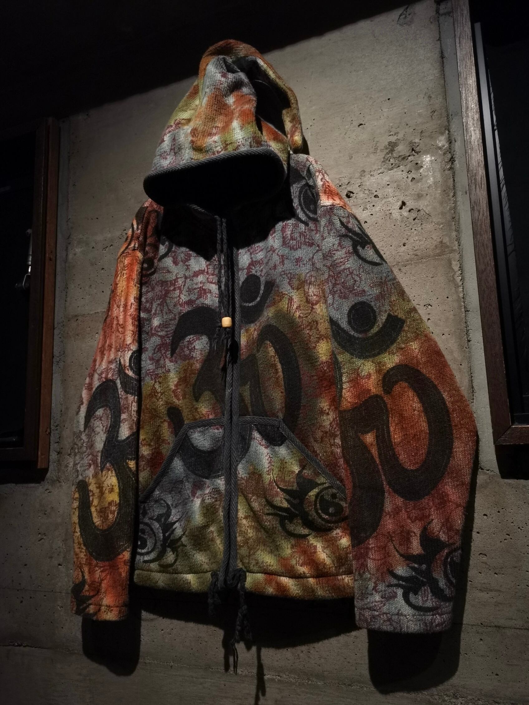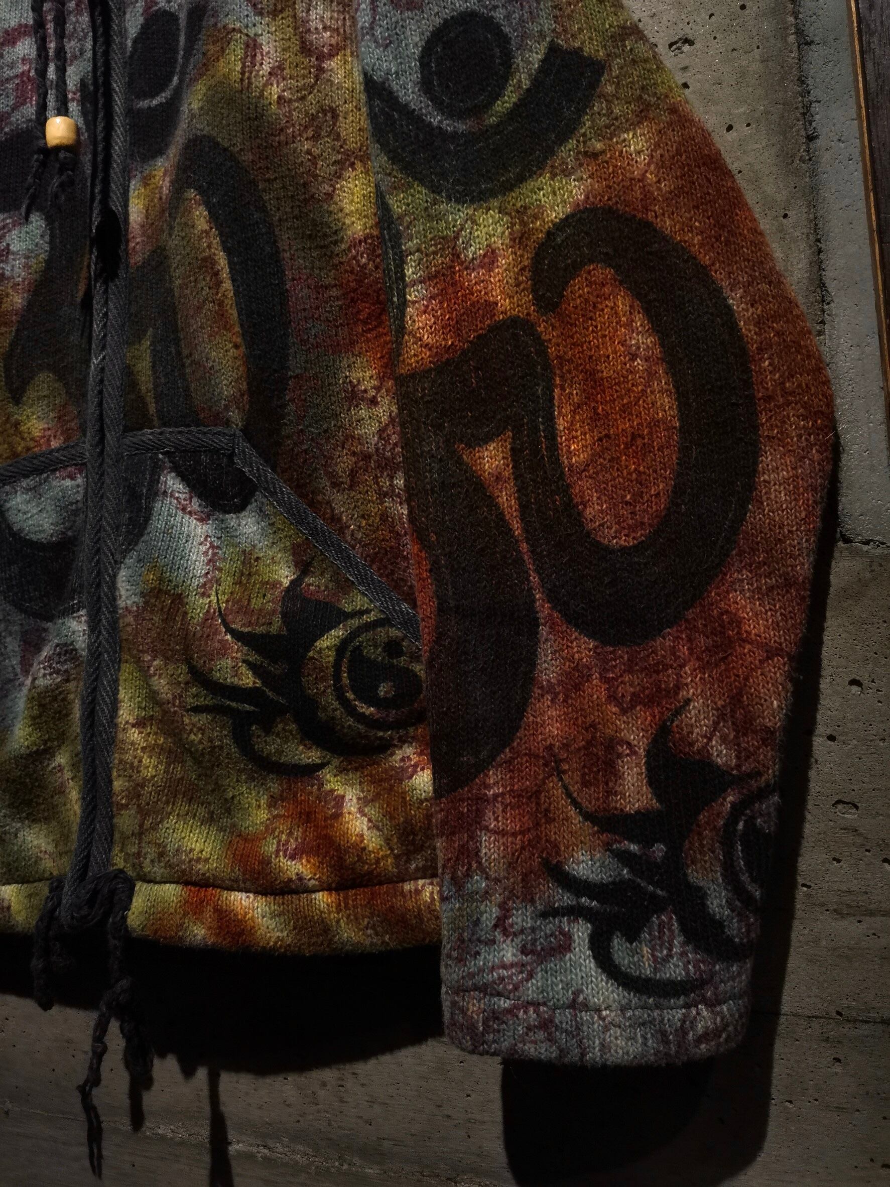 マルチなカラーリングから成るグラデーションの美しい染めが施されたニットのボディに、花や陰陽、トライバルモチーフを載せた逸品。