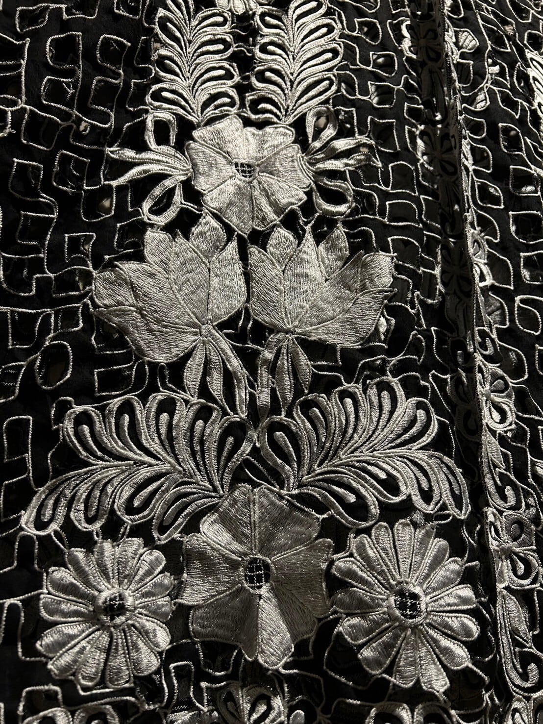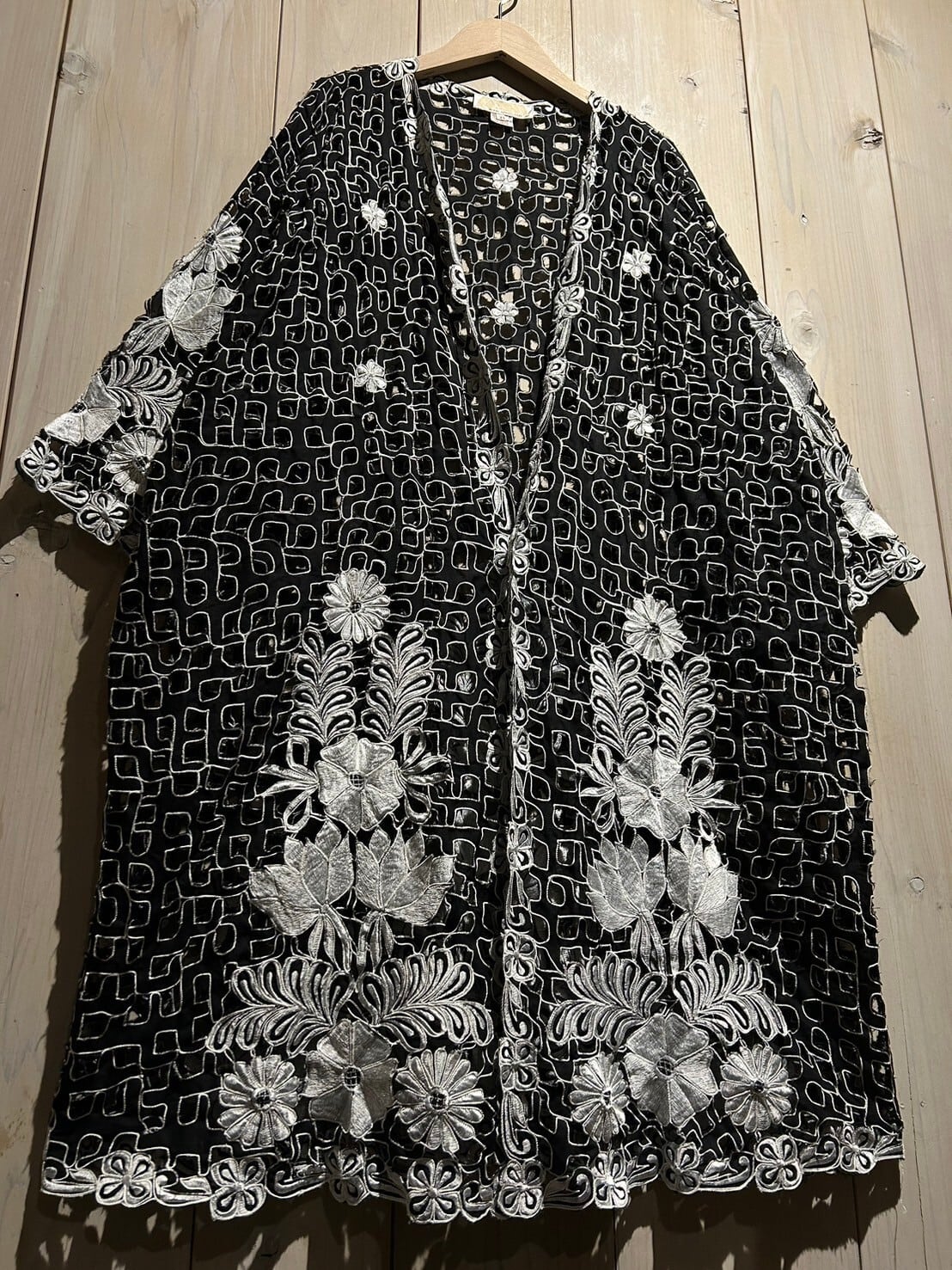 ザックリとした目の荒いメッシュのボディをベースに、光沢のある糸で美しい花々を載せた半袖の羽織りジャケット。