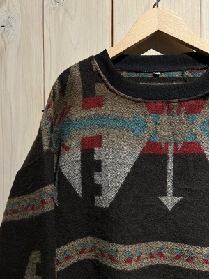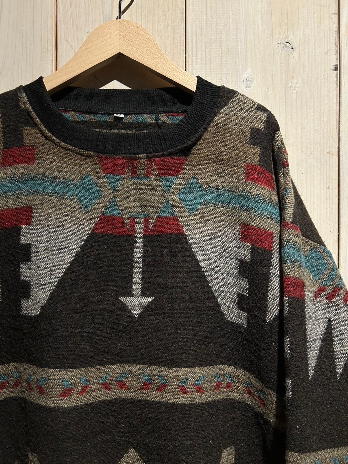 柔らかく温かみのあるウールを用いたボディに、茶、赤、水色の美しいグラデーションでネイティブ柄を載せたプルオーバー。