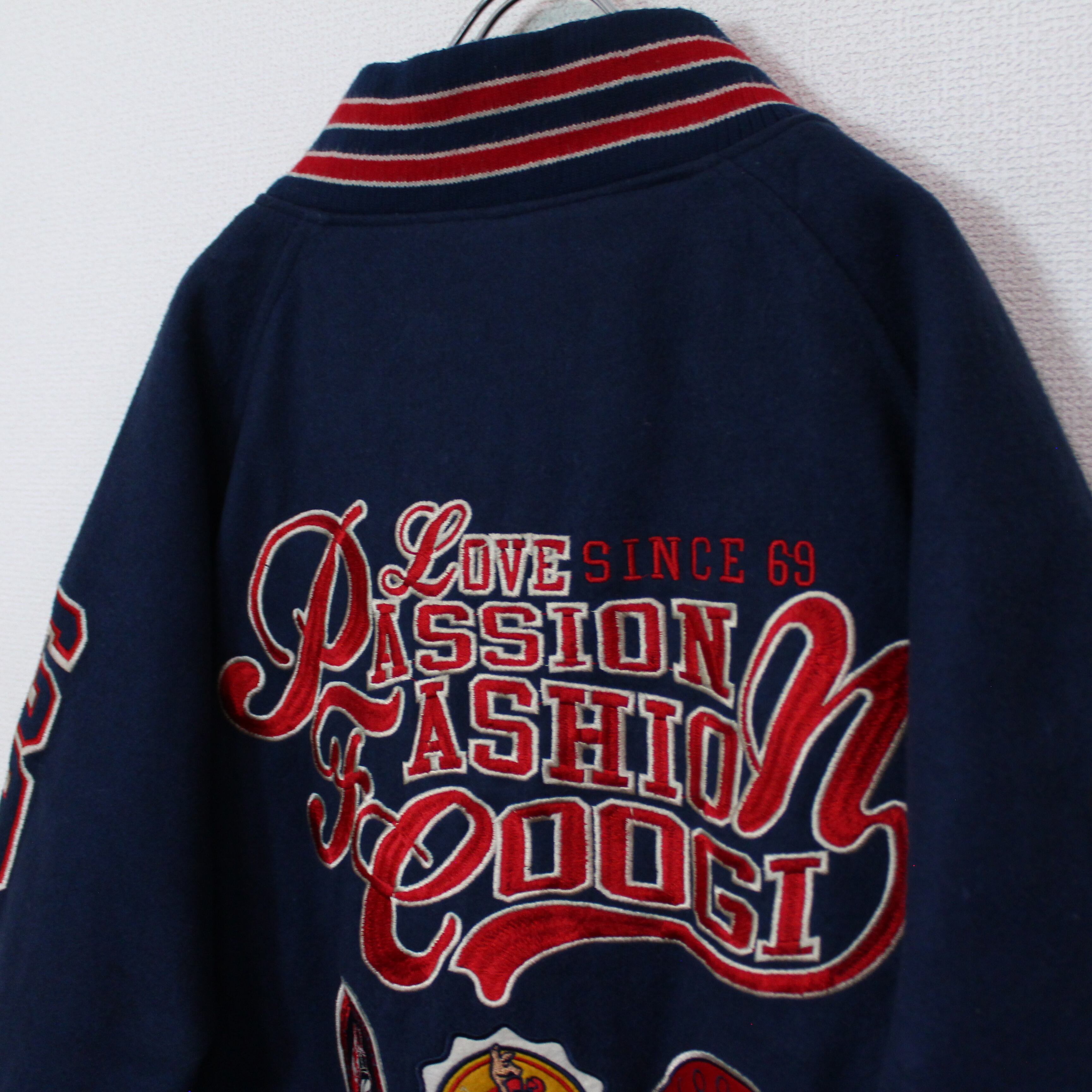 ウールを混紡した柔らかなネイビーのボディに、オーストラリア発のブランドらしく、カンガルーにブランドの頭文字"C"を掛け合わせたワッペン、右胸にはブランドネームを刺繍でON。背面には"Love Passion Fashion COOGI"と、ブランドらしいメッセージの刺繍にパッチ。前後共に非常にデザインが素晴らしい1着。