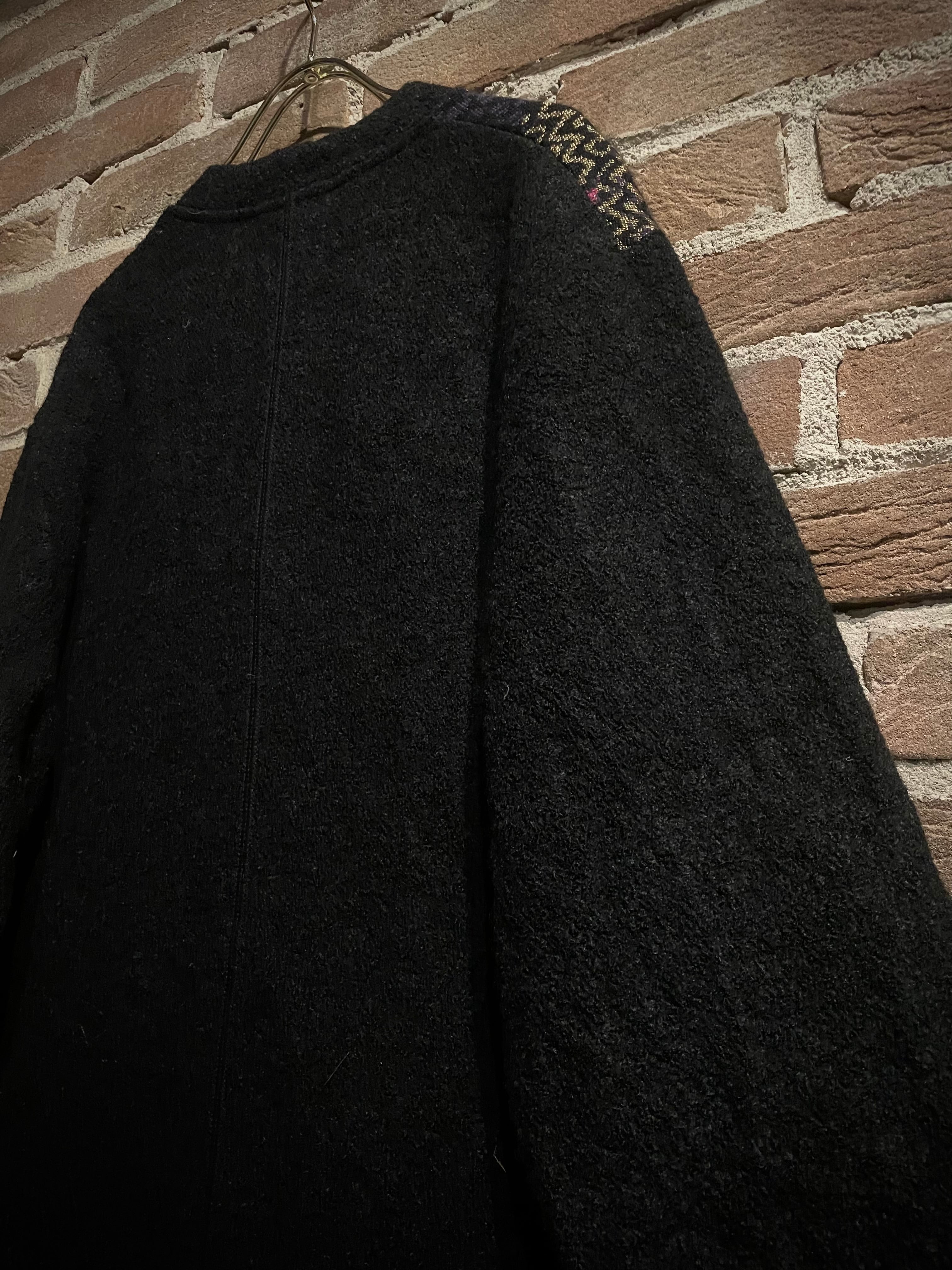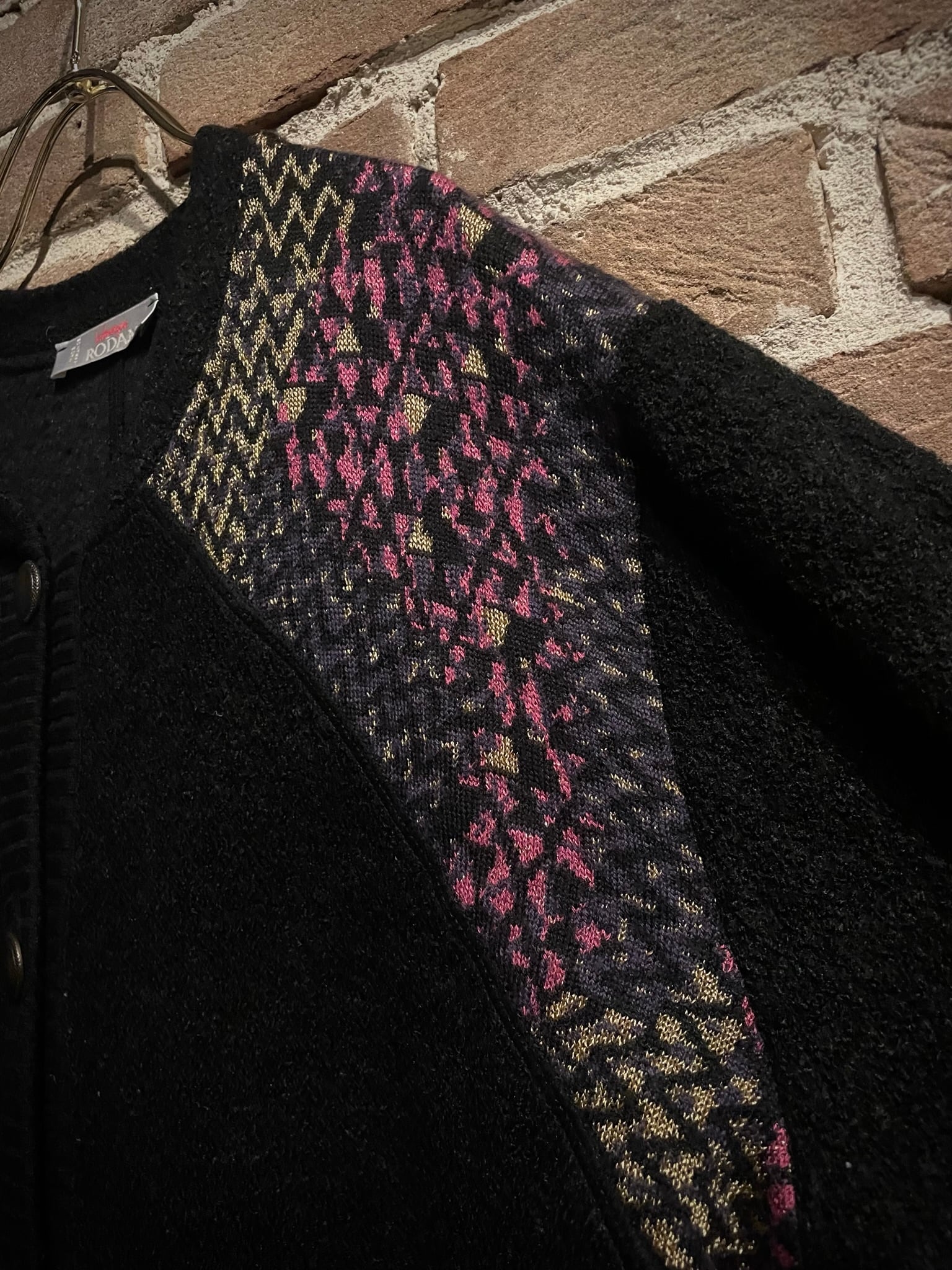 フワッと起毛感のある柔らかなブラックのボディに、幾何学的かつグラデーションがかった、抽象柄のニットを切り替えたユーロヴィンテージのカーディガンジャケット。