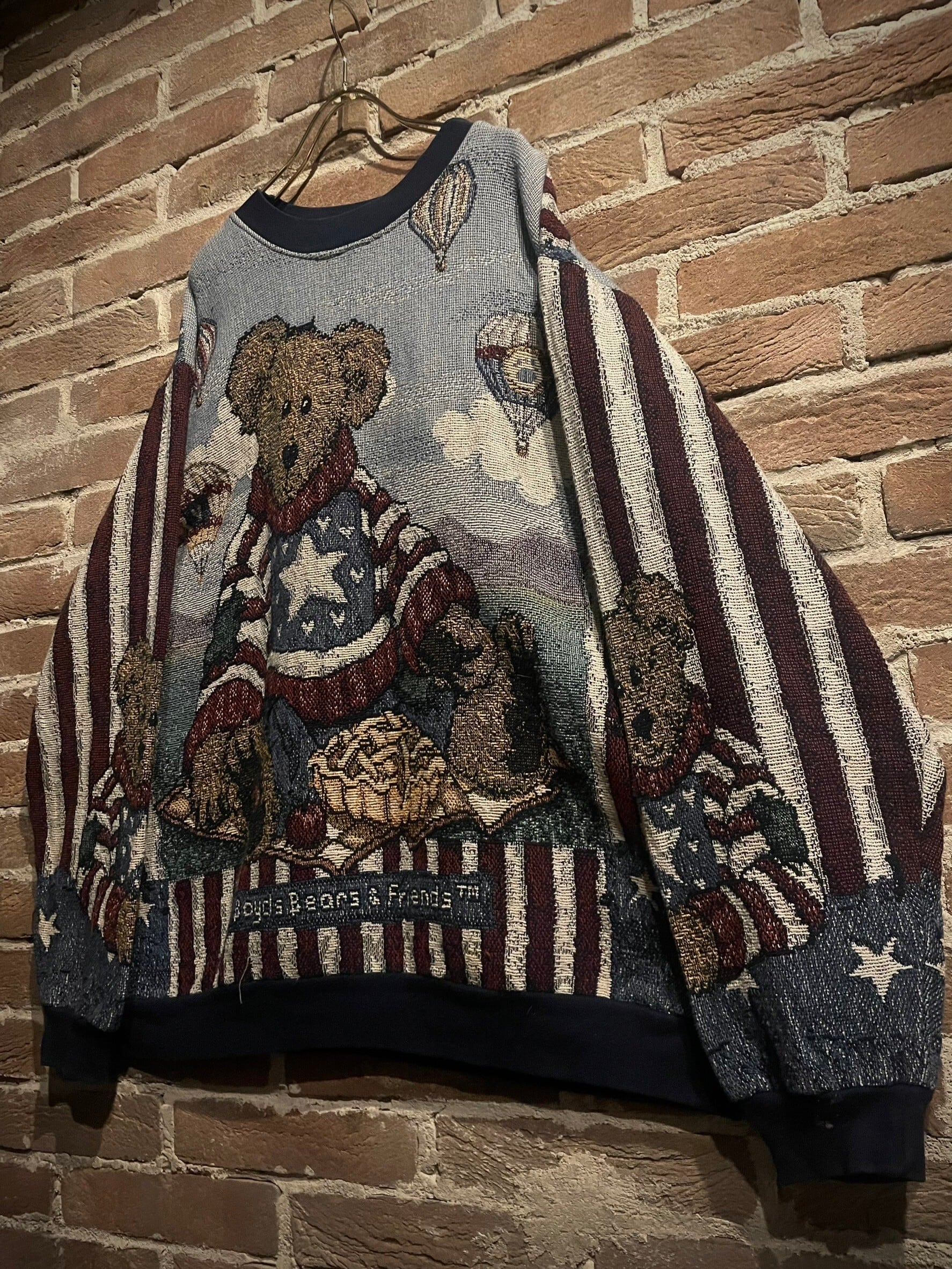 愛らしいクマさんが星条旗のニットを着て、パイと一緒にピクニックを楽しむ様子を載せたゴブランプルオーバー。