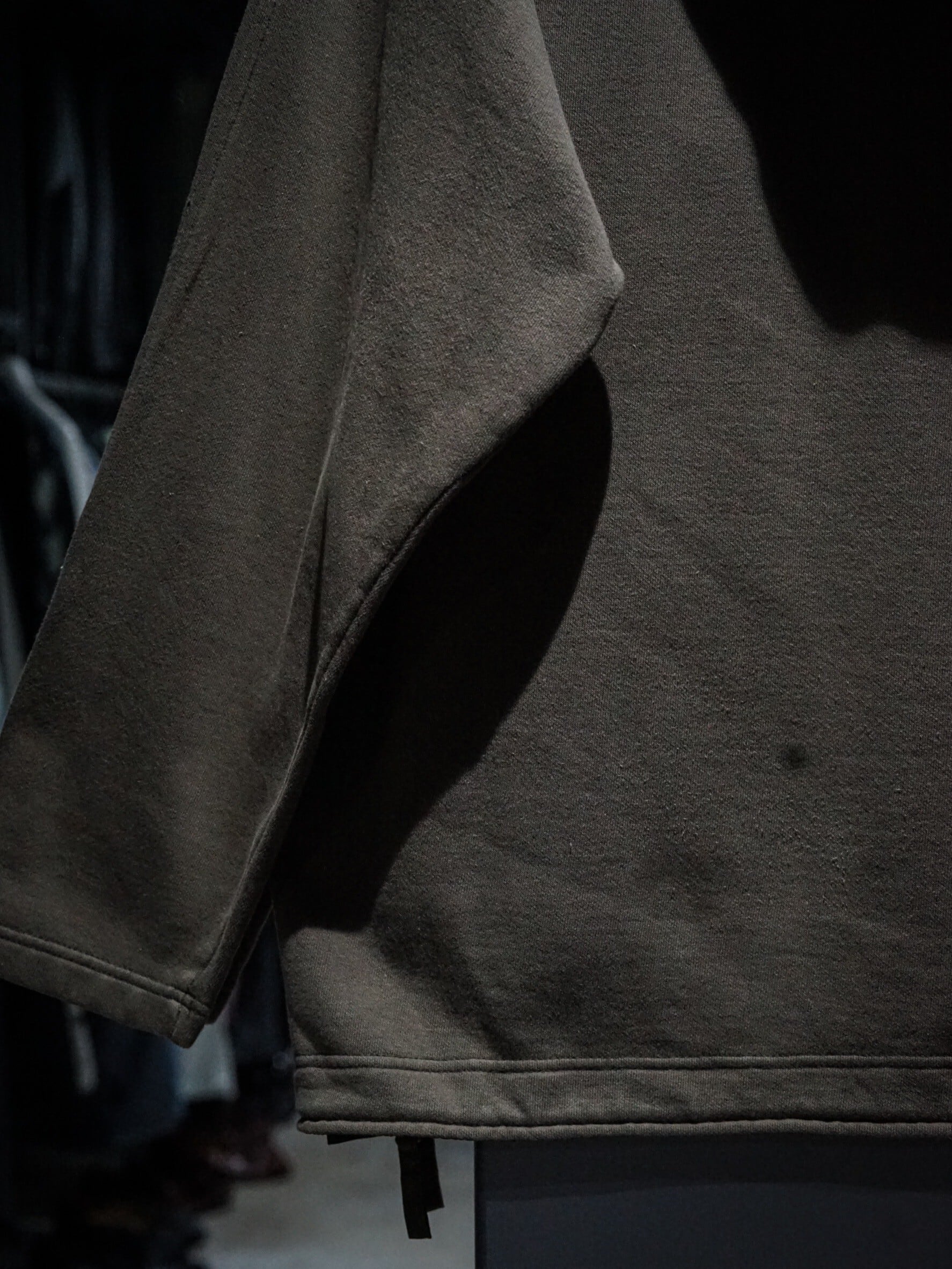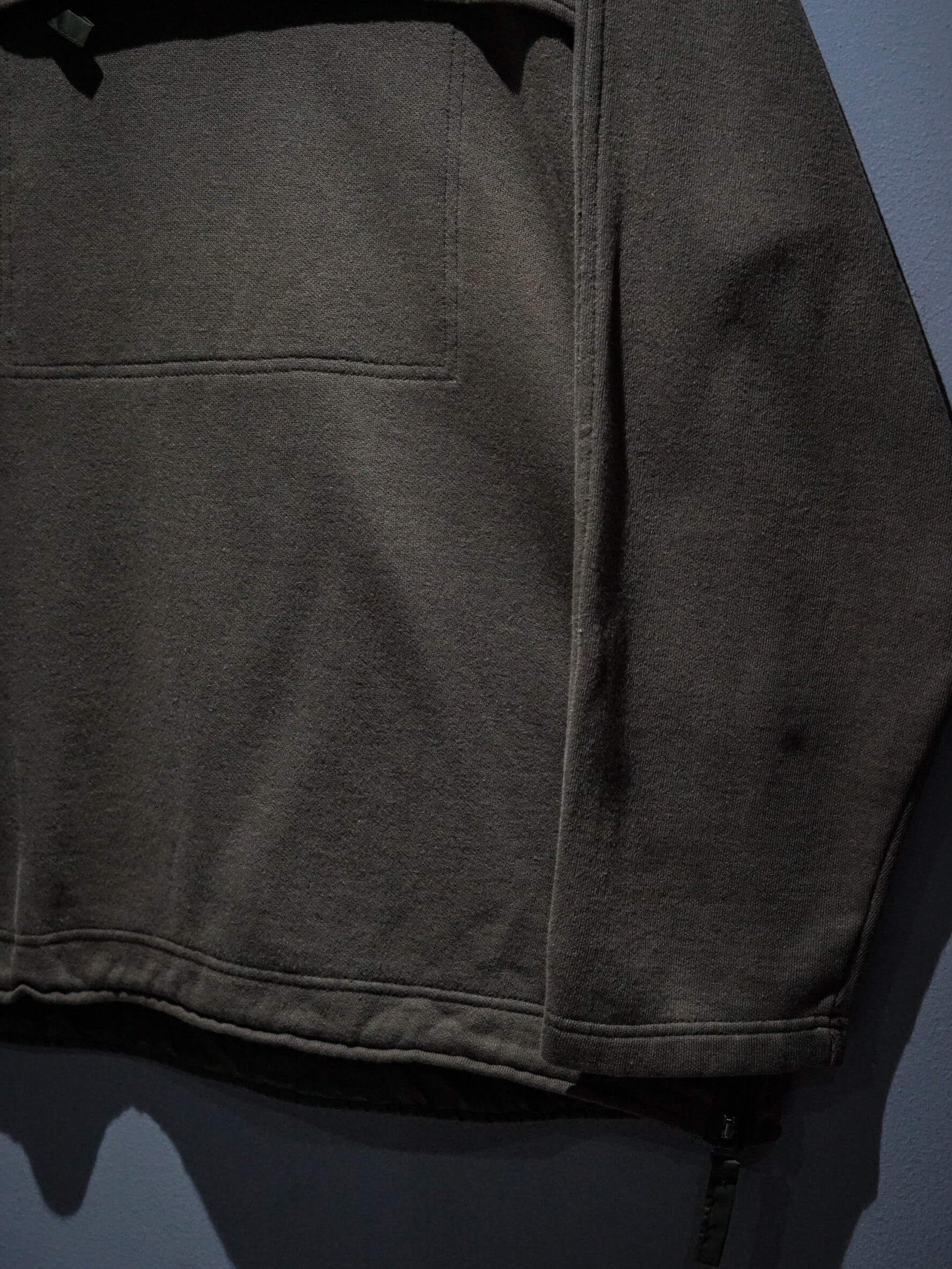 首元のハーフジップを左側にずらして施した、"変形"のディテールを用いてアノラック型に落とし込んだフーディ。