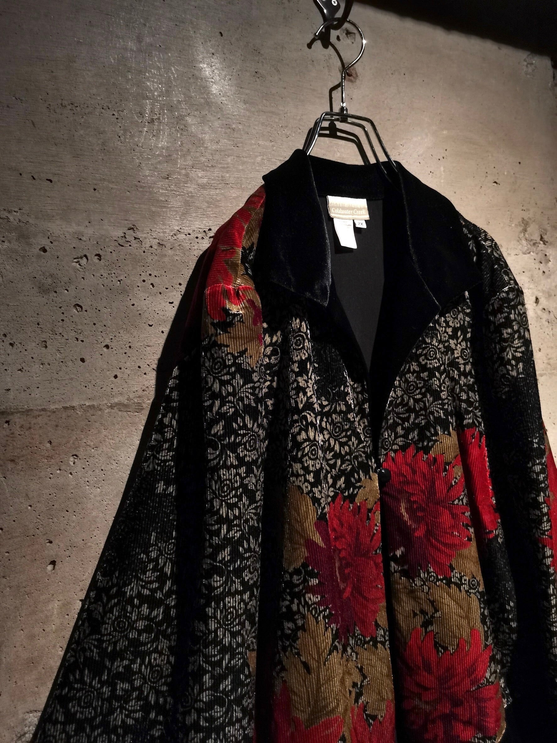 花のデザインとベロアが見事にマッチ、妖艶な表情に魅せられる1着。襟と裾を無地の黒のベロアで切り替えたデザインバランスも非常に良い、、、