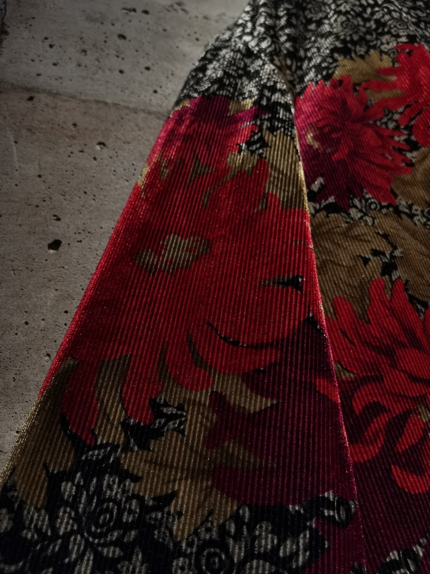 トロみ、滑らかさを兼ね備えたベロアを用いたボディに、モノトーンで繊細な花々を、さらにその上から真紅の花を重ねたオープンカラーのベロアシャツ。