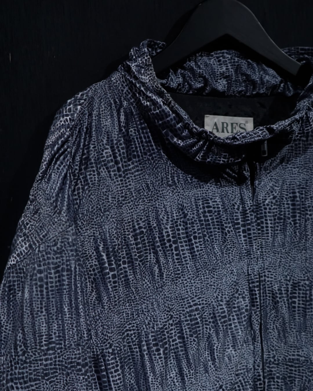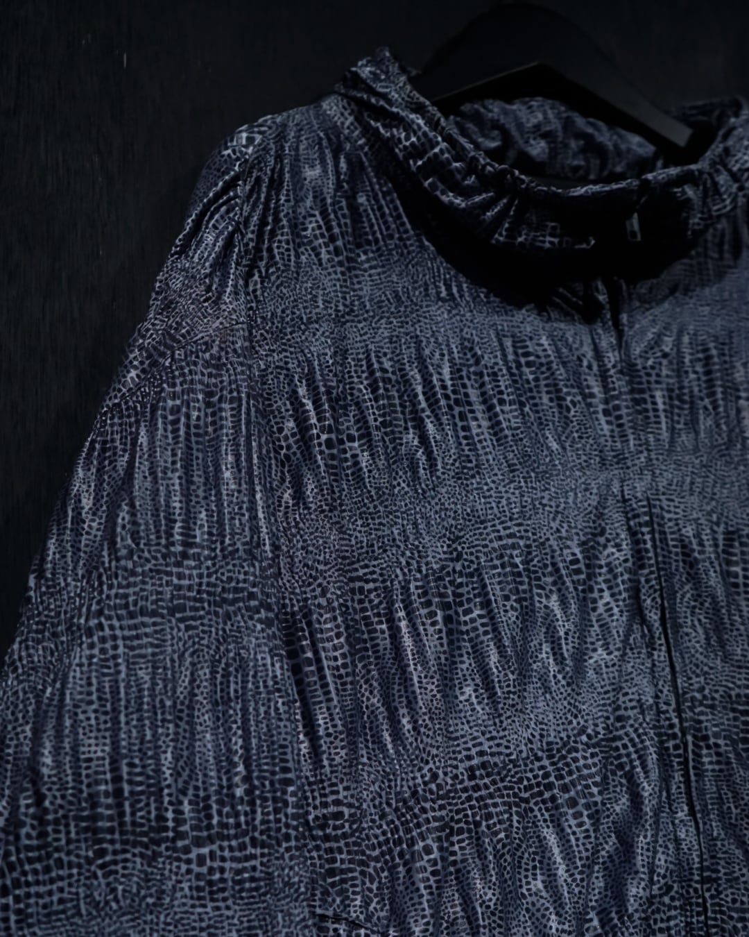 ツルッと滑らかな素材を用いたボディに細やかなパイソン柄を載せ、シュリンク加工を施したジャケット。