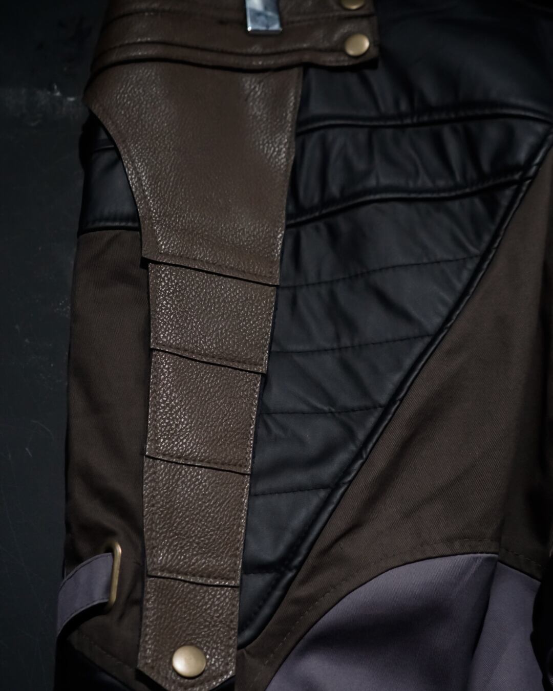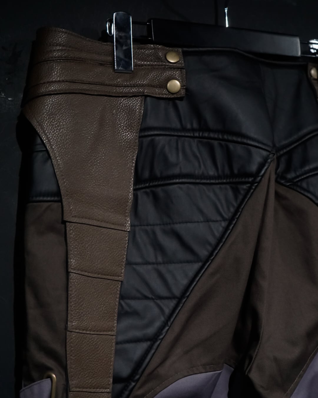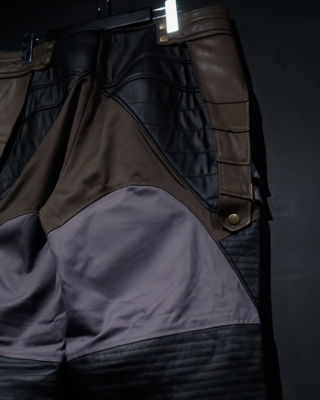 柔らかな薄紫×茶の生地を切り替えた腰回りに、腿から下、ウエスト付近等にフェイクレザーを用いてギミックをON。この見た目のインパクトにまず服好きの心ど真ん中を射抜かれますね、、、