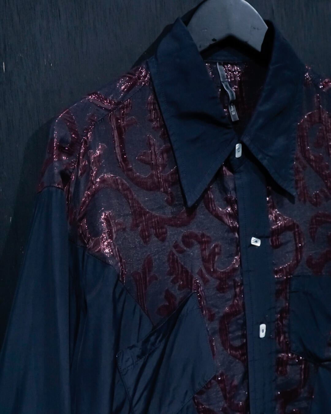 コシのあるブラックのボディをベースに、メタリックな光沢を放つジャガードの織りでボタニカル柄を載せた長袖シャツ。