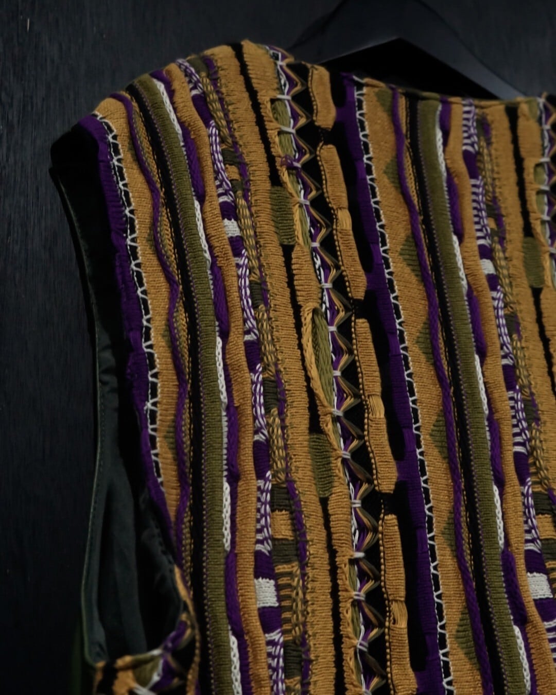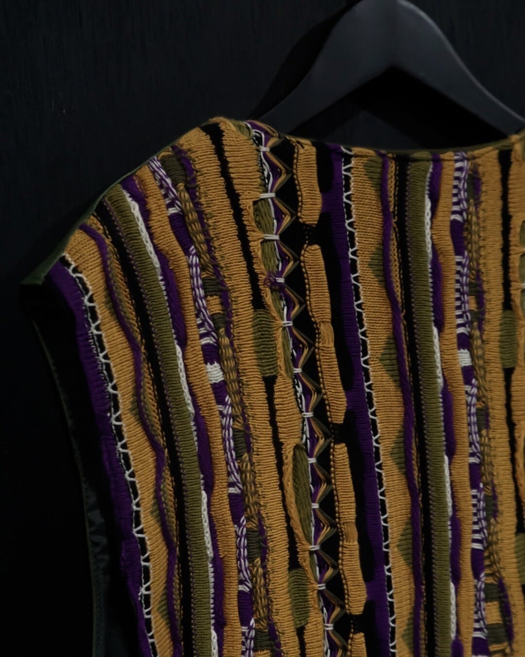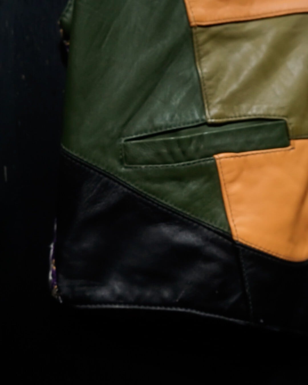 フロントにはブラウンxオレンジxグリーンxブラックと言ったマルチなカラーリングでまとめられた極上レザー、バックにはオレンジベースでクレイジーパターンを載せた3Dニットを落とし込んだベスト。