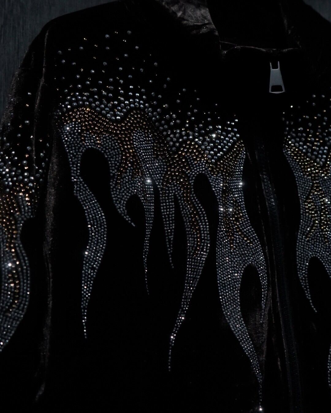 起毛感のあるベロア素材を用いたボディに、Bling-Blingな輝きを放つラインストーンでファイアーパターンを載せたジップアップジャケット。