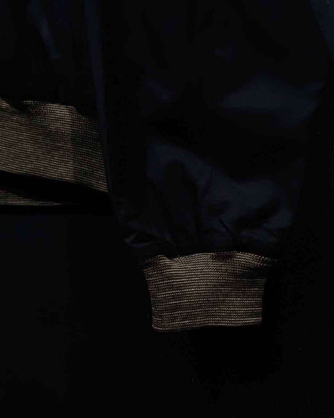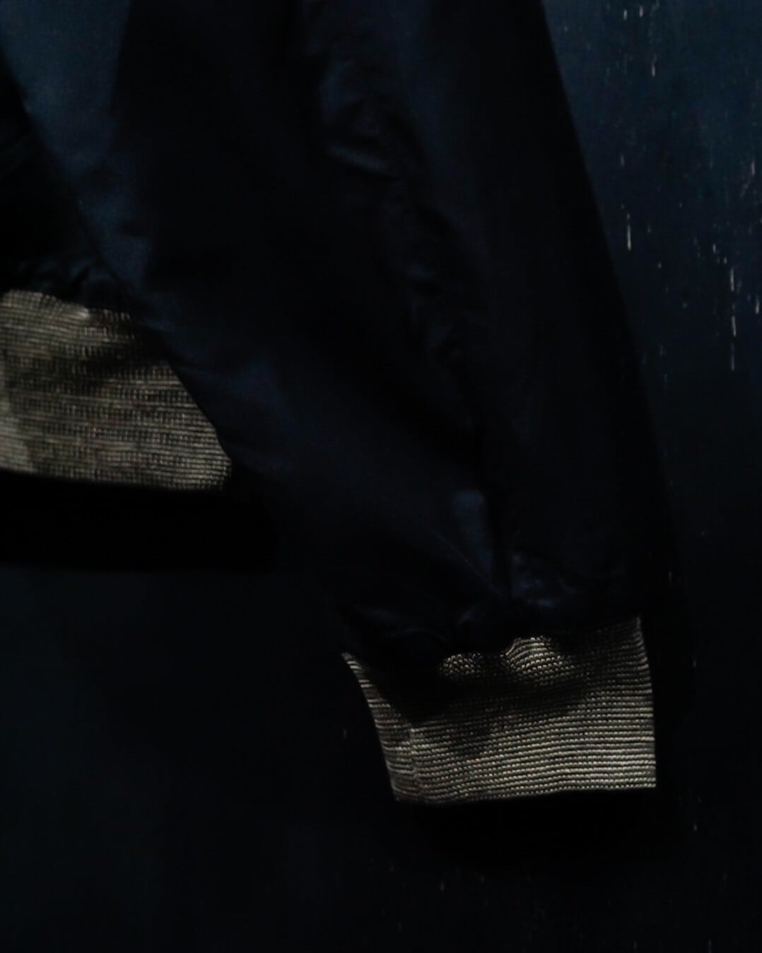 ハリのある薄手の素材を用いて、表面の背面には地図のようなプリントをON。ガバッと裏返すとベージュのプレーンな表情に早変わりするリバーシブル仕様のスウィングトップジャケット。