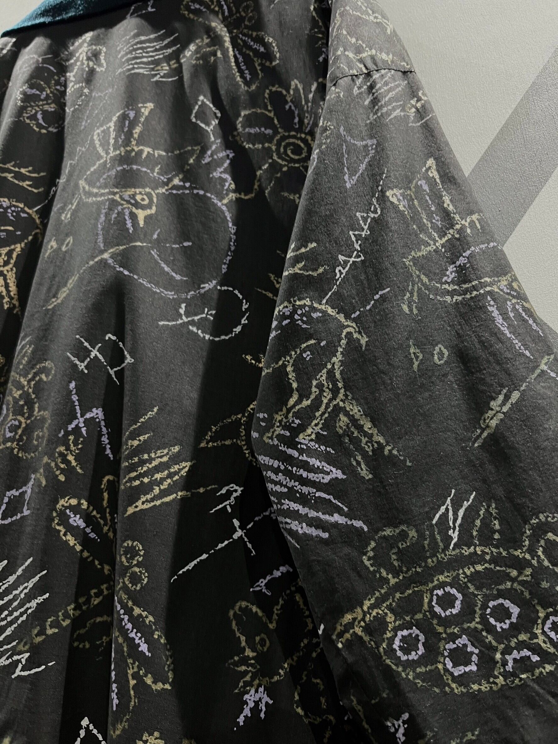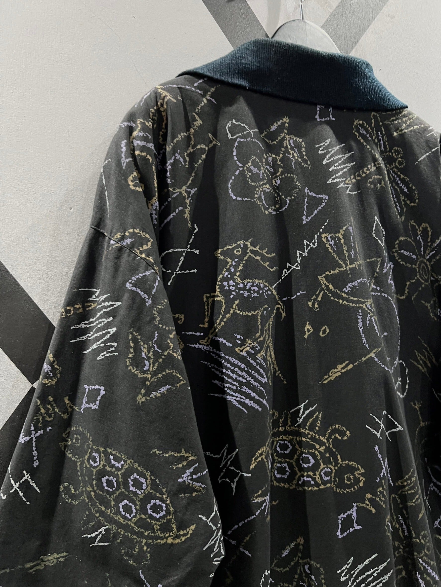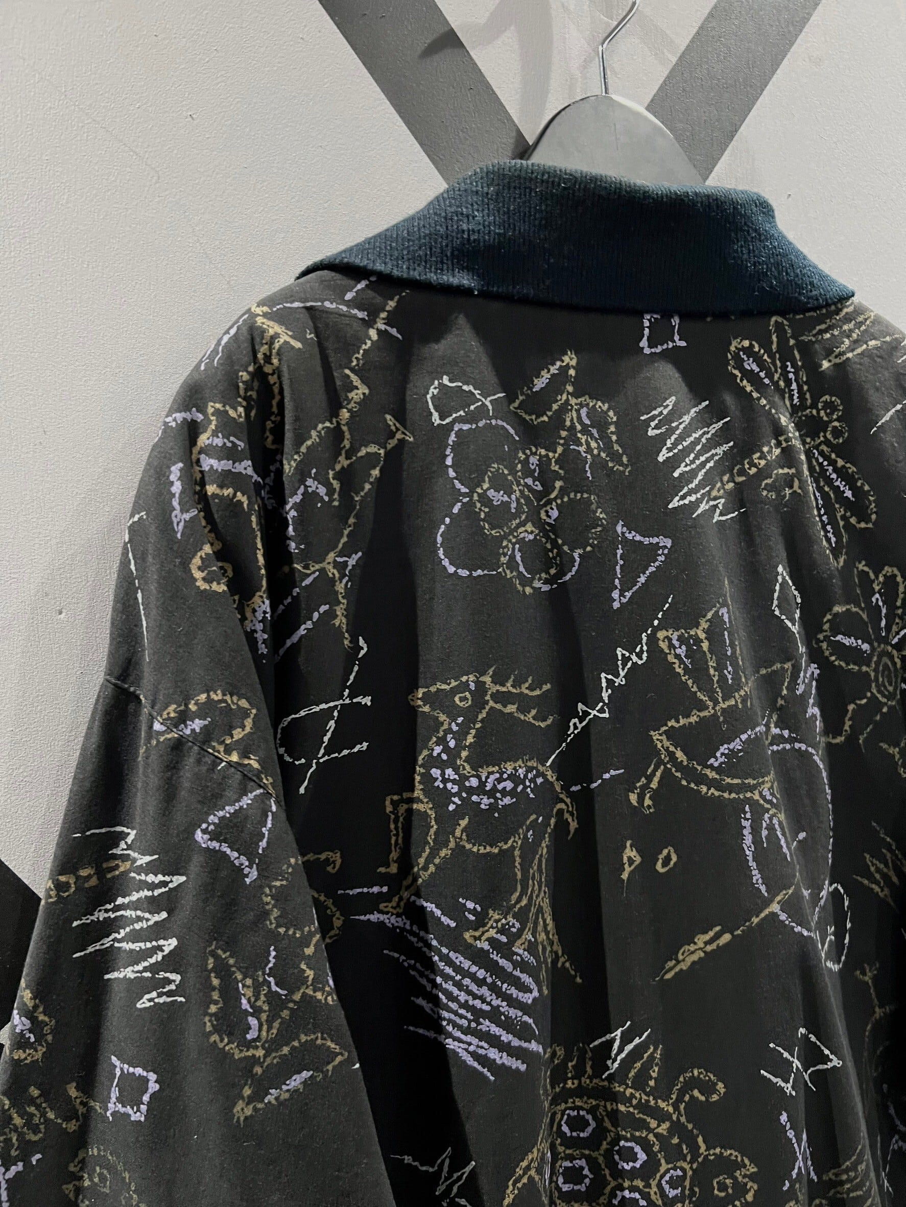 ブラックのコットン素材をベースにゴールド×紫×白のペイントによって花、ラクダ、鳥、木、蝶々等、様々な動物や植物、虫を全面にデザインしたデザインのジャケット。