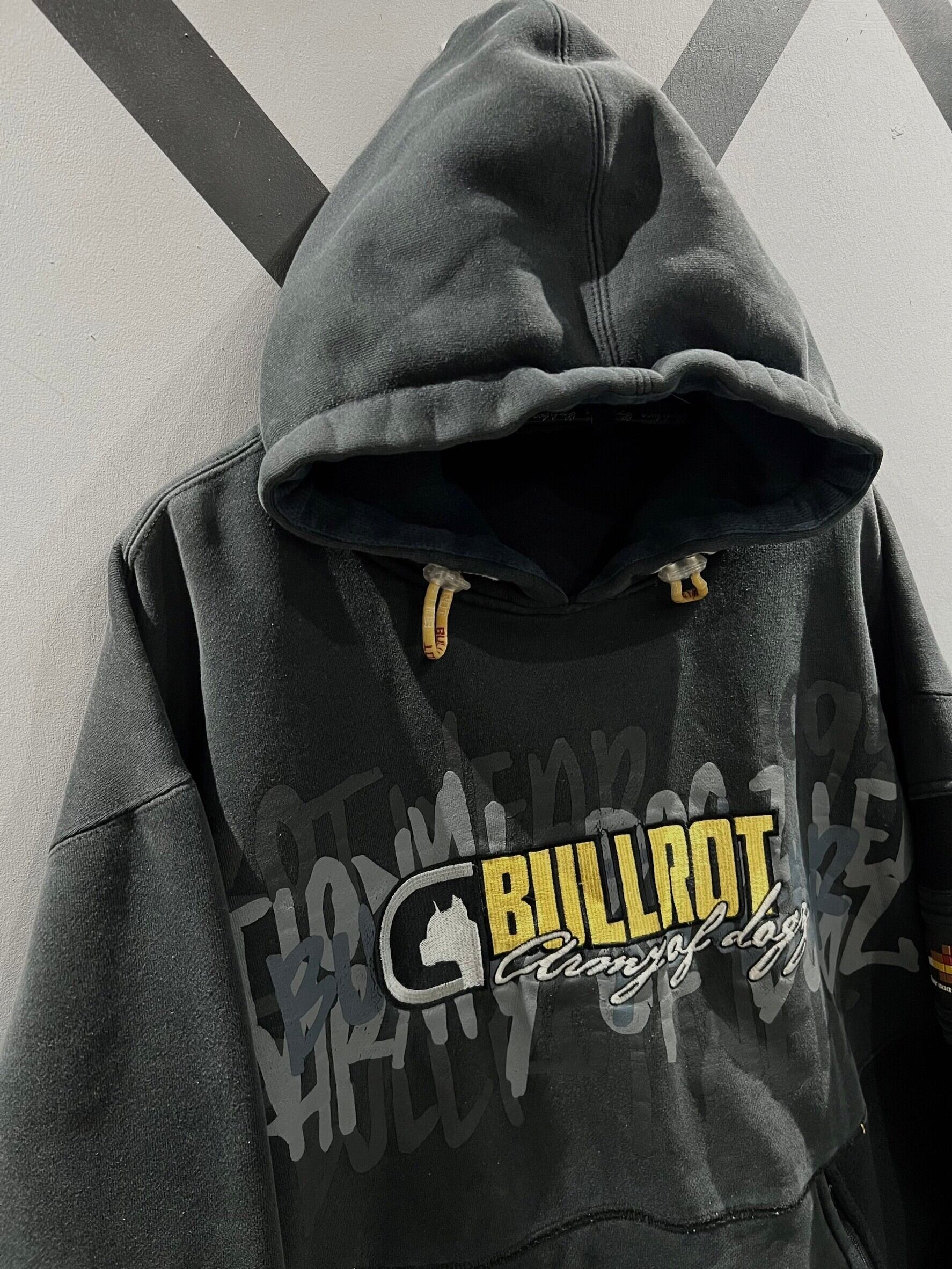 ガシッとハリのある、ブラックがフェードした墨黒のスウェット生地に、グラデーションがかったブランドロゴのプリント、立体的なシリコンパッチを載せた1着。
