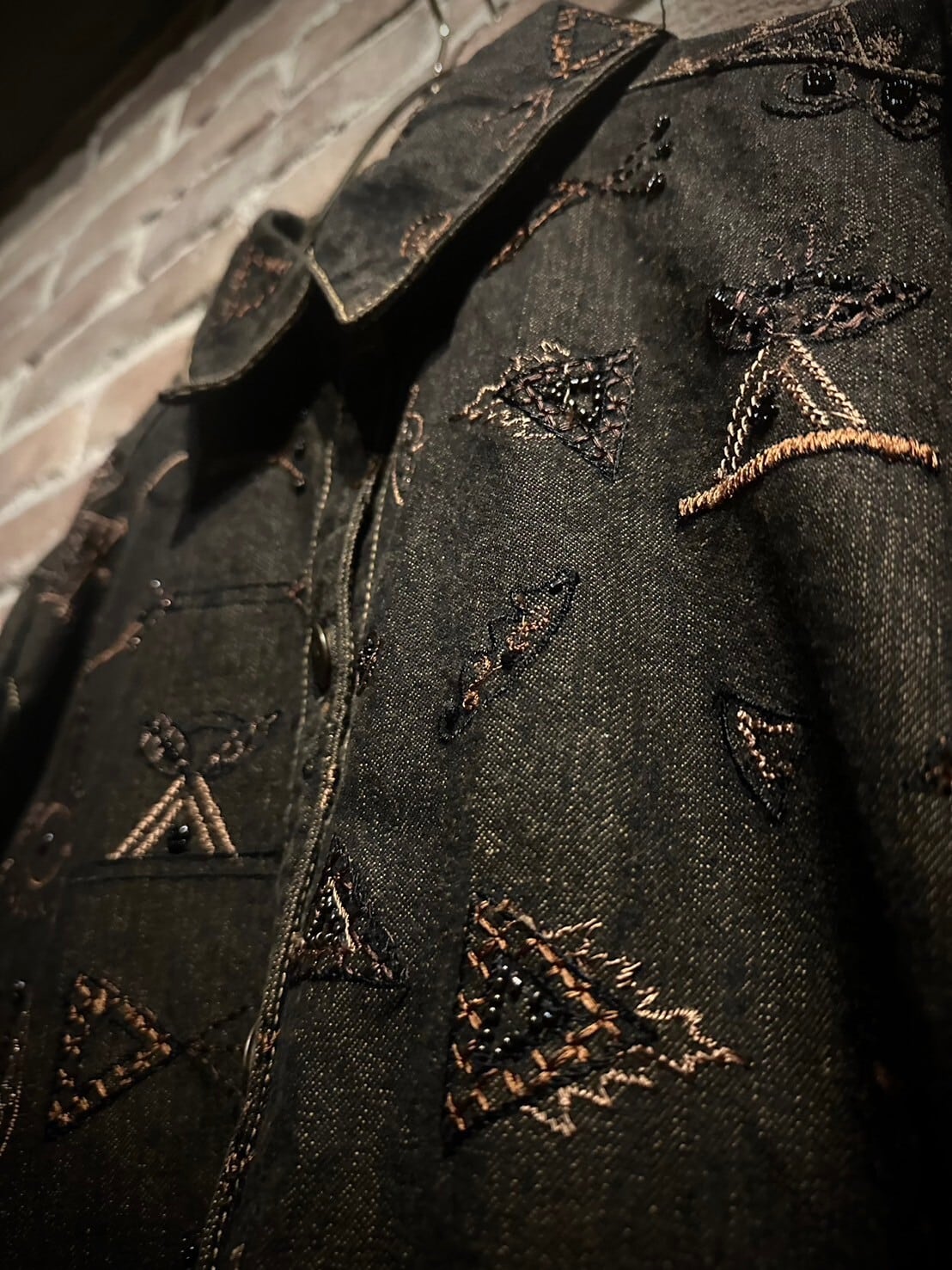 コシのあるダークブラウンのデニムジャケットをベースに、独特な雰囲気を醸し出すアート柄を刺繍で刻んだ1着。