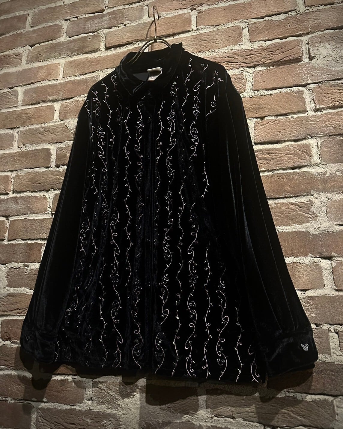 鈍く光沢のあるブラックベロアを用いたボディに、フロントにボタニカル柄、さらに隠れミッキー的なノリでミッキーを光沢のある糸で刻んだ長袖シャツ。