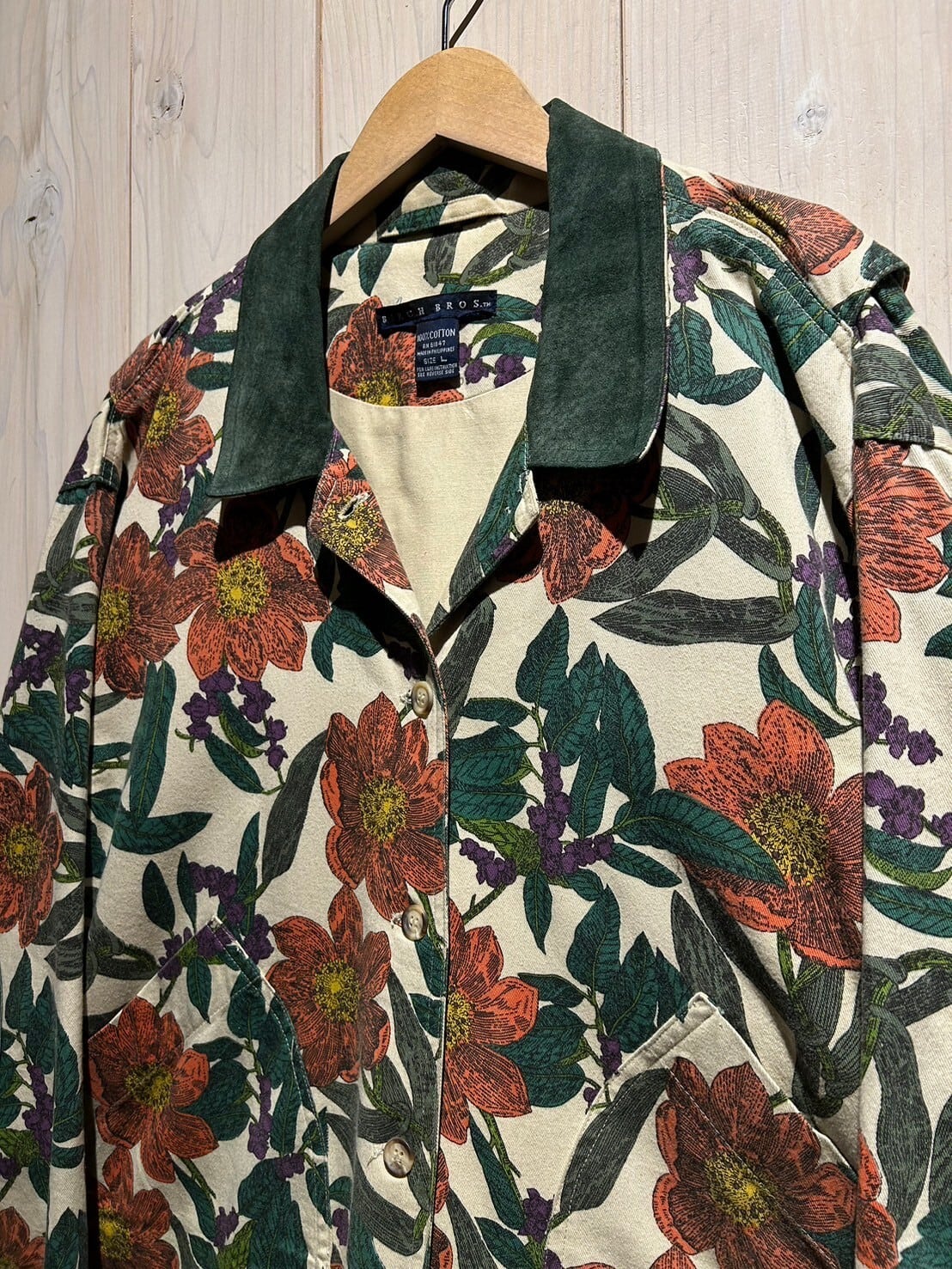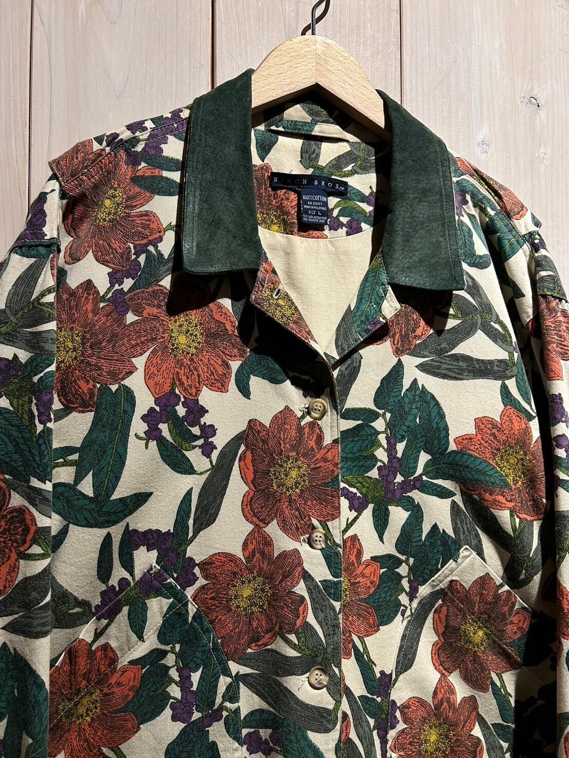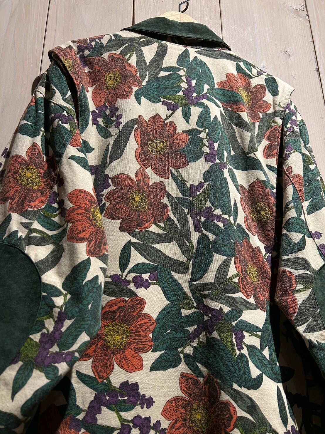 ハリ、コシのある生地に、レトロな美しい花柄を載せたカバーオールジャケット。