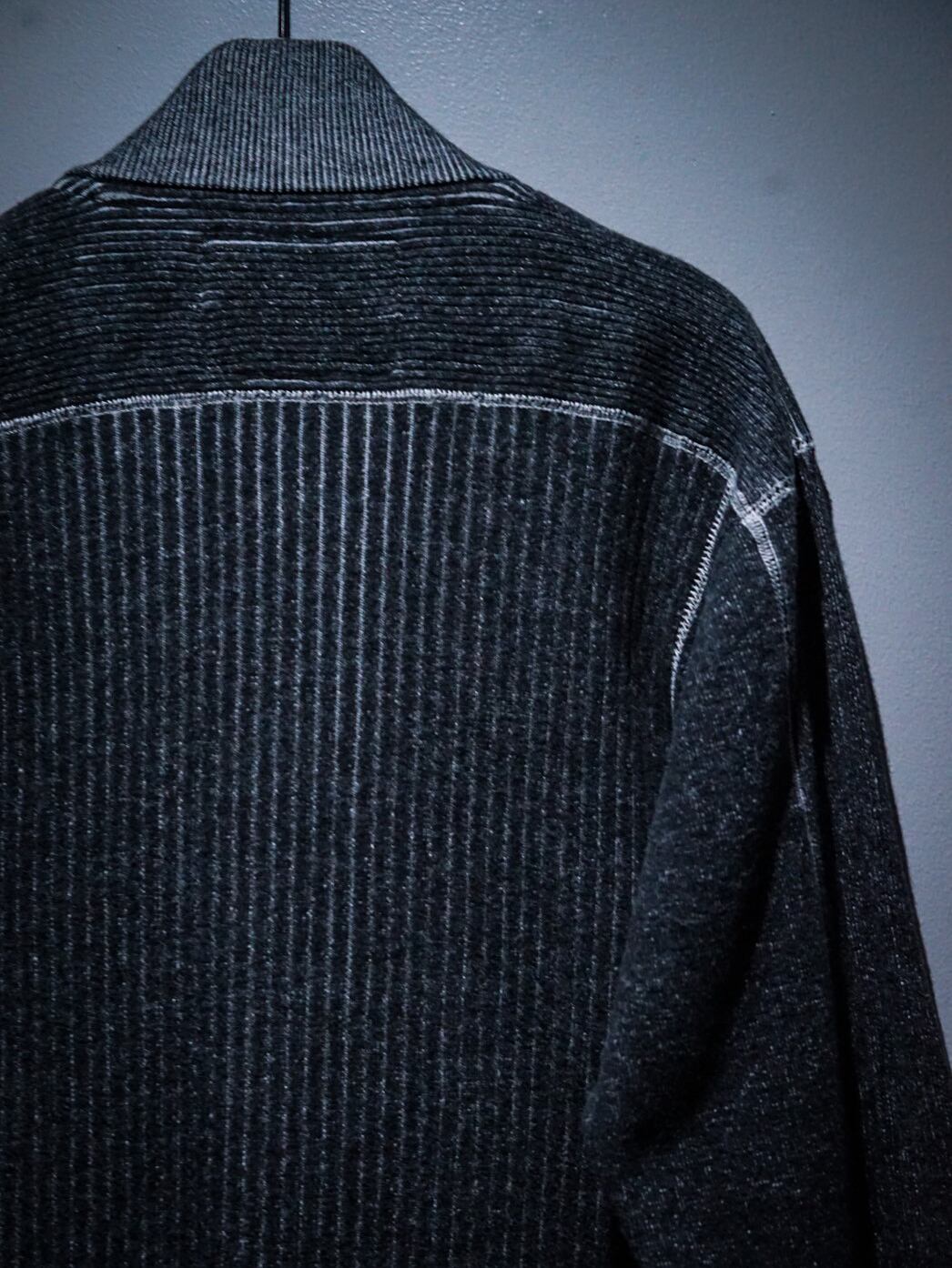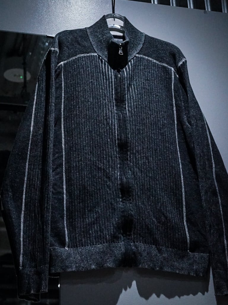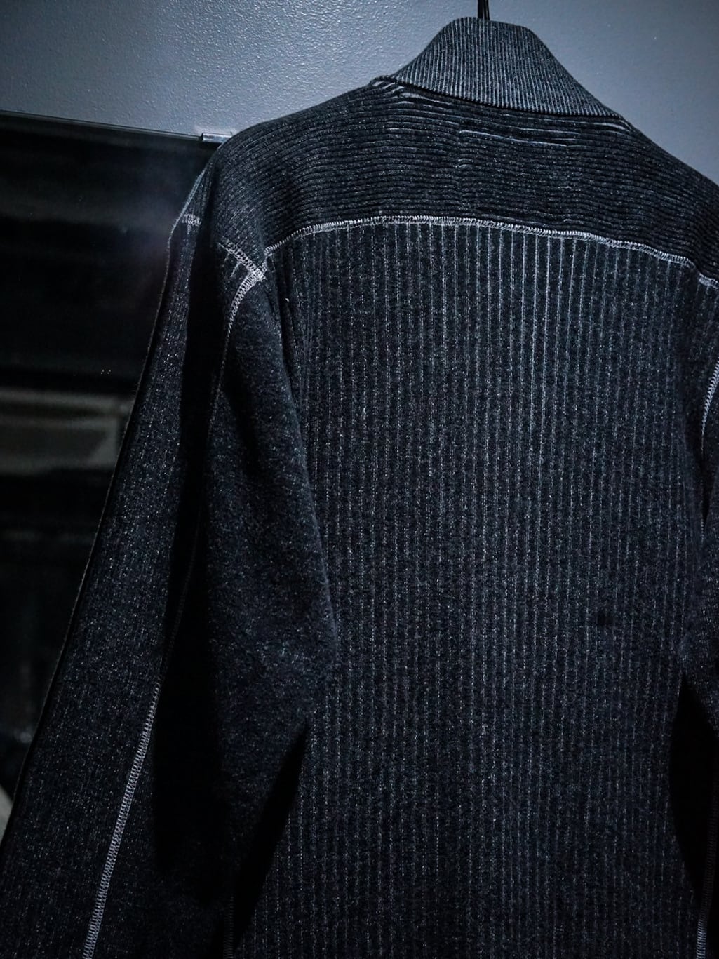 フェードグレーのリブニットを用いて、立ち襟仕様、美しく洗練されたシルエットが特徴的なフルジップニット。