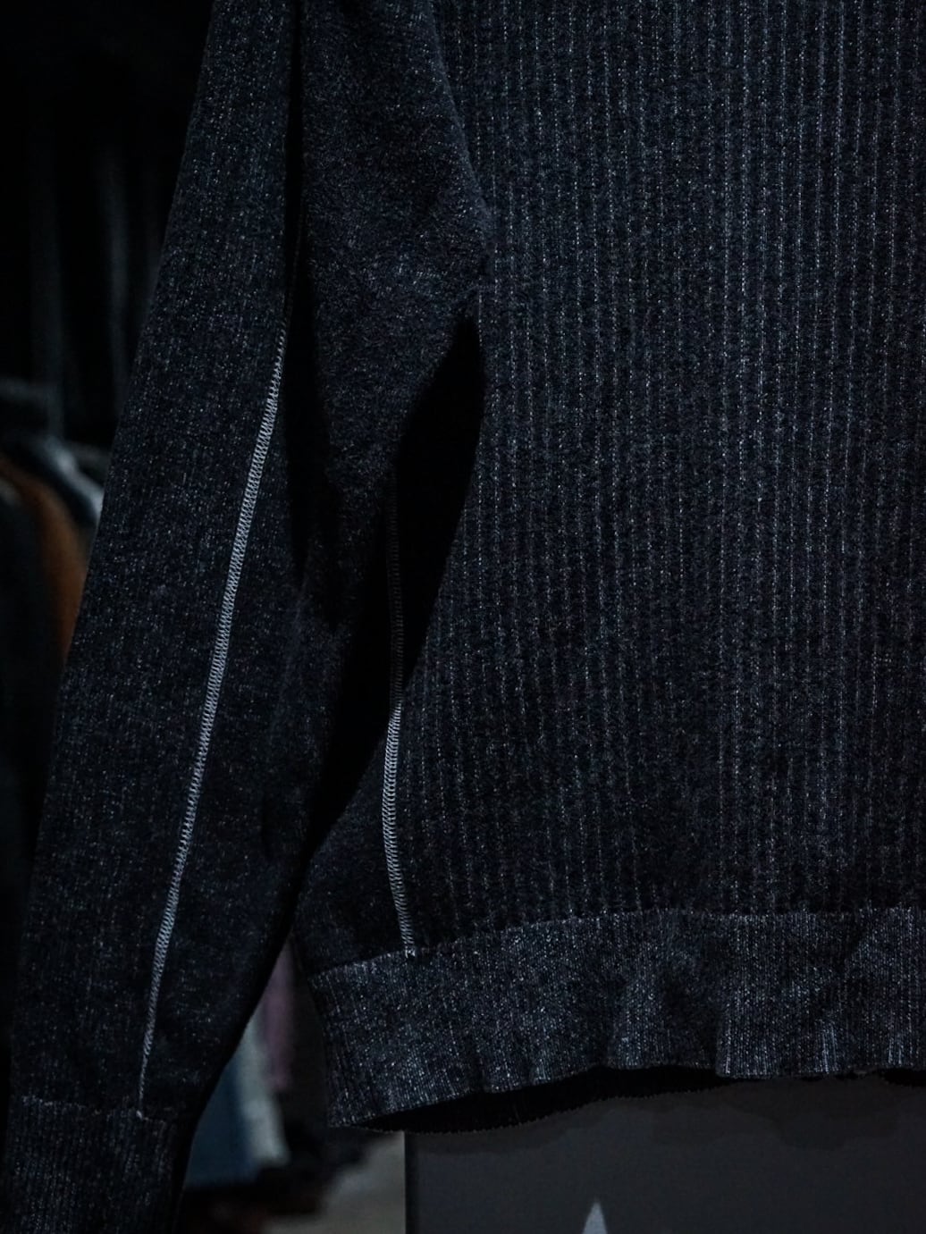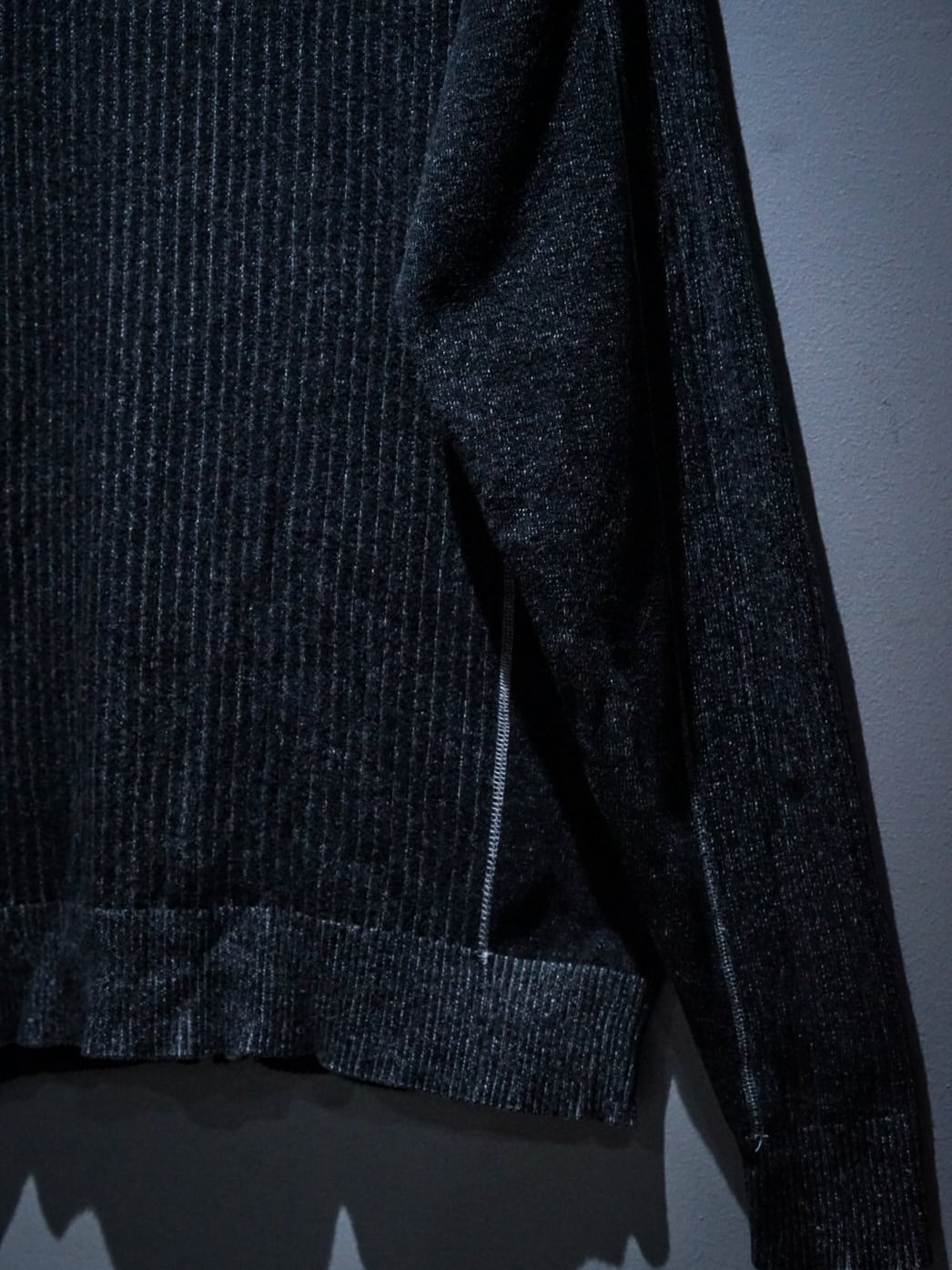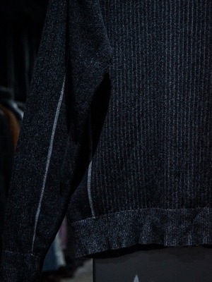 フェードグレーが昨今のトレンドでもある退廃感を捉えており、切り替え部分にはロックミシンのステッチをアクセントに、リブニットと相まって立体感のある仕上がりに。