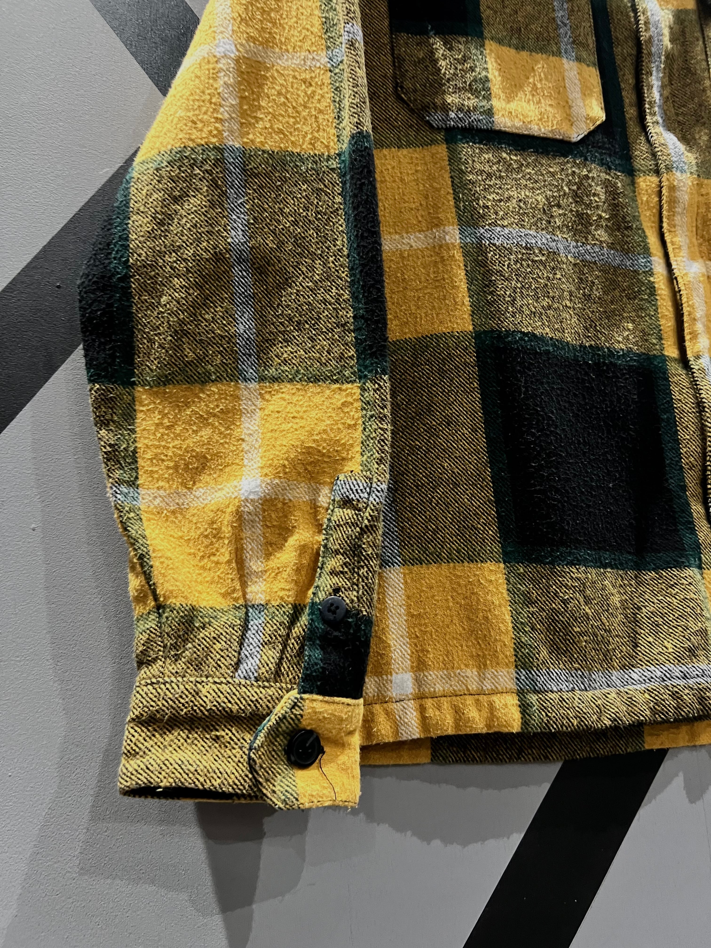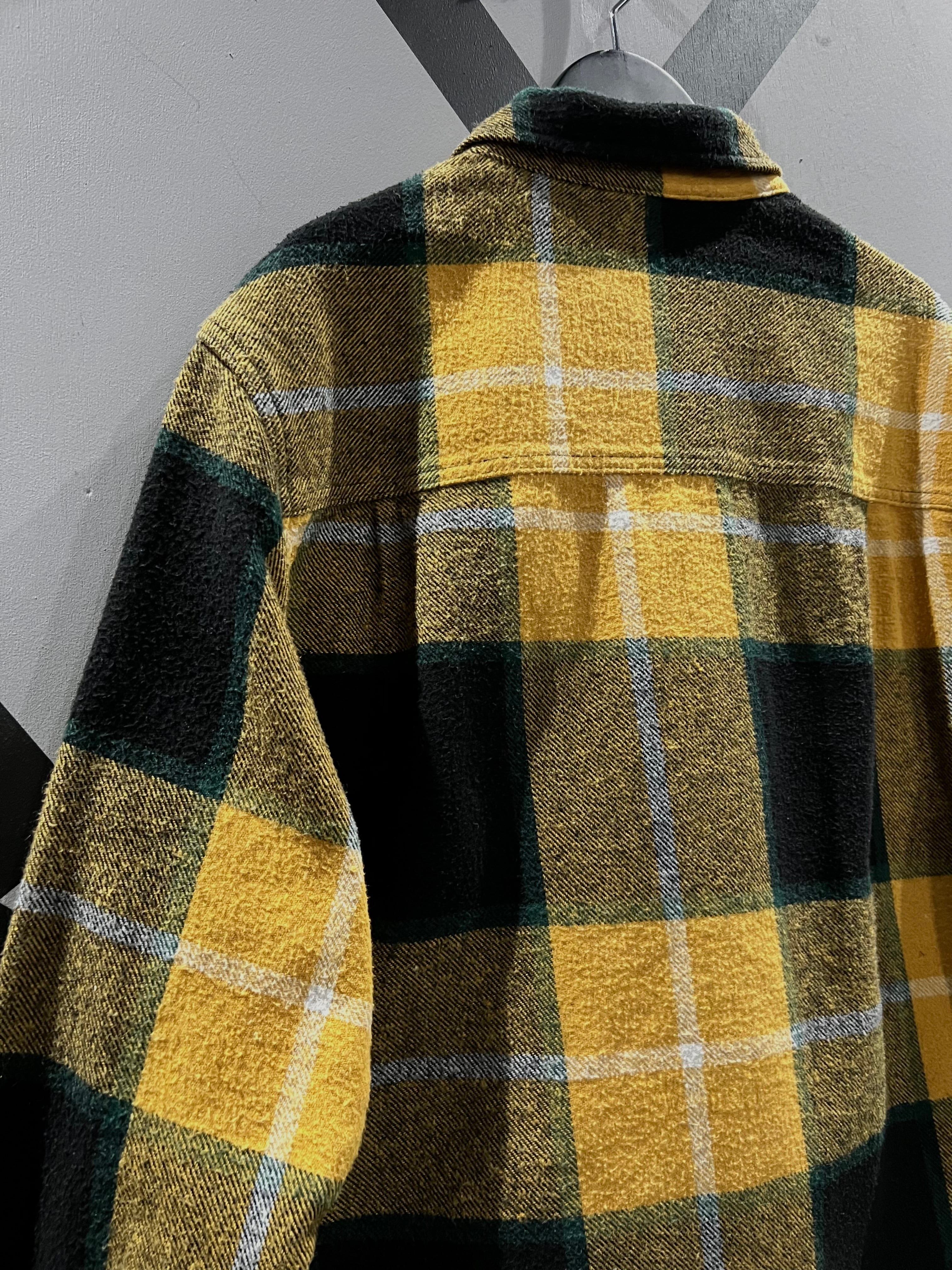 黄×緑×黒×白から成るチェック柄をボディ全面に載せた、ヘビーネルのシャツジャケット。
