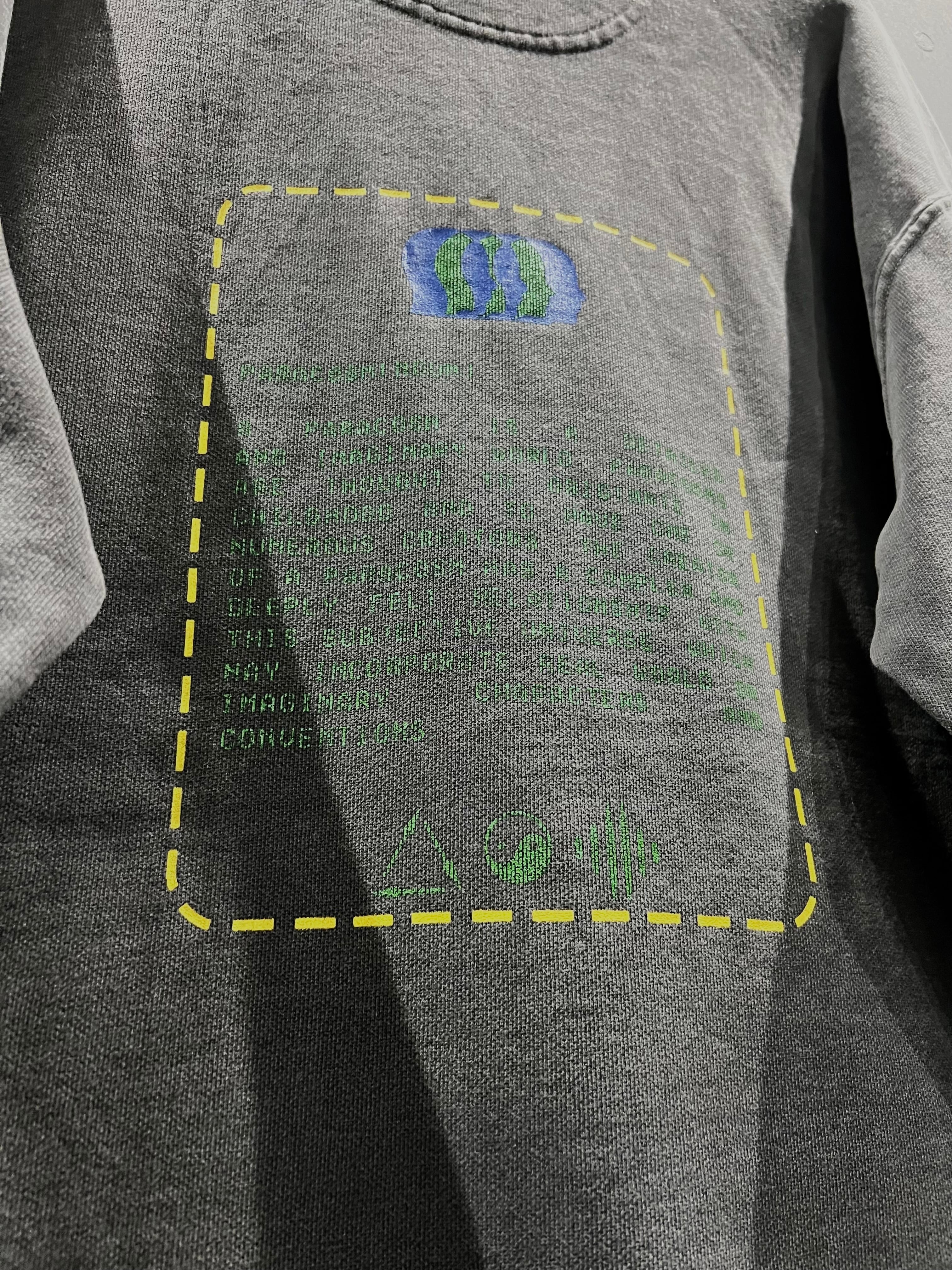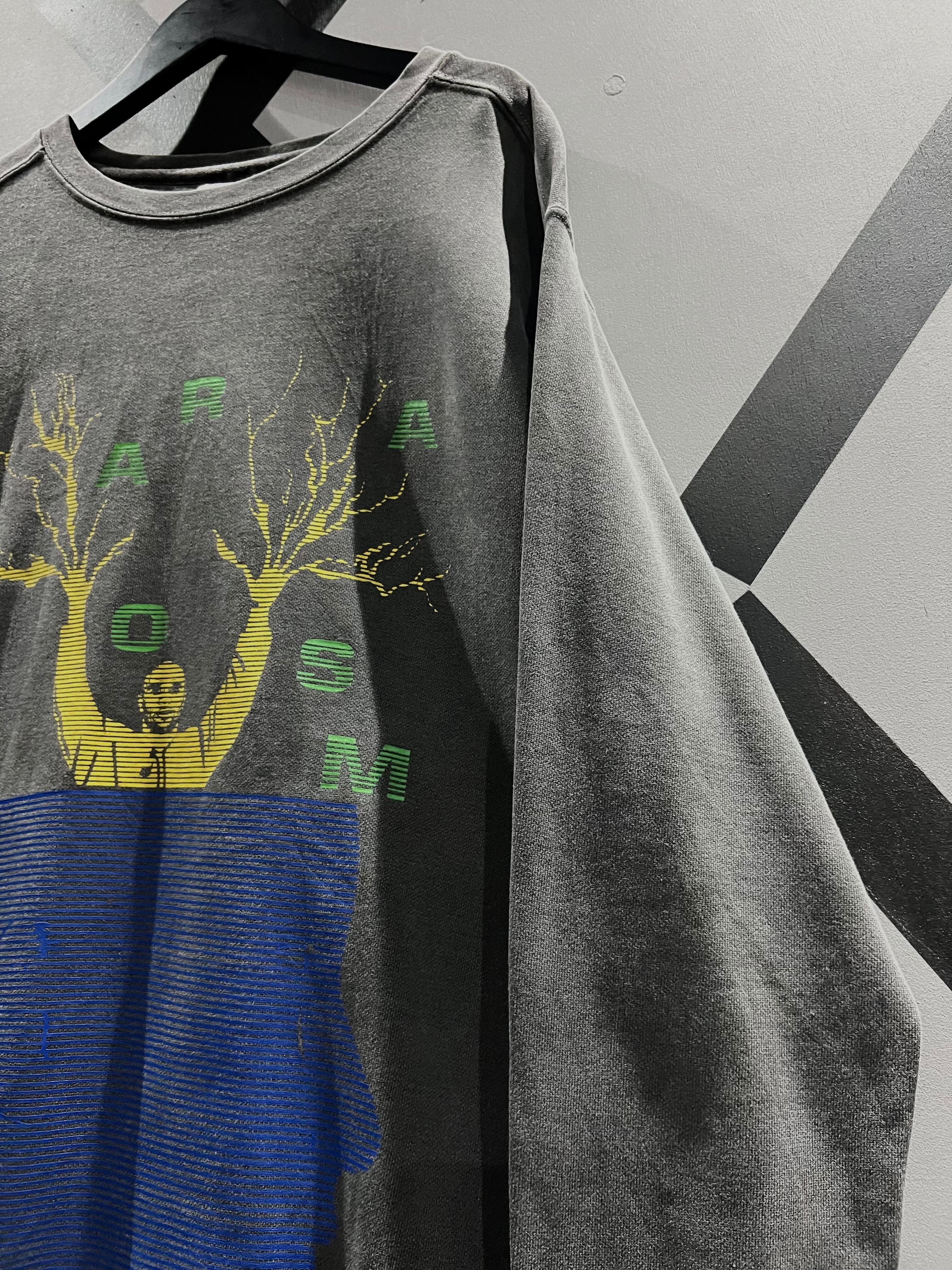 美しいフェードの効いたグレーのボディに、不可解なプリントデザインを載せたプルオーバースウェット。