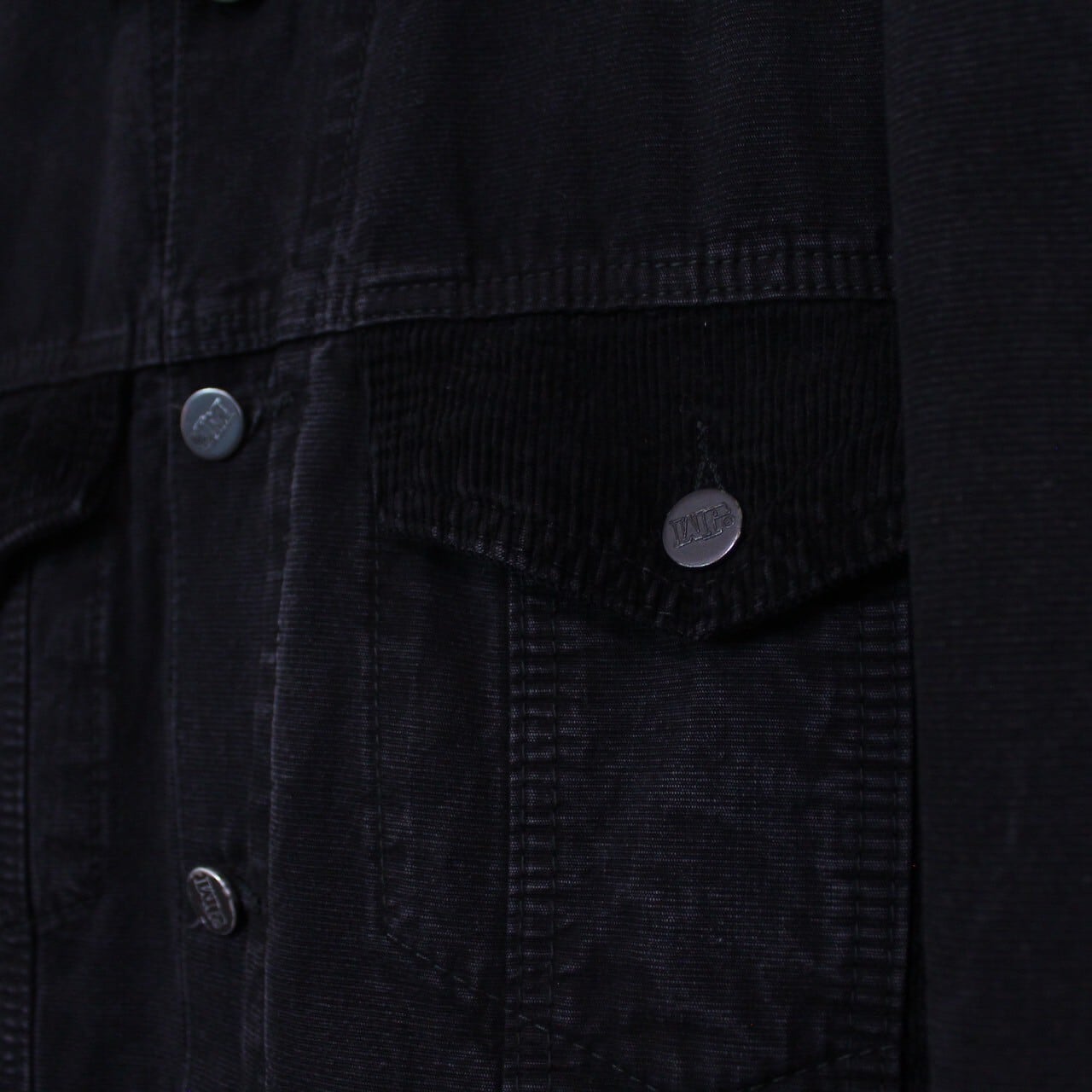 若干のフェード感があるブラックのボディに、太畝のコーデュロイを随所に切り替えたトラッカージャケット。