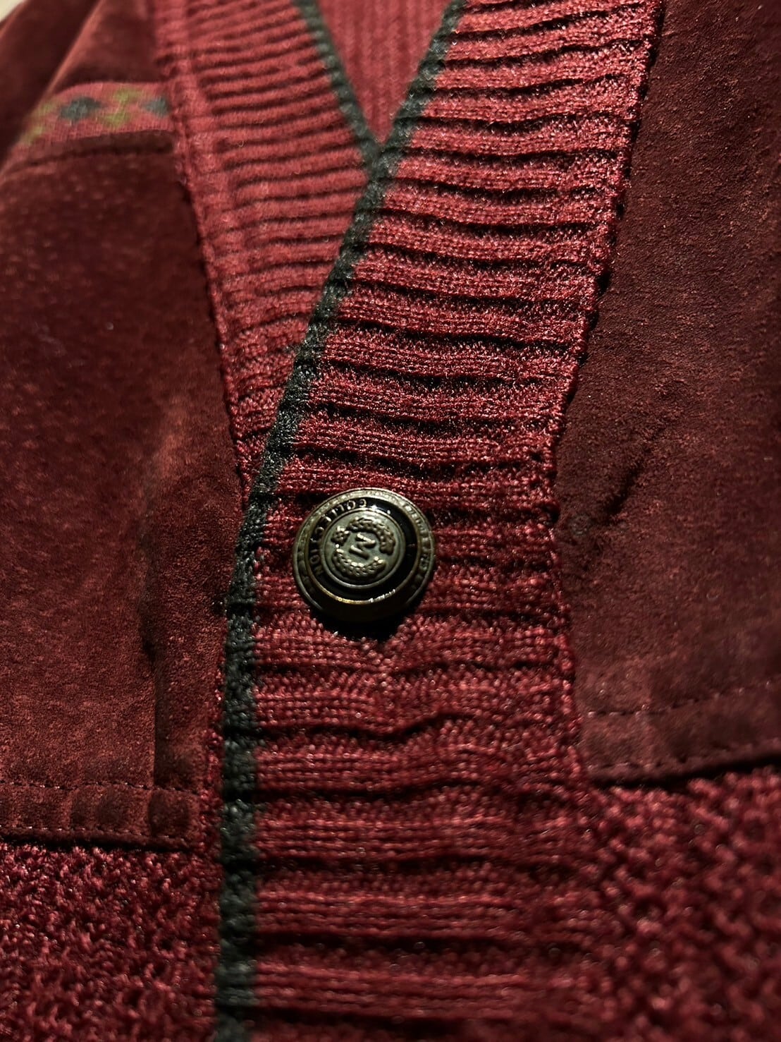 ニットの柔らかな質感と、レザーの掛け合わせがデザインにコントラストを生み出し、オールグリーンの配色ながらも素材間で奥行きを持たせた、デザインバランスにも非常に優れた1着に。装飾が施されたボタン使いも◎