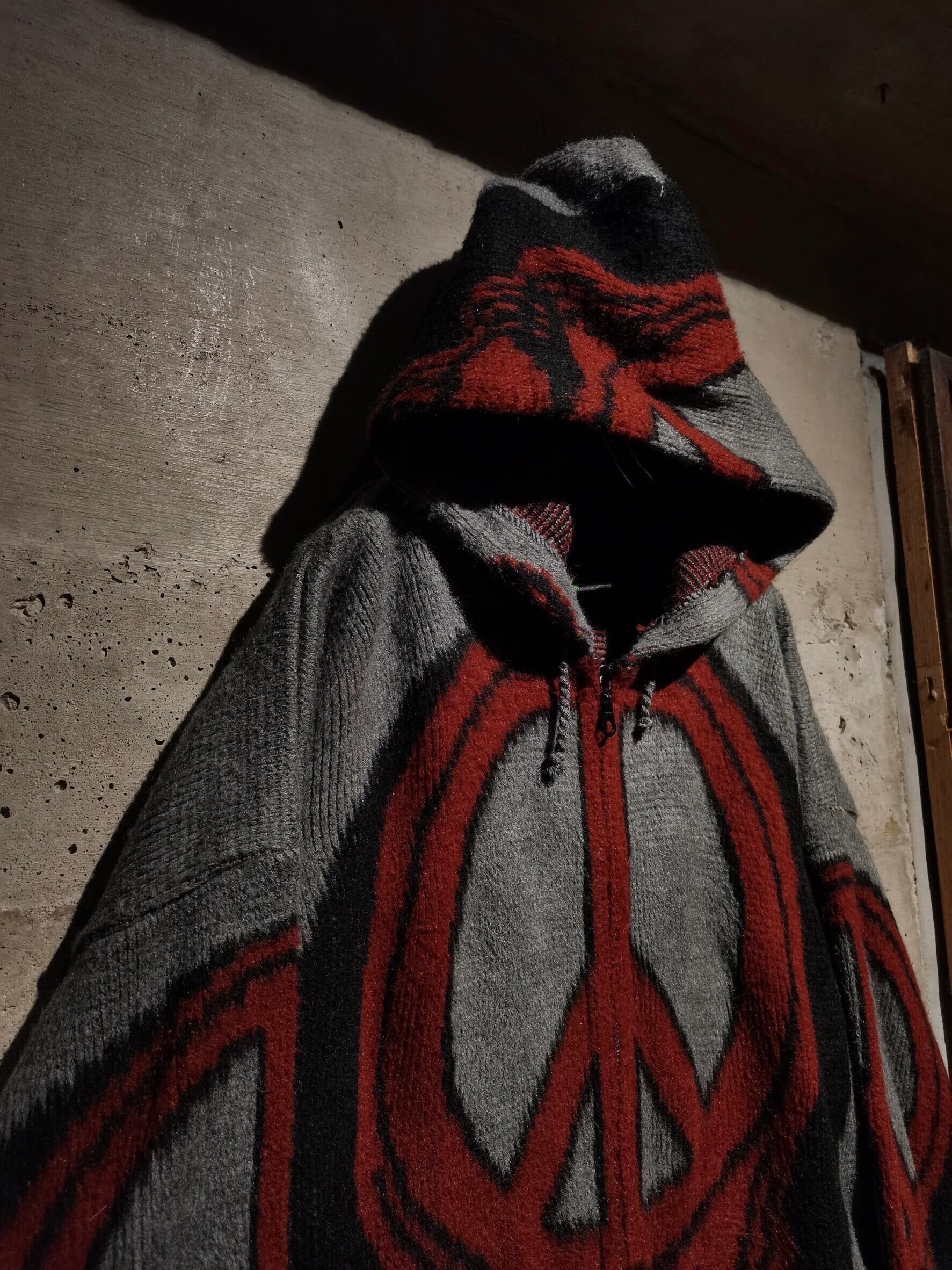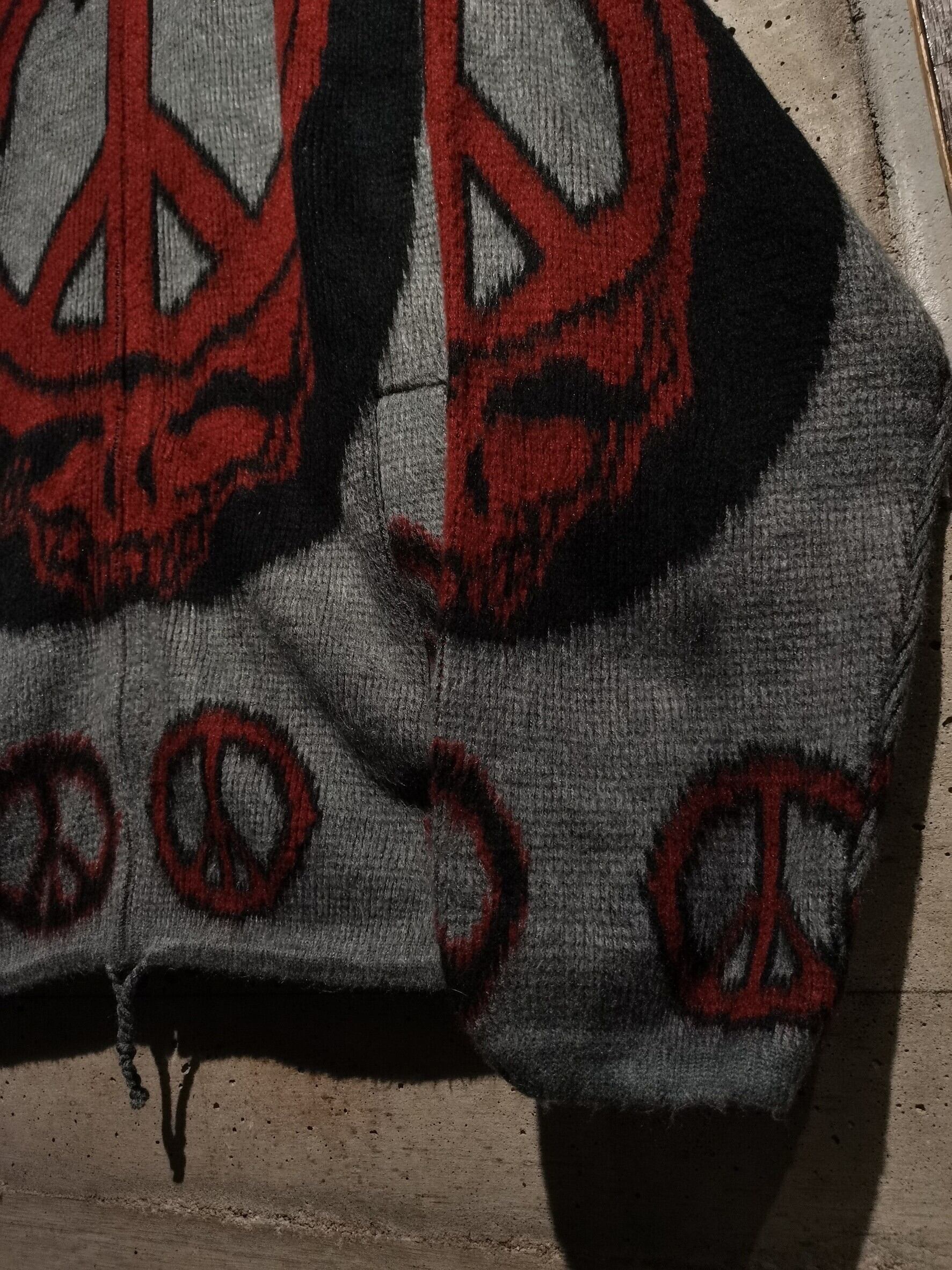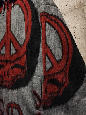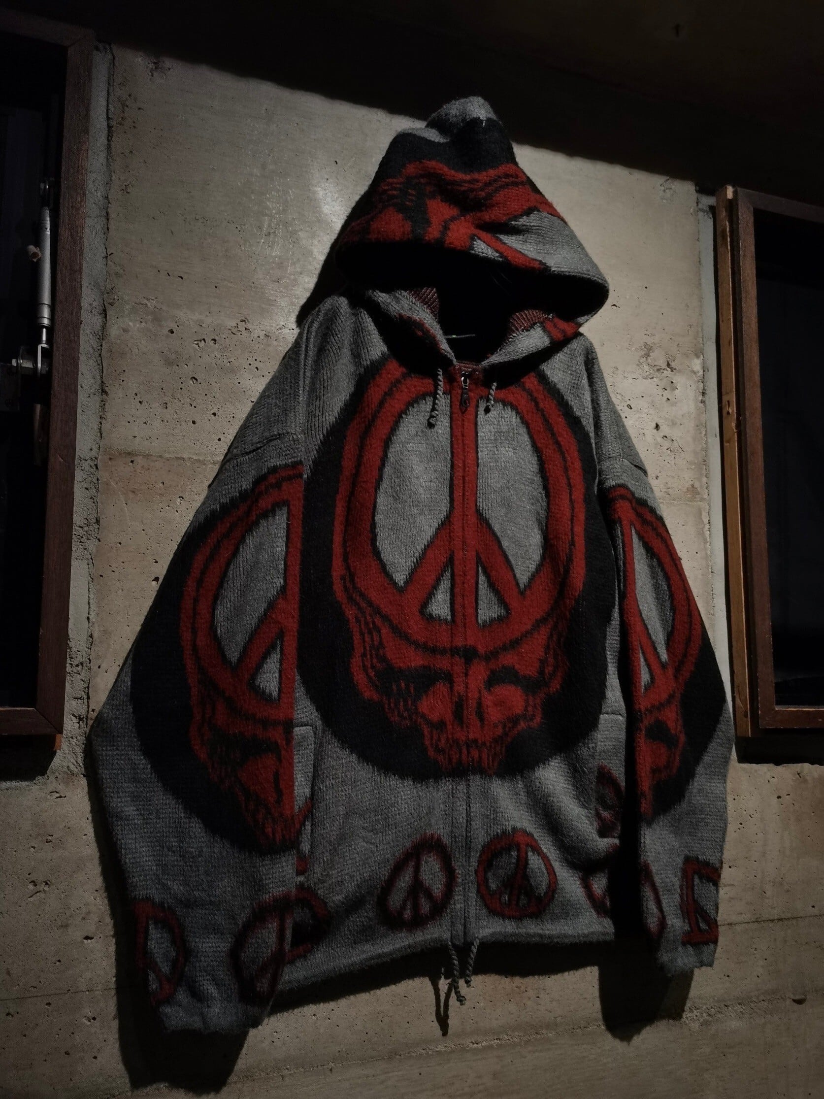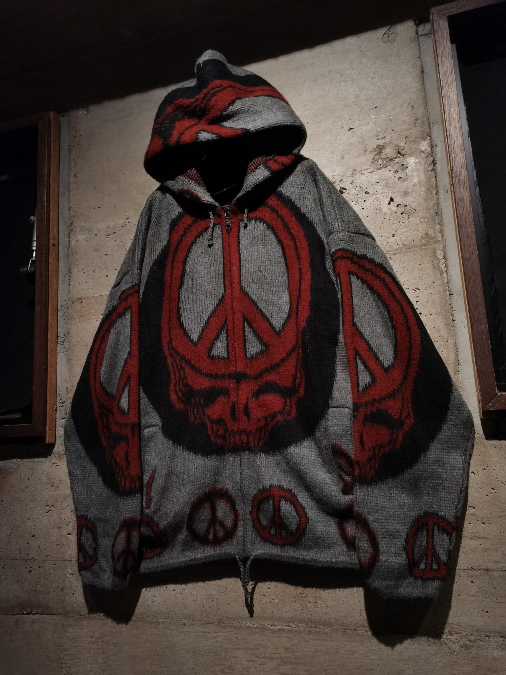グレーをベースとしたフワッと柔らかな質感のボディに、サイケデリックロックバンド"グレイトフル・デッド"でお馴染みのスカルと、ピースマークを掛け合わせたデザインを載せたエクアドルニットフーディー。