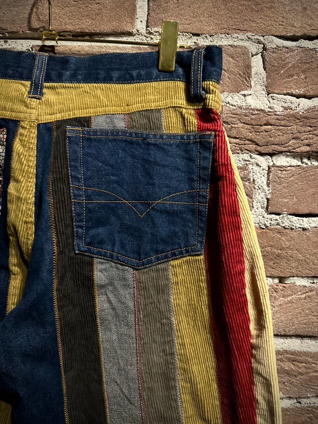 デニムに細畝、太畝の色とりどりのコーデュロイ、そしてフラワーモチーフ等ののテキスタイルを用い、ウエストから裾にかけてストライプ状に切り替えを施したフレアパンツ。
