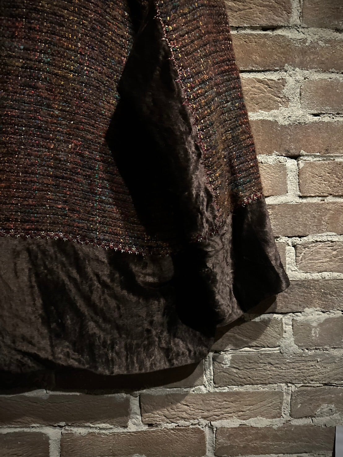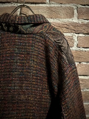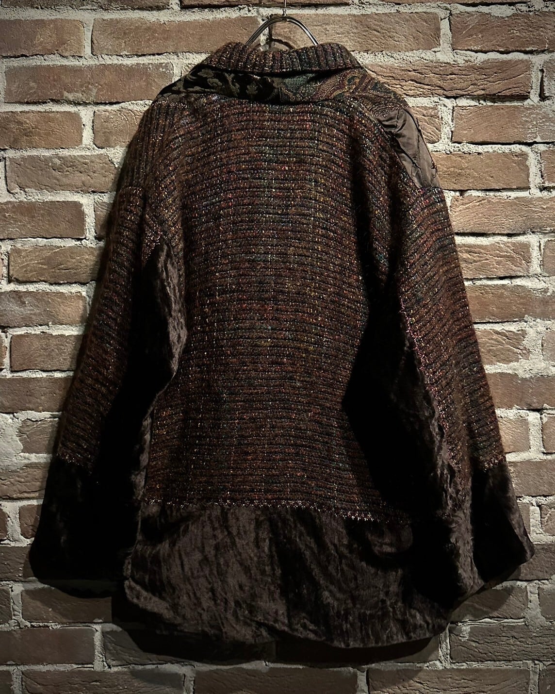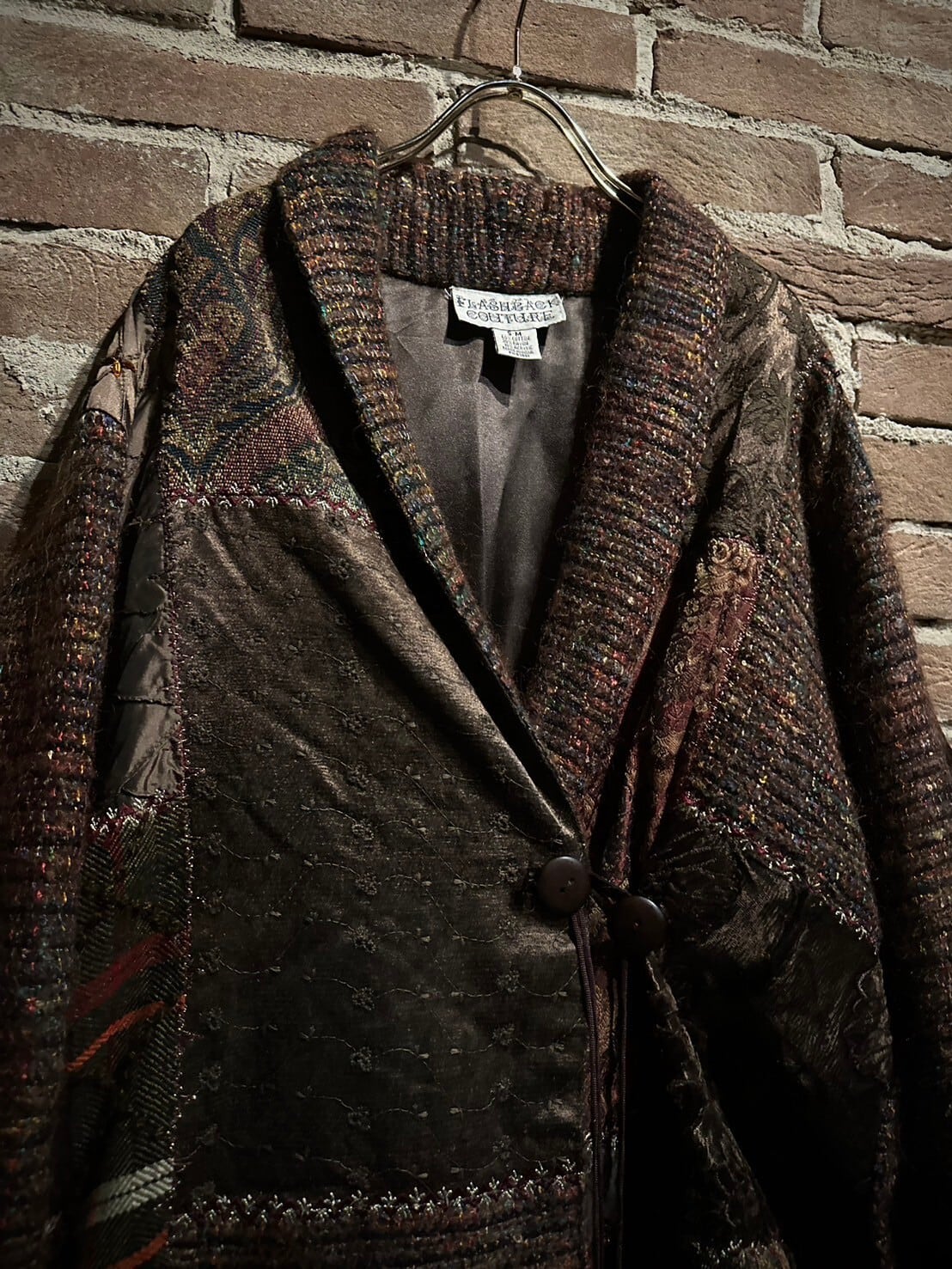ツイード、ヘリンボーンチェック、ジャガード、ゴブラン、ベロア等々、多種多様なテキスタイルが、パッチワークによって巧みに落とし込まれたジャケット。