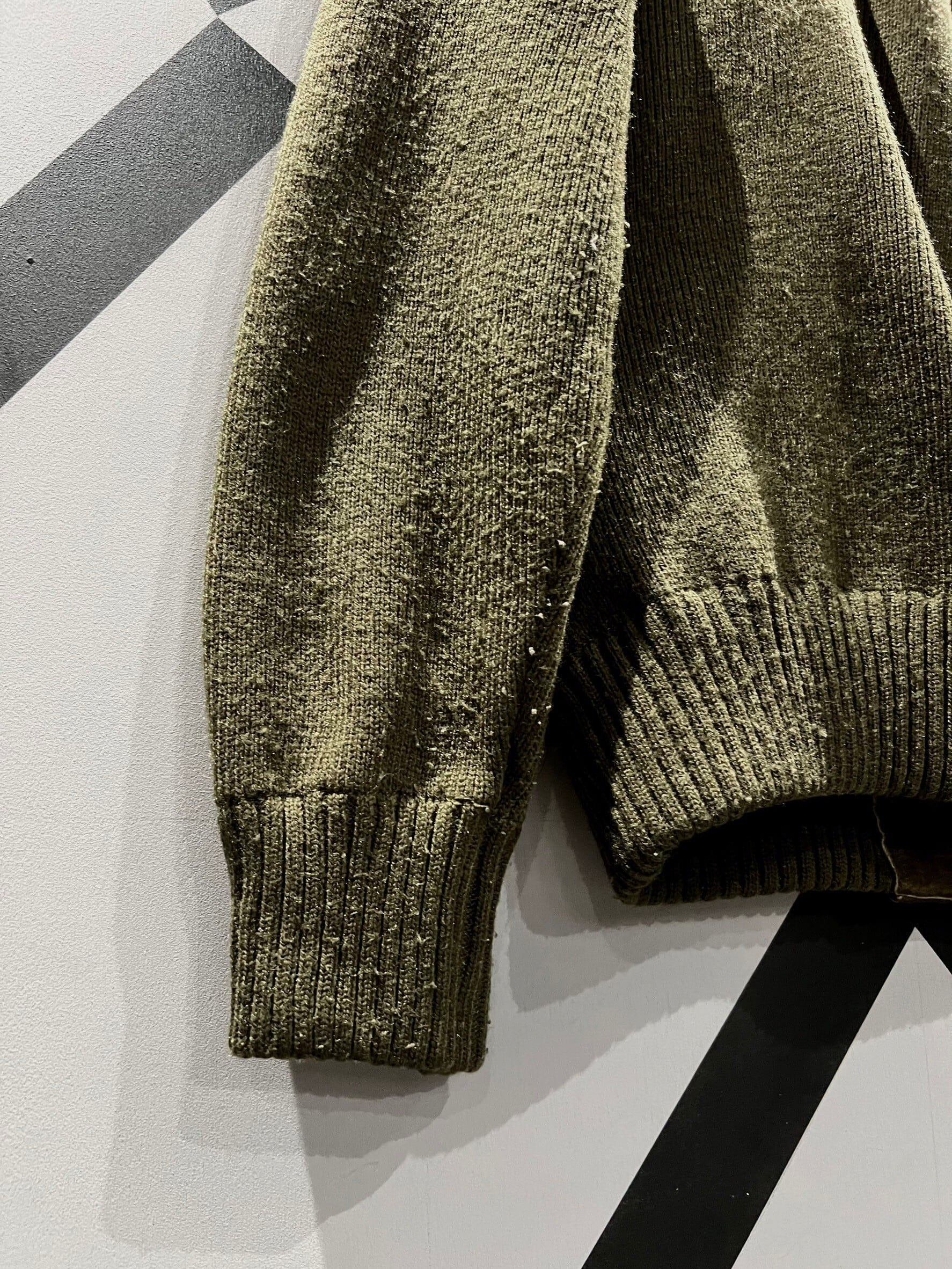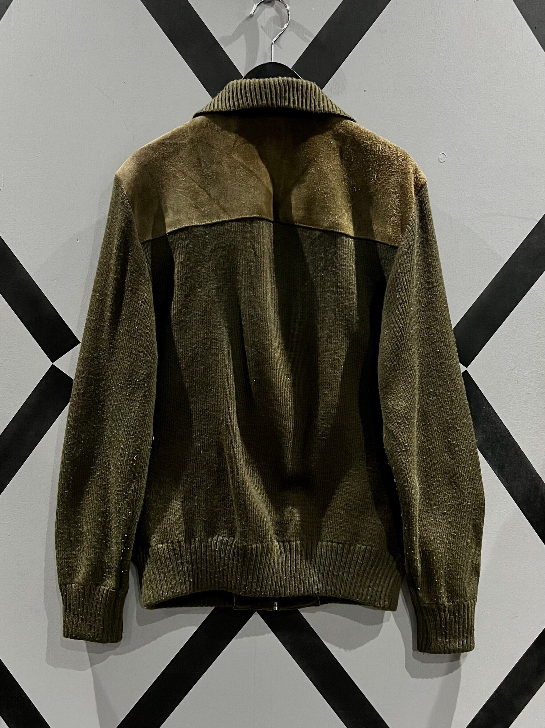 カーキグリーンのニットボディをベースに、フロント、前背面のヨークをハリのある上質なスエードレザーで切り替えた、ジップアップタイプのニットジャケット。