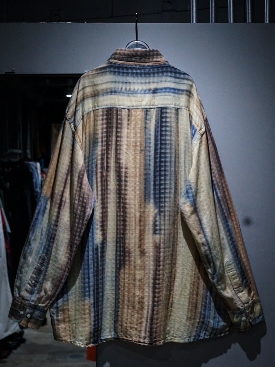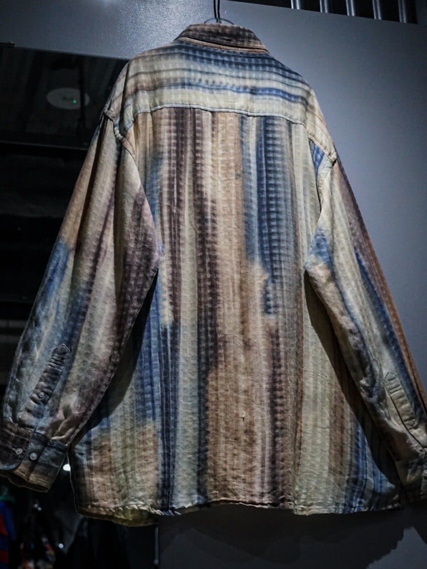 ジャガード織りによるストライプ柄が施されたボディに、ベージュ、ブラウン、ブルーをベースとした美しいグラデーションを載せた長袖シャツ。