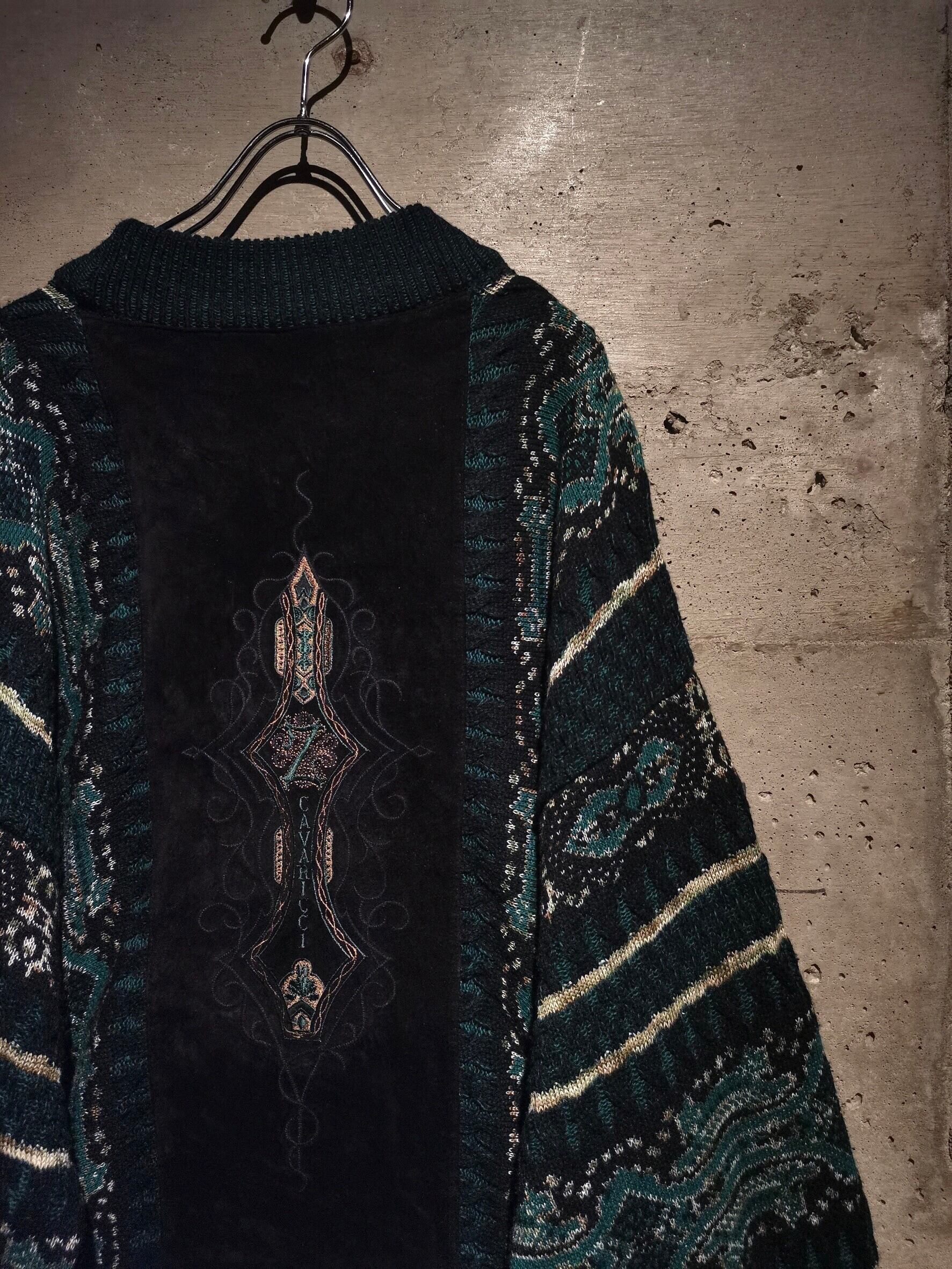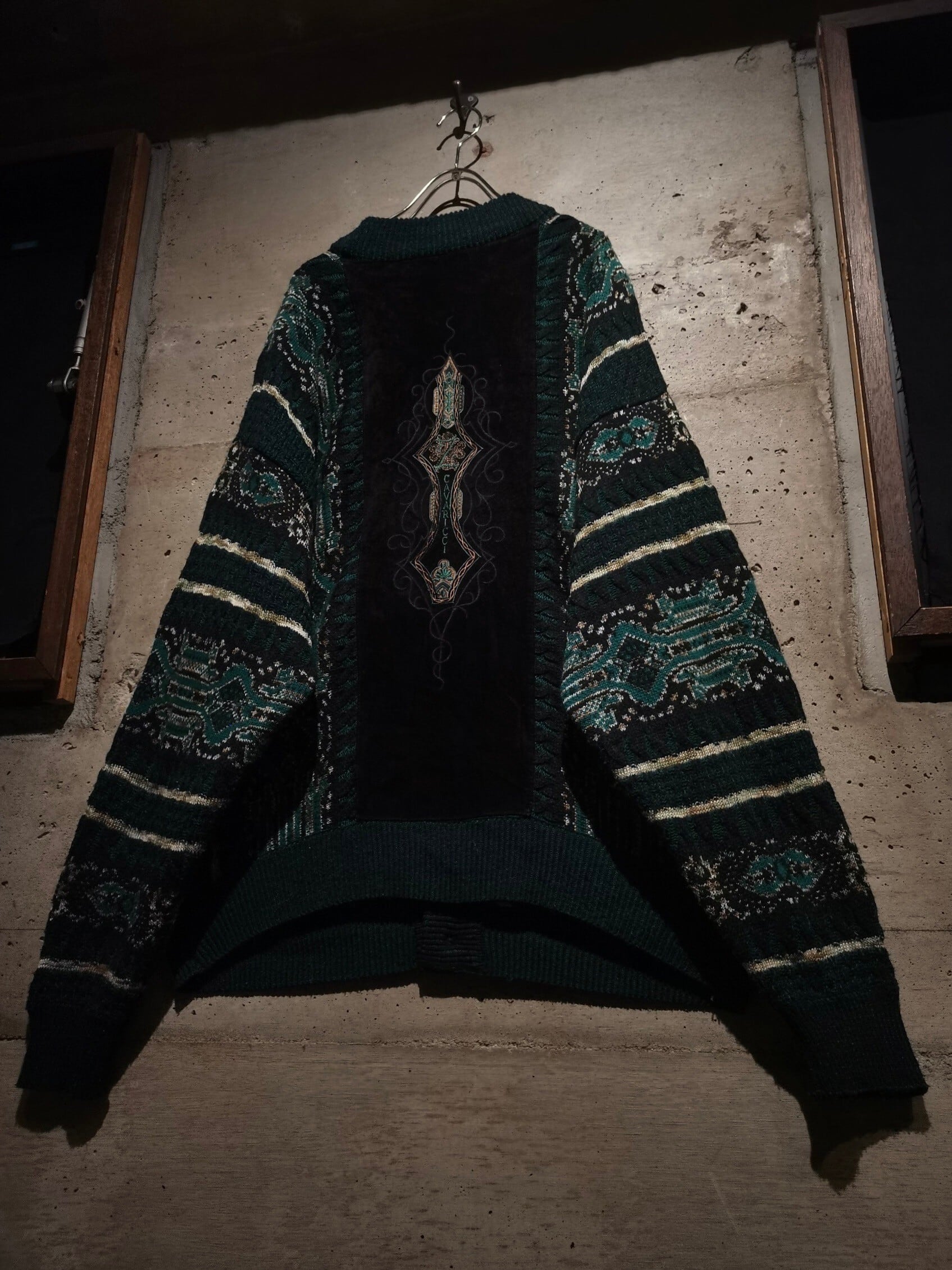 背面中央にはエッジの効いたスエードレザーをON。当店がお送りする“SAXONY”を筆頭にしたレザー×ニットのアイテムですが、こちらのアイテムはレザーの上から更に刺繍を施した非常にクオリティの高い1着に。