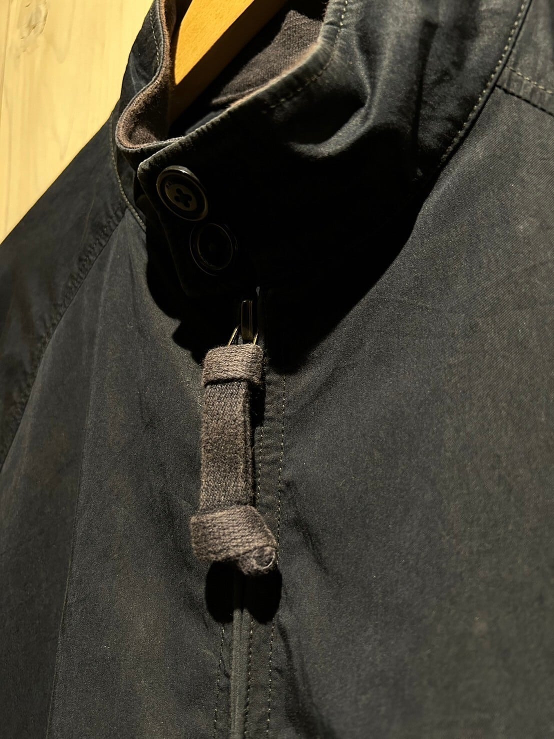 ハリのあるネイビーのボディに、フロントにはフラップポケット、首元にはボタンが備わったスタンドカラーの1着。