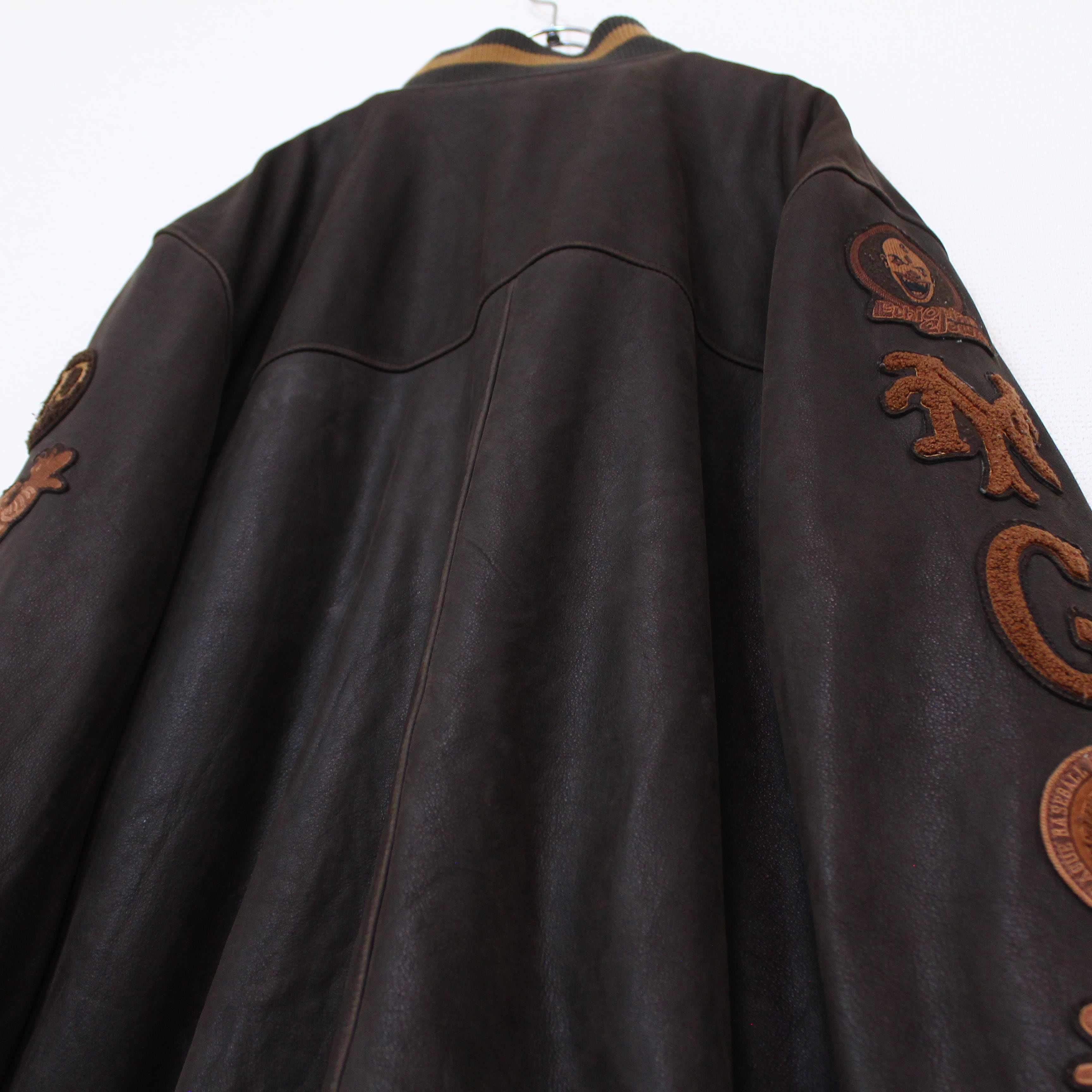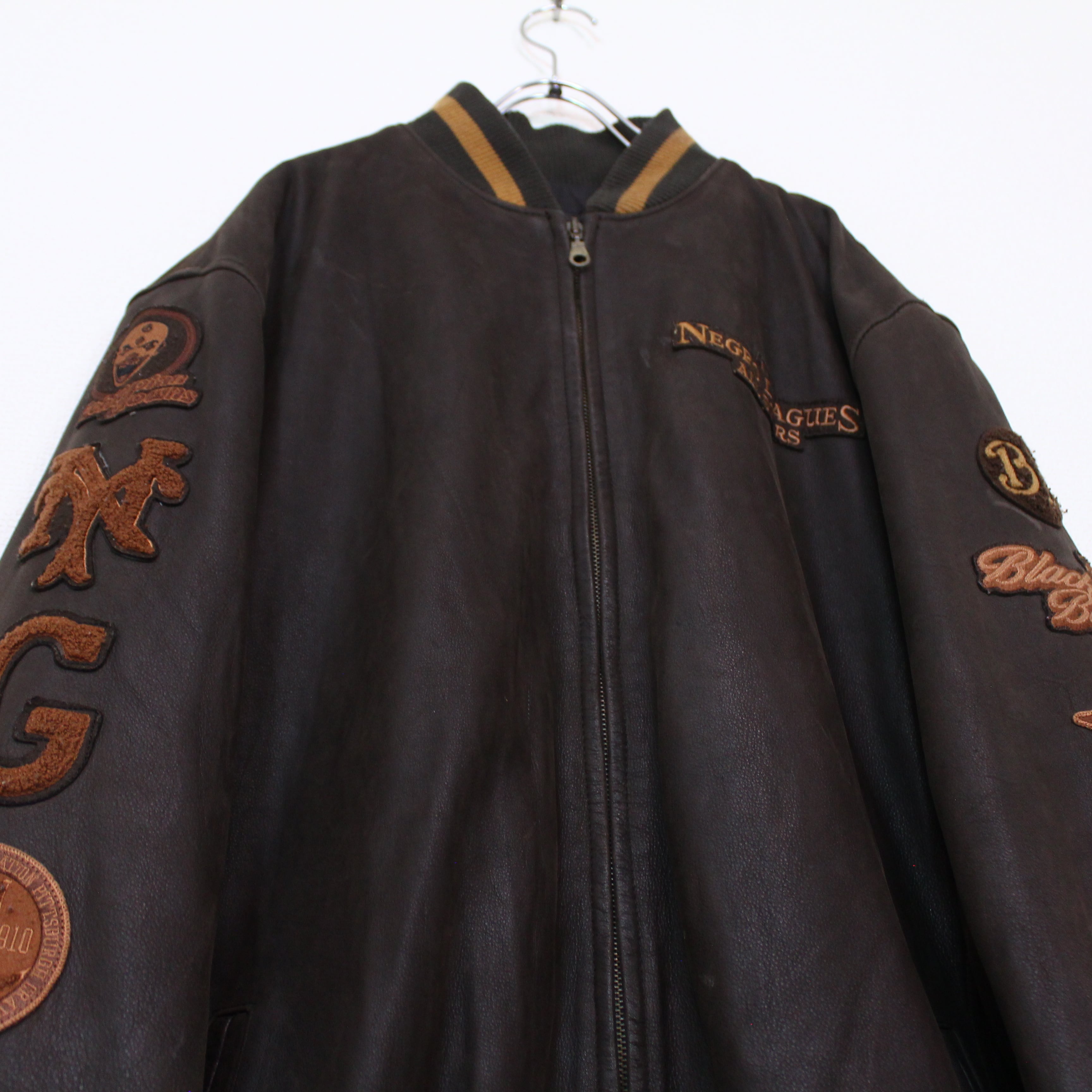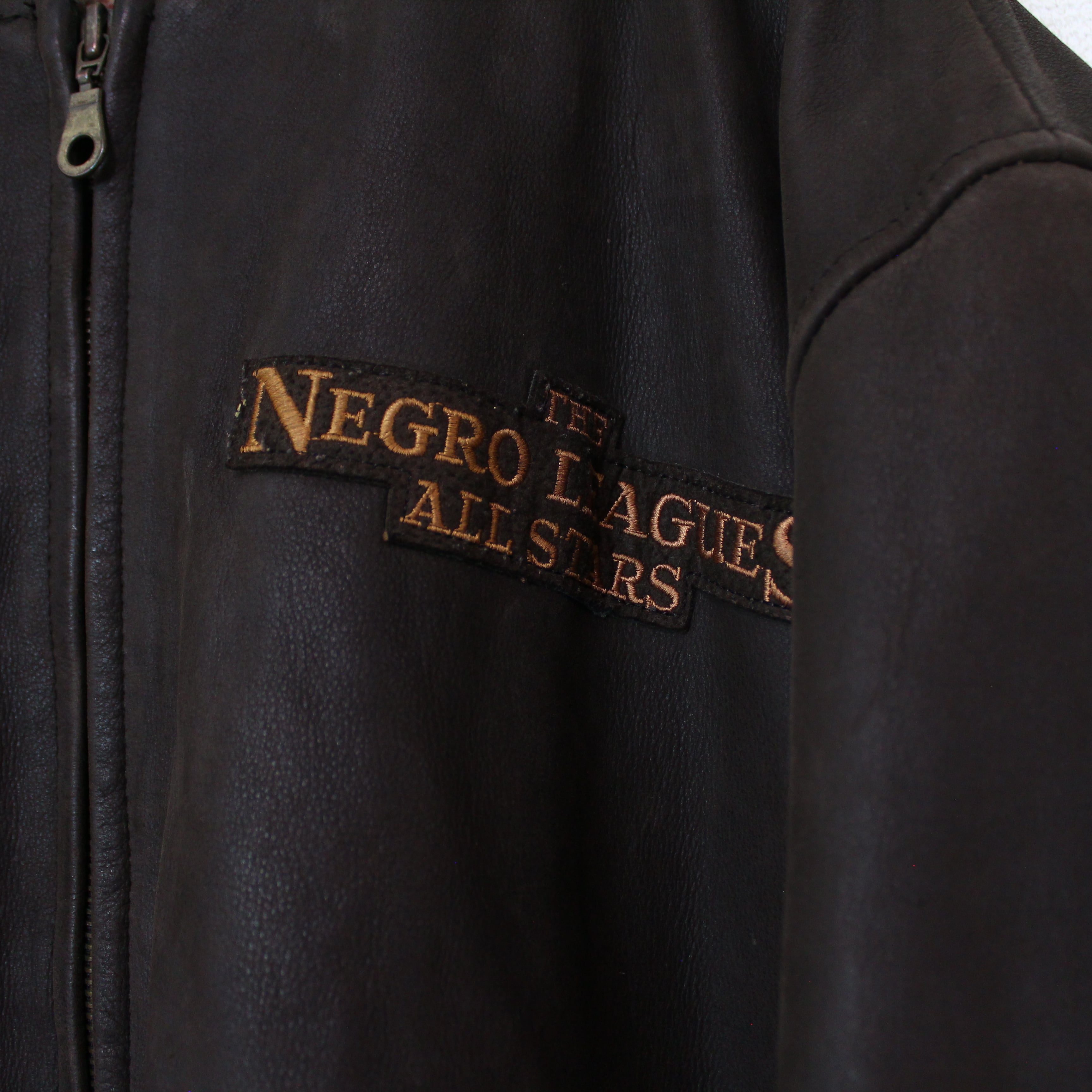 しっとりと滑らかな質感に仕上げられた、上質なブラウンレザーをボディに使用し、左胸、アームにニグロリーグのロゴやチームのエンブレムのパッチを贅沢に載せた、稀少なボンバージャケット型の1着。