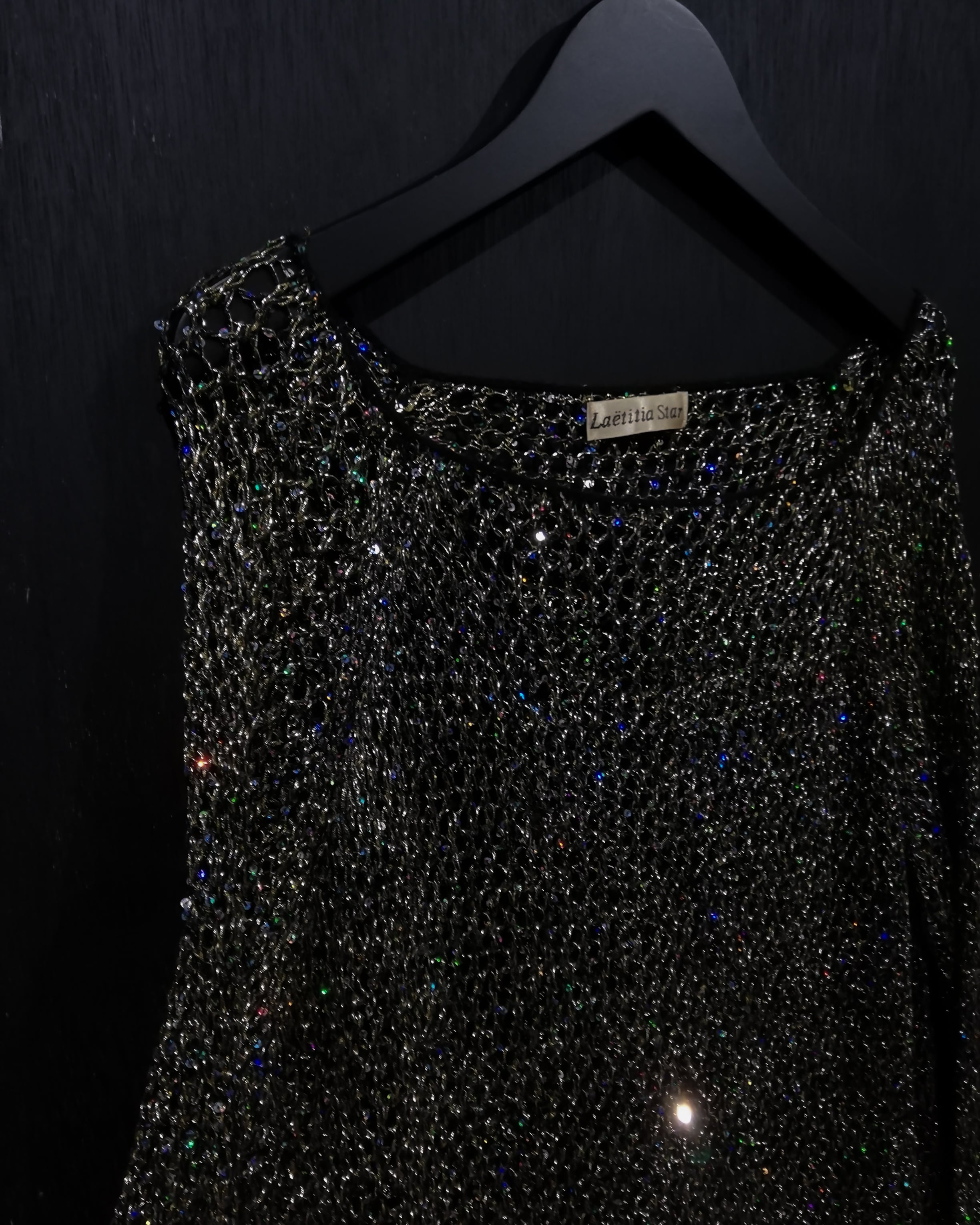 ブラック×ゴールドのラメ糸を使用し、全体にスパンコールを編み込んだ、ラグジュアルな輝きを放つメッシュニット。