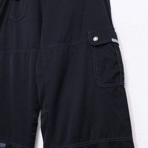 ボディの随所に施された水色のステッチがアクセントになり、立体感を演出。裾にはジップが施され、レイヴならではの特徴的なワイドシルエットを更に引き立ててくれます。
