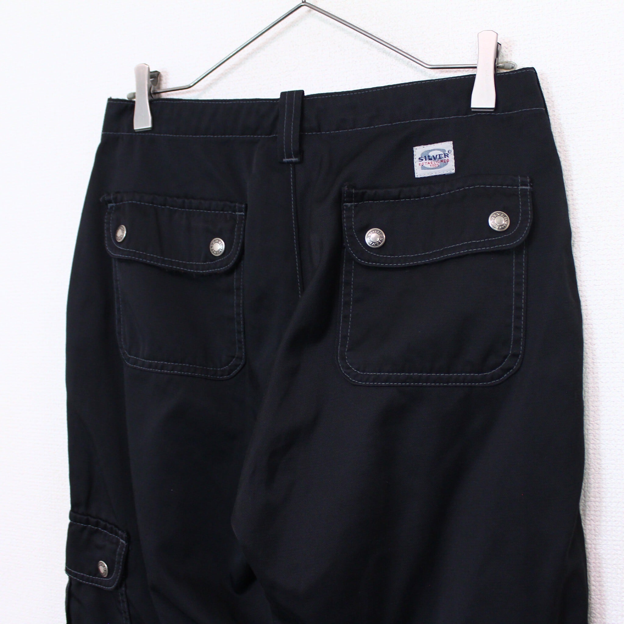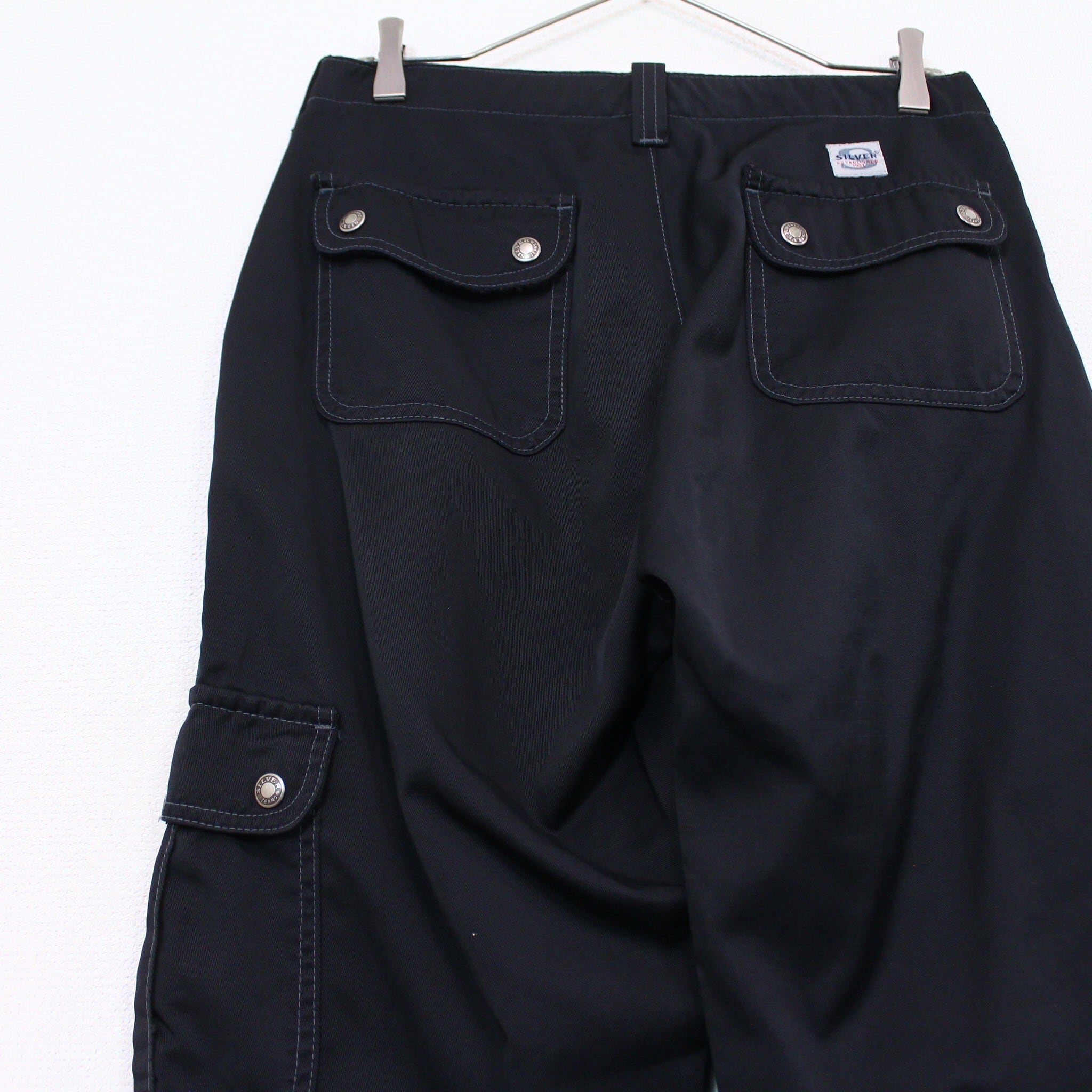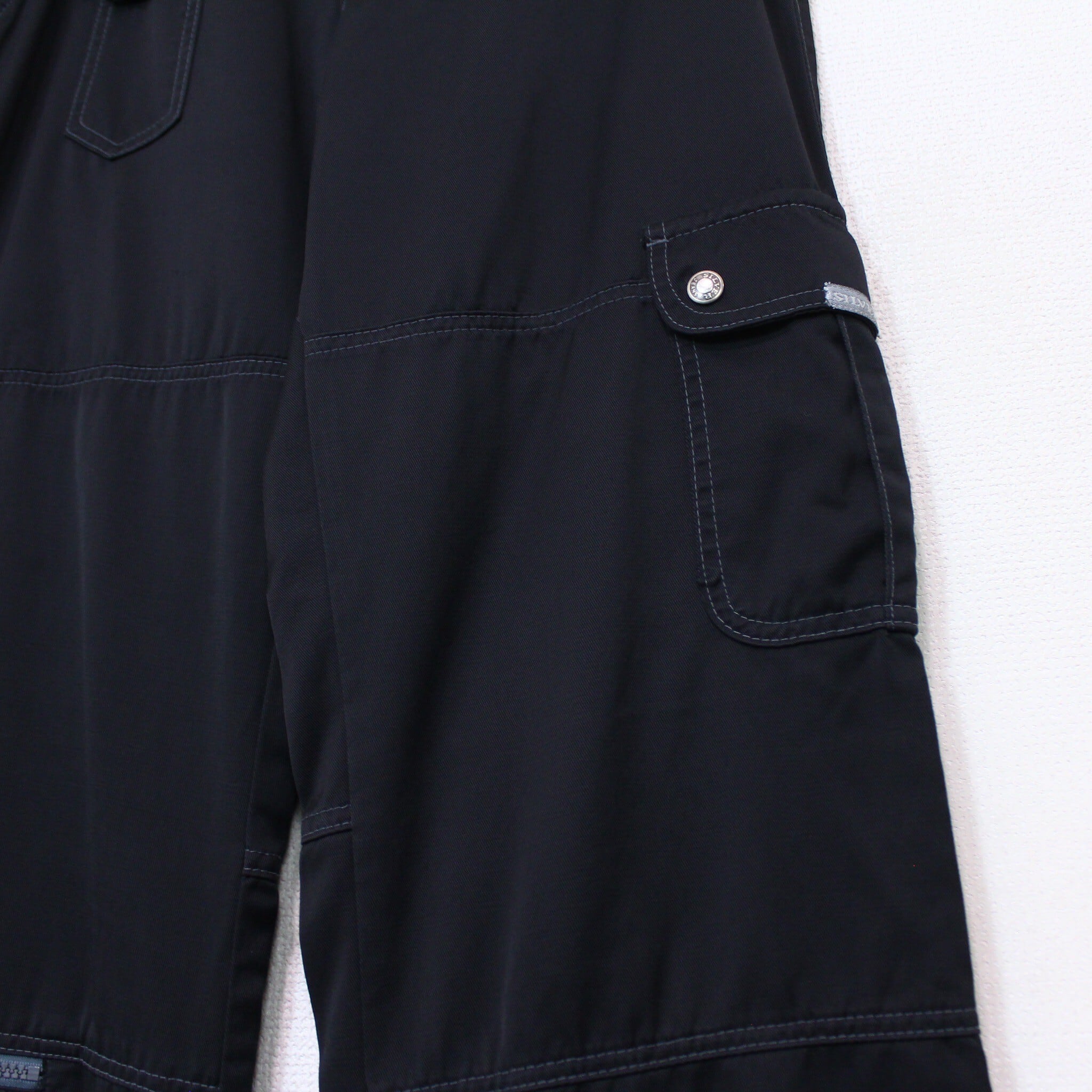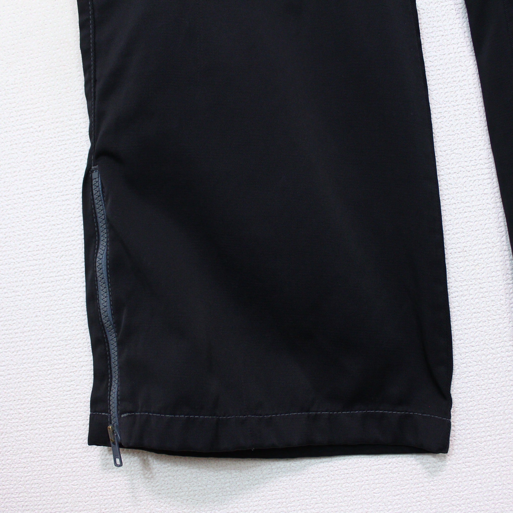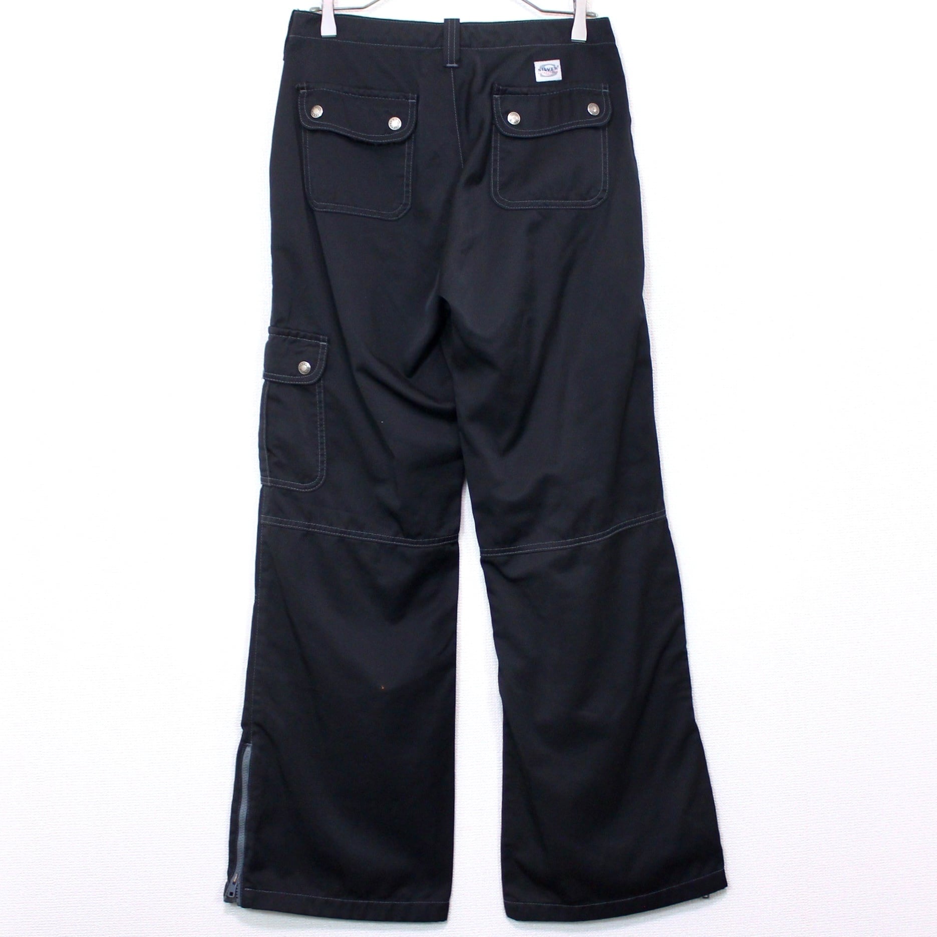 タフかつコシのあるブラックのボディに、フラップポケットのギミック、ジップポケットのギミックを載せた、ワイドストレートレイヴパンツ。